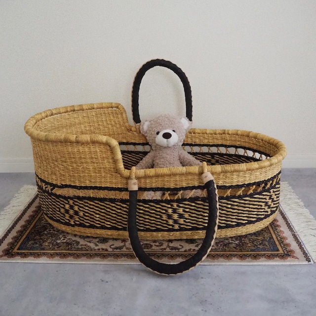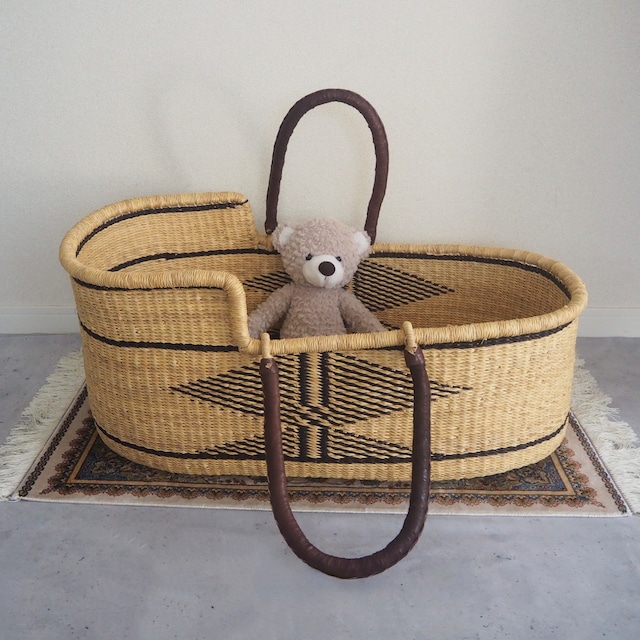 底にブラックで綺麗な模様が入ったデザインです。 パッドを敷くと、無地のクーファンのようにシンプルにご使用いただけます。 カゴ部分はエレファントグラス、ハンドルは羊の革から出来ています。ガーナの職人が数日かけて、心を込めて作っています。ハンドルはブラックのレザーを使用しています。 ◆ハンドルの仕様 リング方式(外側に折り畳み可能) ◆SIZEについて 縦75cm × 横42cm× 高さ(低い部分) 21cm (高い部分) 28cm ※ガーナの職人による手作りのため、数cmの誤差がある可能性がございます。 ◆お手入れ方法について 郵送時に歪みが発生し形を整えたい場合や使用時の汚れを落としたい場合は、以下の手順でお手入れください。 ①シャワーや霧吹き等で気になる箇所を充分に濡らして下さい。 ②内側からトントンと叩きながら、形を整えてください。 ③風通しの良い場所で乾かしてください。 ◆マットレス、スタンドについて スタンド、クーファンパッドは別売りです。webshop上で在庫がない場合も、ご用意可能な場合がございますので、DMまでご連絡ください。 クーファンパッドの代わりに抱っこ布団等を敷いてご使用いただくことも可能です。 ◆注意点 ※ ハンドルのレザーに擦れがある場合がございます。あらかじめご了承ください。 ※ 商品の性質上、ささくれがある場合がございます。周りをタオル等で覆っていただくか、別売りのクーファンカバーをご使用ください。 ◆カスタマイズについて 他の色やデザインも受注製作で承ることが可能です。詳細はトップページの下部「受注制作について」をご覧ください。 ★2万円以上のお買い上げで送料無料★