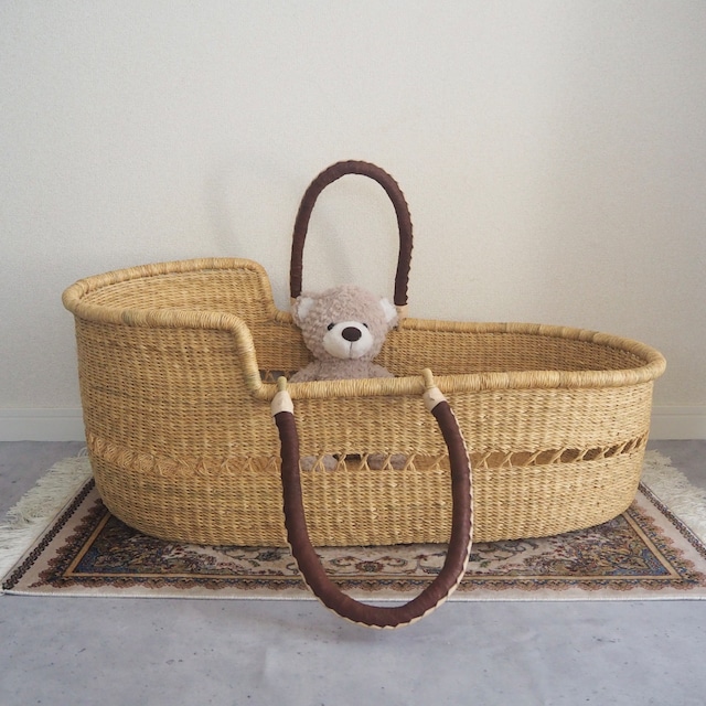 シンプルな無地のクーファンです。カゴ部分はエレファントグラス、ハンドルは羊の革から出来ています。ガーナの職人が数日かけて、心を込めて作っています。ハンドルはブラウンのレザーを使用しています。 ◆ハンドルの仕様 リング方式(外側に折り畳み可能) ◆SIZEについて 縦75cm × 横42cm× 高さ(低い部分) 21cm (高い部分) 28cm ※ガーナの職人による手作りのため、数cmの誤差がある可能性がございます。 ◆お手入れ方法について 郵送時に歪みが発生し形を整えたい場合や使用時の汚れを落としたい場合は、以下の手順でお手入れください。 ①シャワーや霧吹き等で気になる箇所を充分に濡らして下さい。 ②内側からトントンと叩きながら、形を整えてください。 ③風通しの良い場所で乾かしてください。 ◆マットレス、スタンドについて スタンド、クーファンパッドは別売りです。webshop上で在庫がない場合も、ご用意可能な場合がございますので、DMまでご連絡ください。 クーファンパッドの代わりに抱っこ布団等を敷いてご使用いただくことも可能です。 ◆注意点 ※ ハンドルのレザーに擦れがある場合がございます。あらかじめご了承ください。 ※ 商品の性質上、ささくれがある場合がございます。周りをタオル等で覆っていただくか、別売りのクーファンカバーをご使用ください。 ◆カスタマイズについて 他の色やデザインも受注製作で承ることが可能です。詳細はトップページの下部「受注制作について」をご覧ください。 ★2万円以上のお買い上げで送料無料★