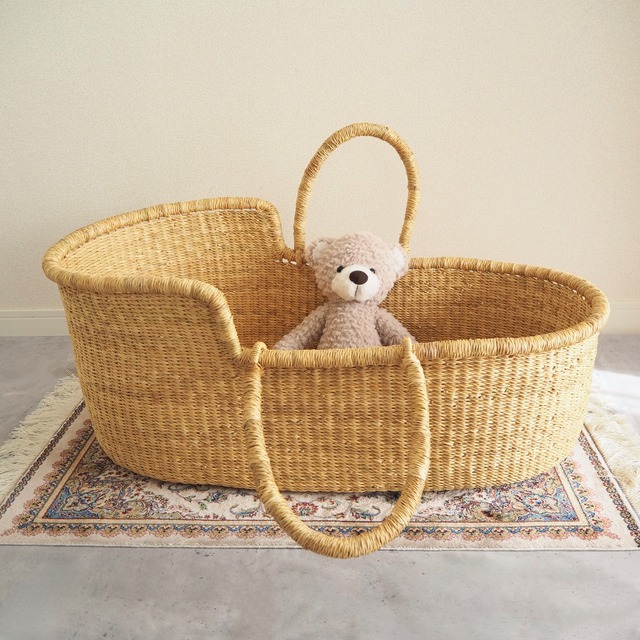 綺麗なアースカラーを使ったデザインです。色々な編み方で編まれていますので、是非アップのお写真をご覧ください。 カゴ部分はエレファントグラス、ハンドルは羊の革から出来ています。ガーナの職人が数日かけて、心を込めて作っています。ハンドルはブラウン×クリームのレザーを使用しています。 ◆ハンドルの仕様 リング方式(外側に折り畳み可能) ◆SIZEについて 縦75cm × 横42cm× 高さ(低い部分) 21cm (高い部分) 28cm ※ガーナの職人による手作りのため、数cmの誤差がある可能性がございます。 ◆お手入れ方法について 郵送時に歪みが発生し形を整えたい場合や使用時の汚れを落としたい場合は、以下の手順でお手入れください。 ①シャワーや霧吹き等で気になる箇所を充分に濡らして下さい。 ②内側からトントンと叩きながら、形を整えてください。 ③風通しの良い場所で乾かしてください。 ◆マットレス、スタンドについて スタンド、クーファンパッドは別売りです。webshop上で在庫がない場合も、ご用意可能な場合がございますので、DMまでご連絡ください。 クーファンパッドの代わりに抱っこ布団等を敷いてご使用いただくことも可能です。 ◆注意点 ※ ハンドルのレザーに擦れがある場合がございます。あらかじめご了承ください。 ※ 商品の性質上、ささくれがある場合がございます。周りをタオル等で覆っていただくか、別売りのクーファンカバーをご使用ください。 ◆カスタマイズについて 他の色やデザインも受注製作で承ることが可能です。詳細はトップページの下部「受注制作について」をご覧ください。 ★2万円以上のお買い上げで送料無料★