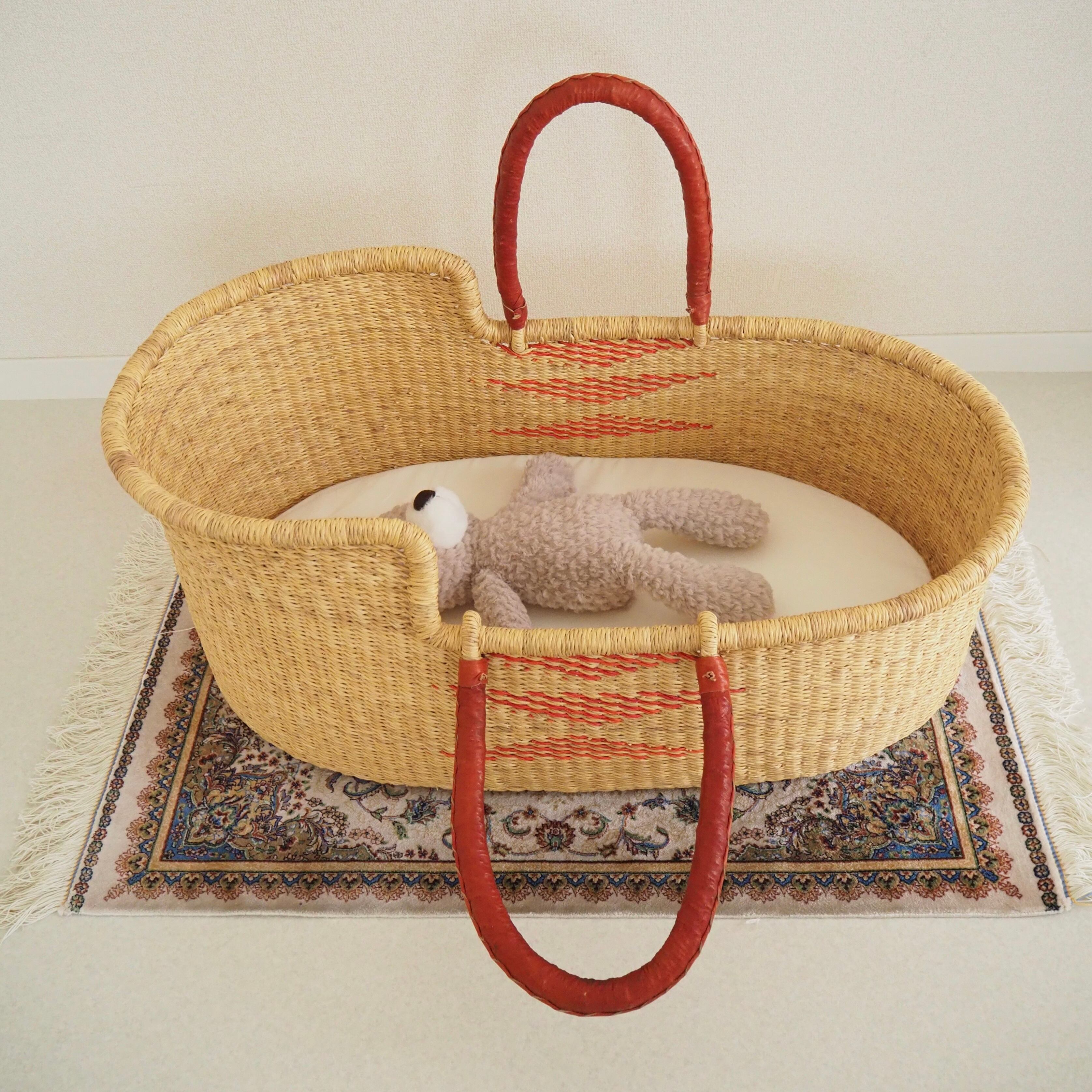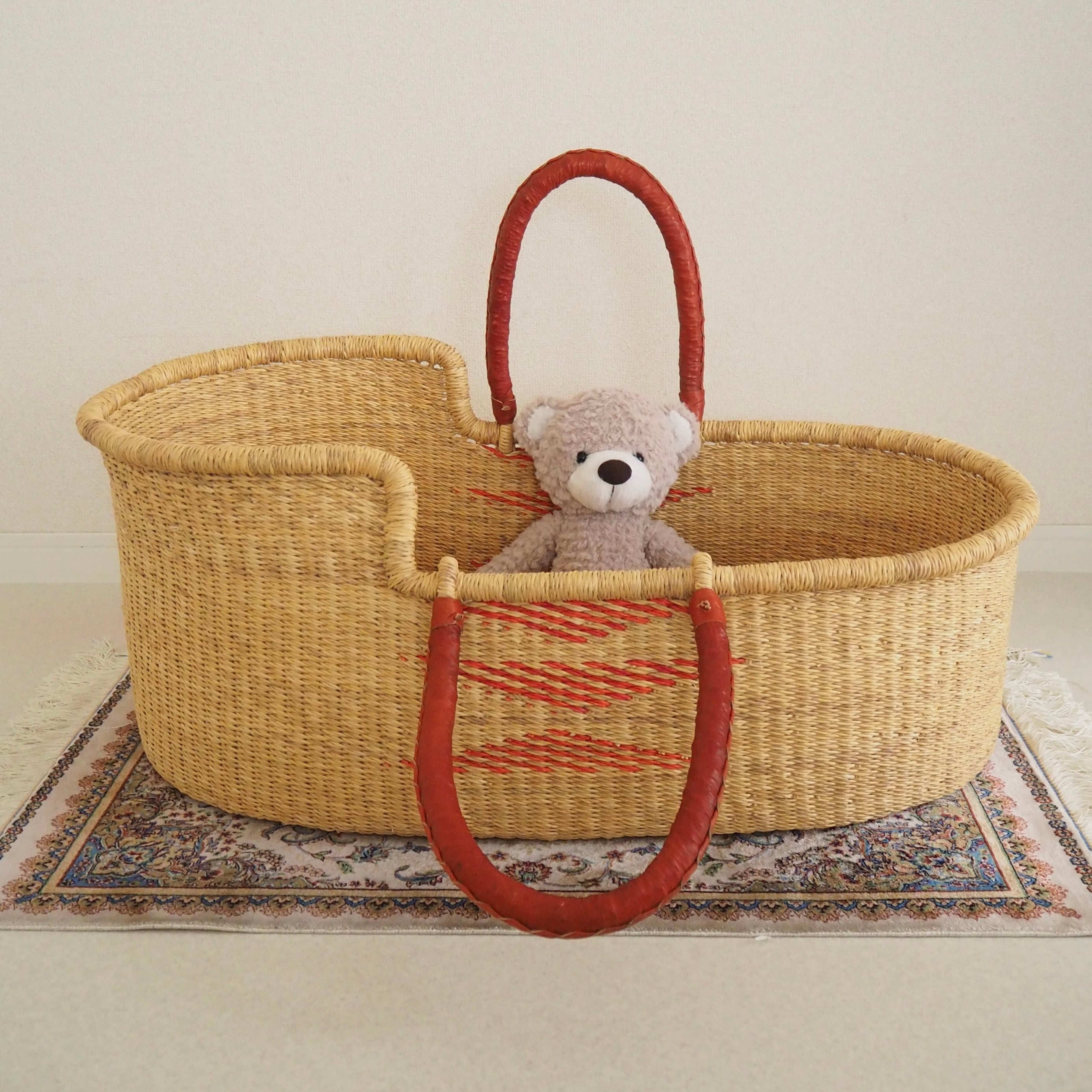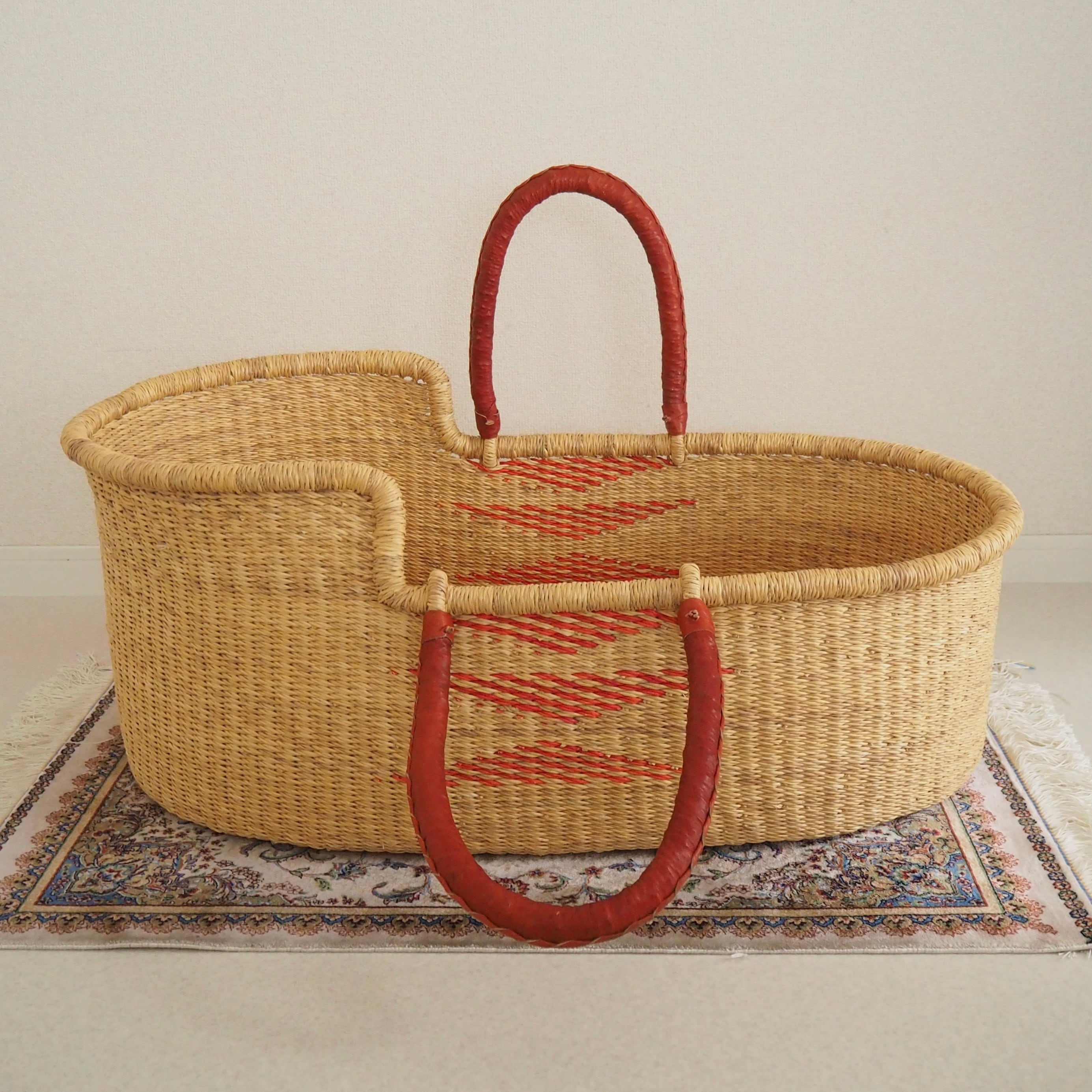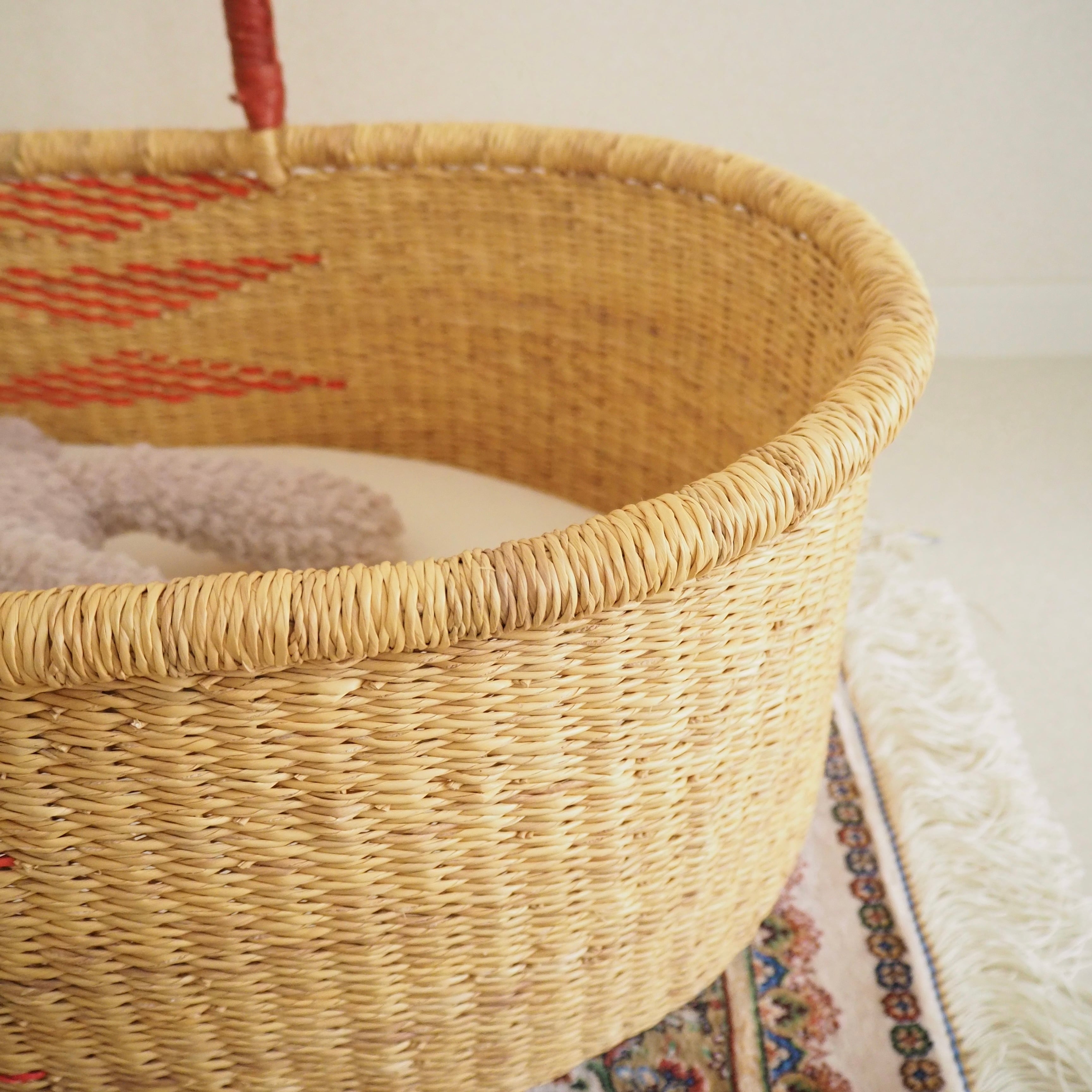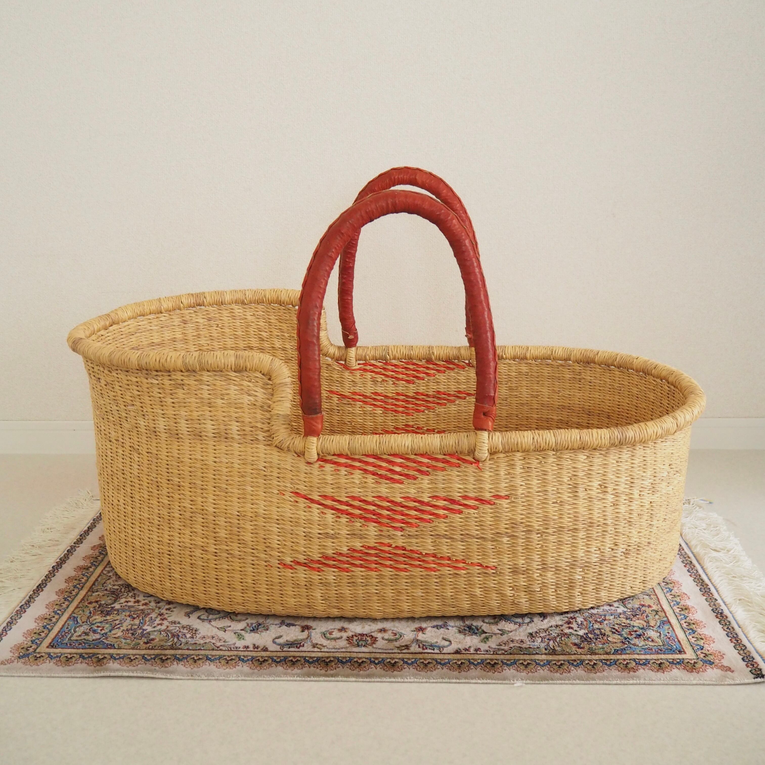 レッドのトライアングル柄が編み込まれたシンプルで遊び心のあるデザインです。カゴ部分はエレファントグラス、ハンドルは羊の革から出来ています。ガーナの職人が数日かけて、心を込めて作っています。ハンドルはブラウンレッドのレザーを使用しています。