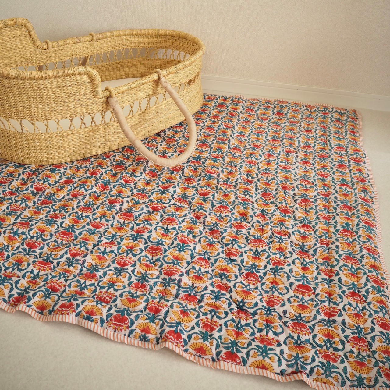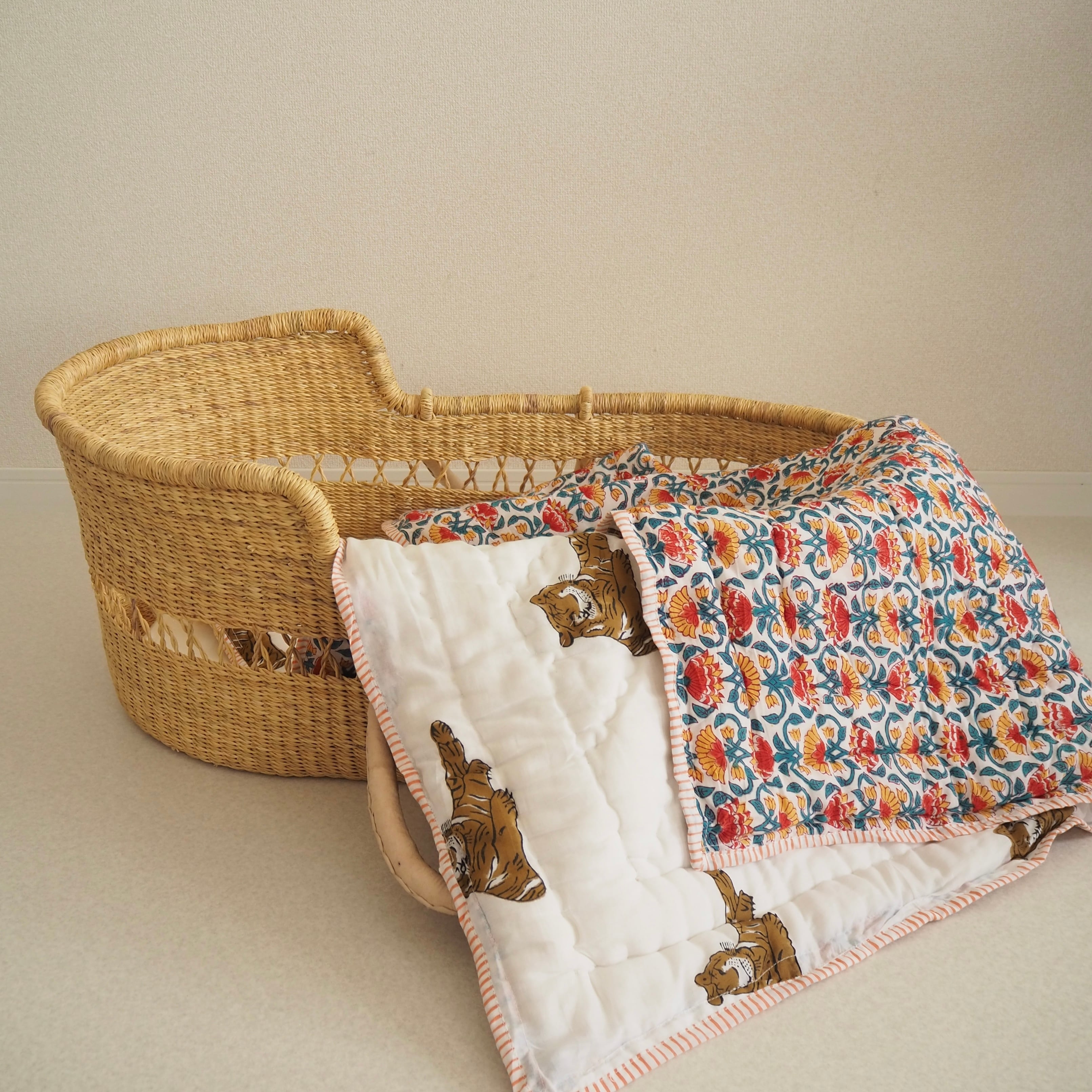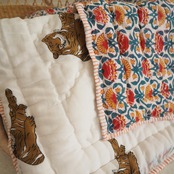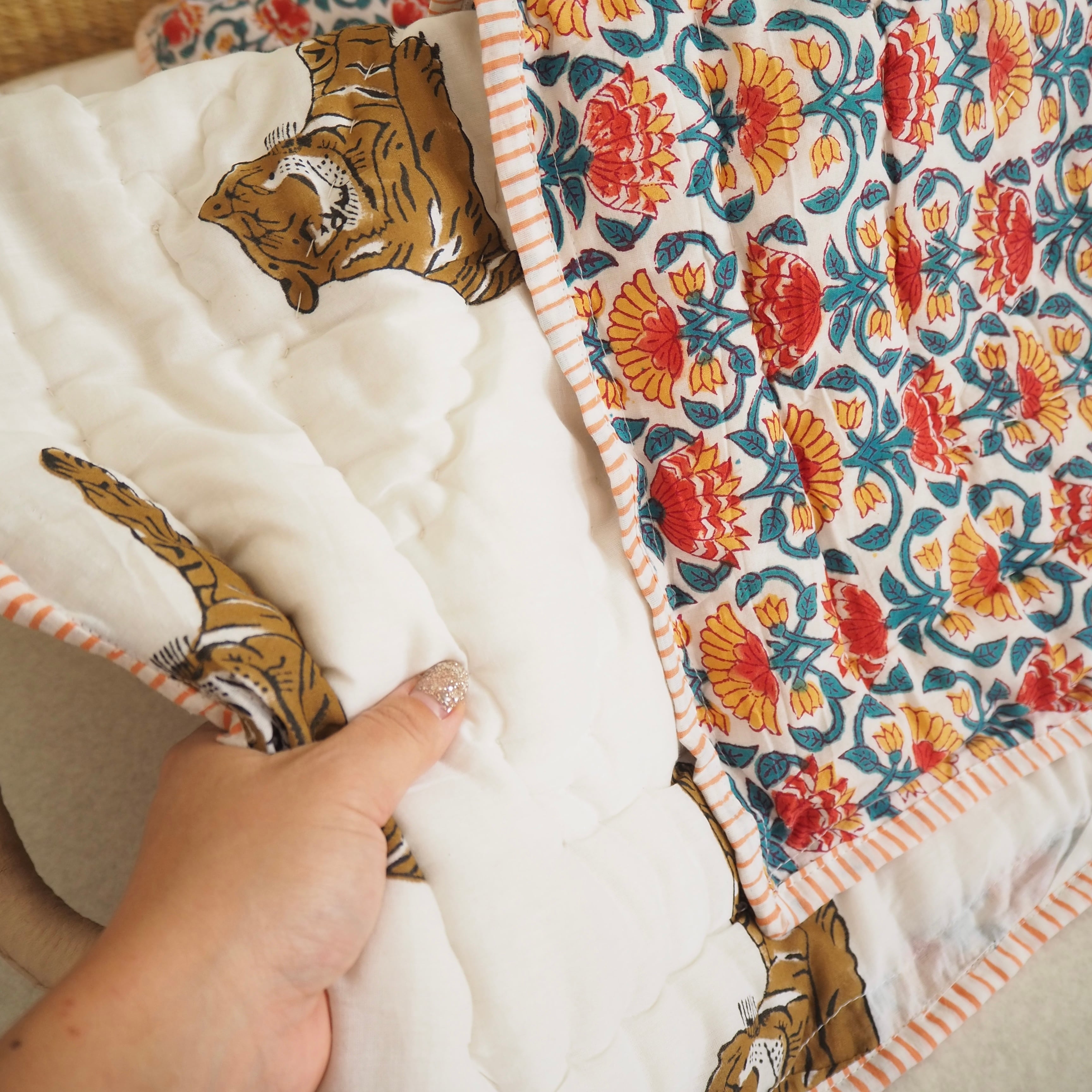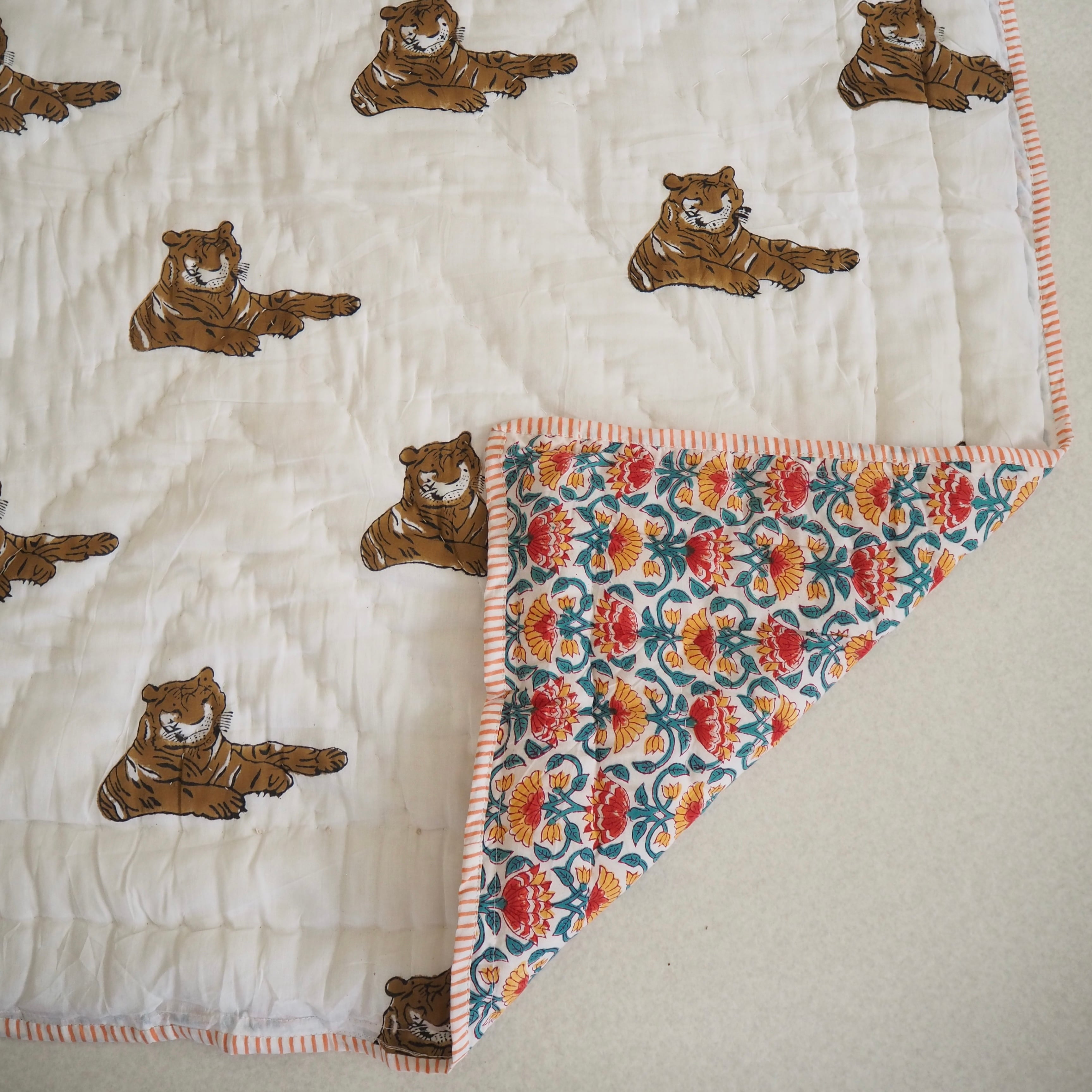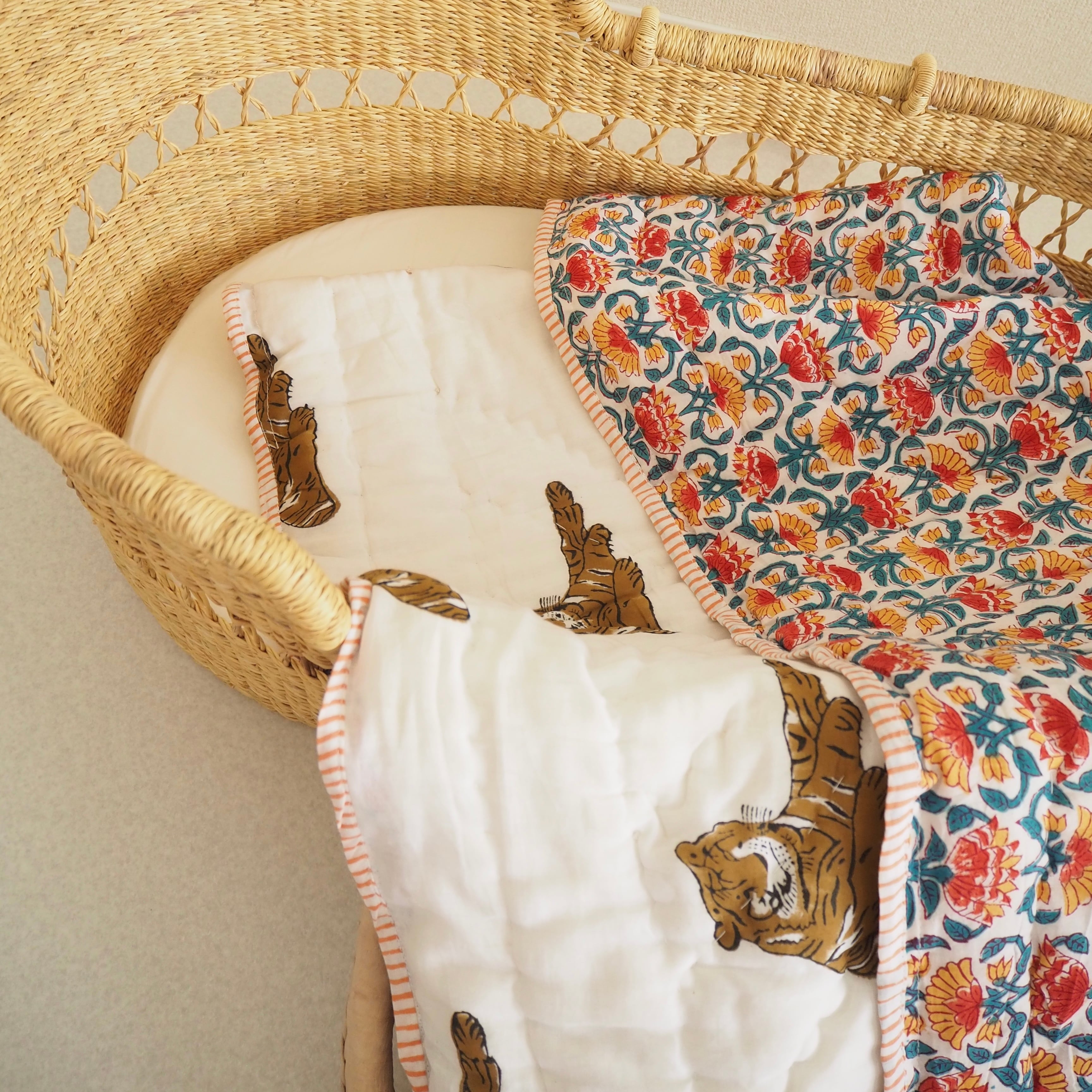 ブロックプリントの街、ジャイプールに行ってきました!店主厳選の生地で作ってもらったベビーキルト。眠そうなタイガーくんとお花畑の組み合わせがとても可愛いデザインです。