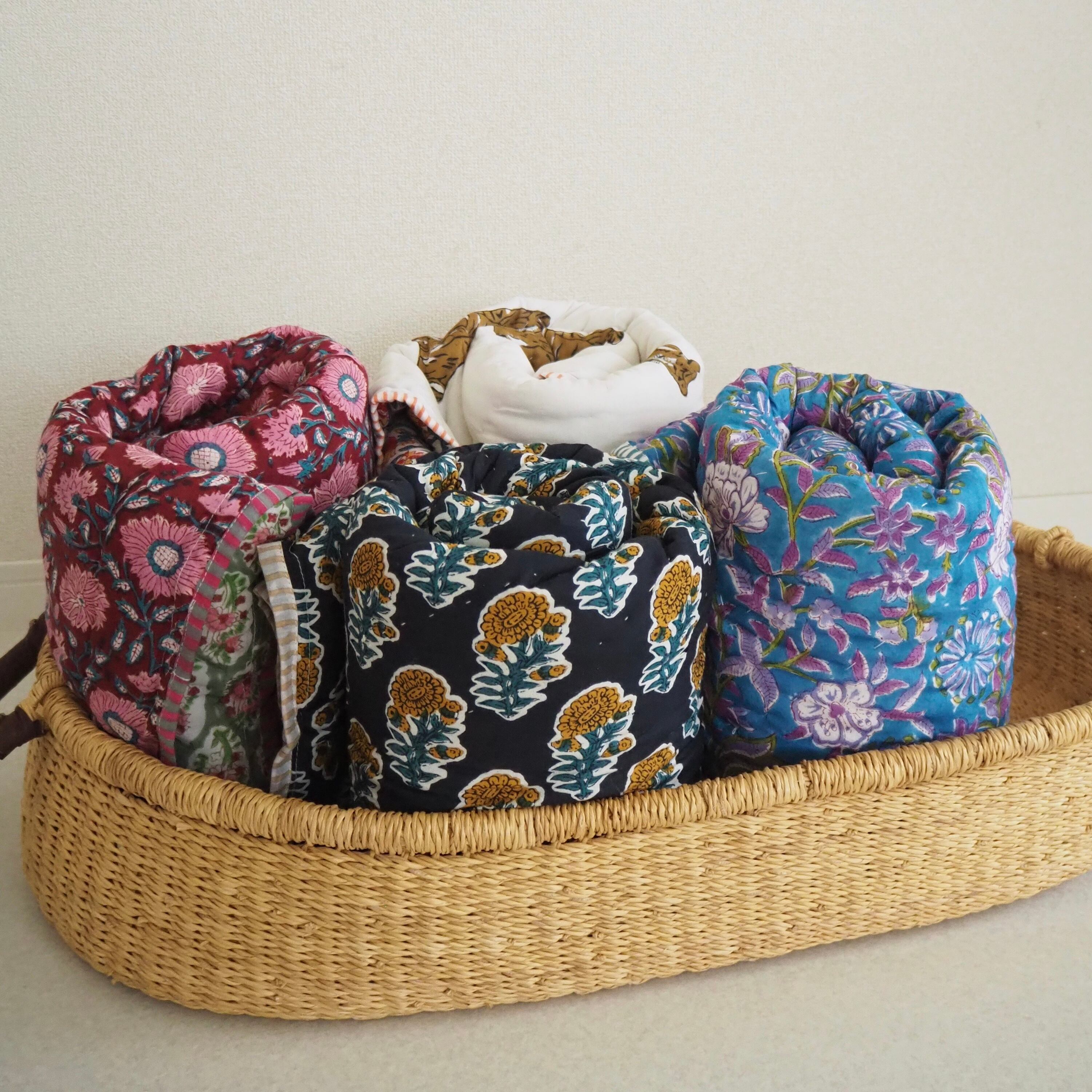 生地の柄は職人さんが木版を何個も何回も重ねて押して写し出しています。キルトの周りはミシン縫い、内側の綿止めはひと針ひと針、手仕事で仕上げてくださっています。