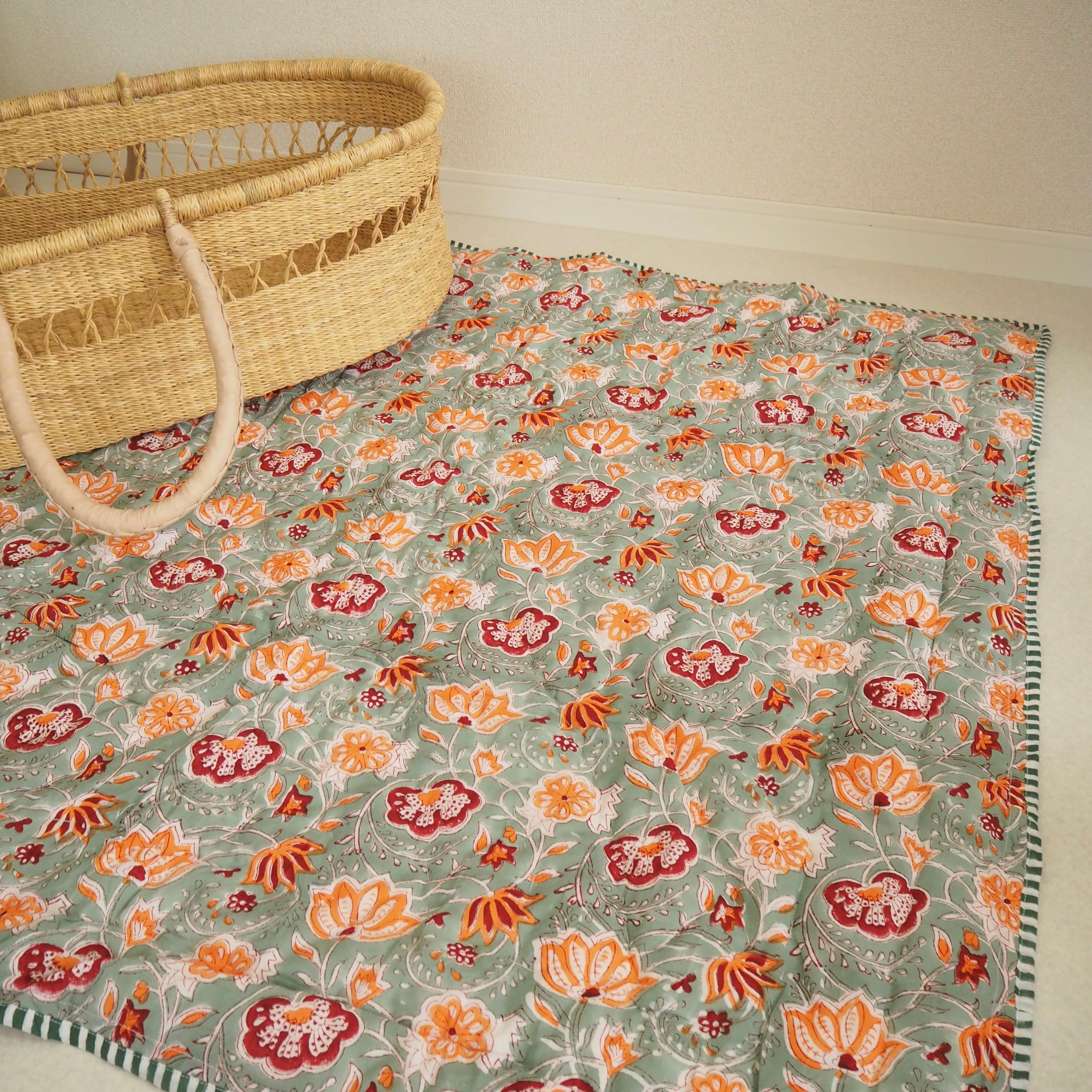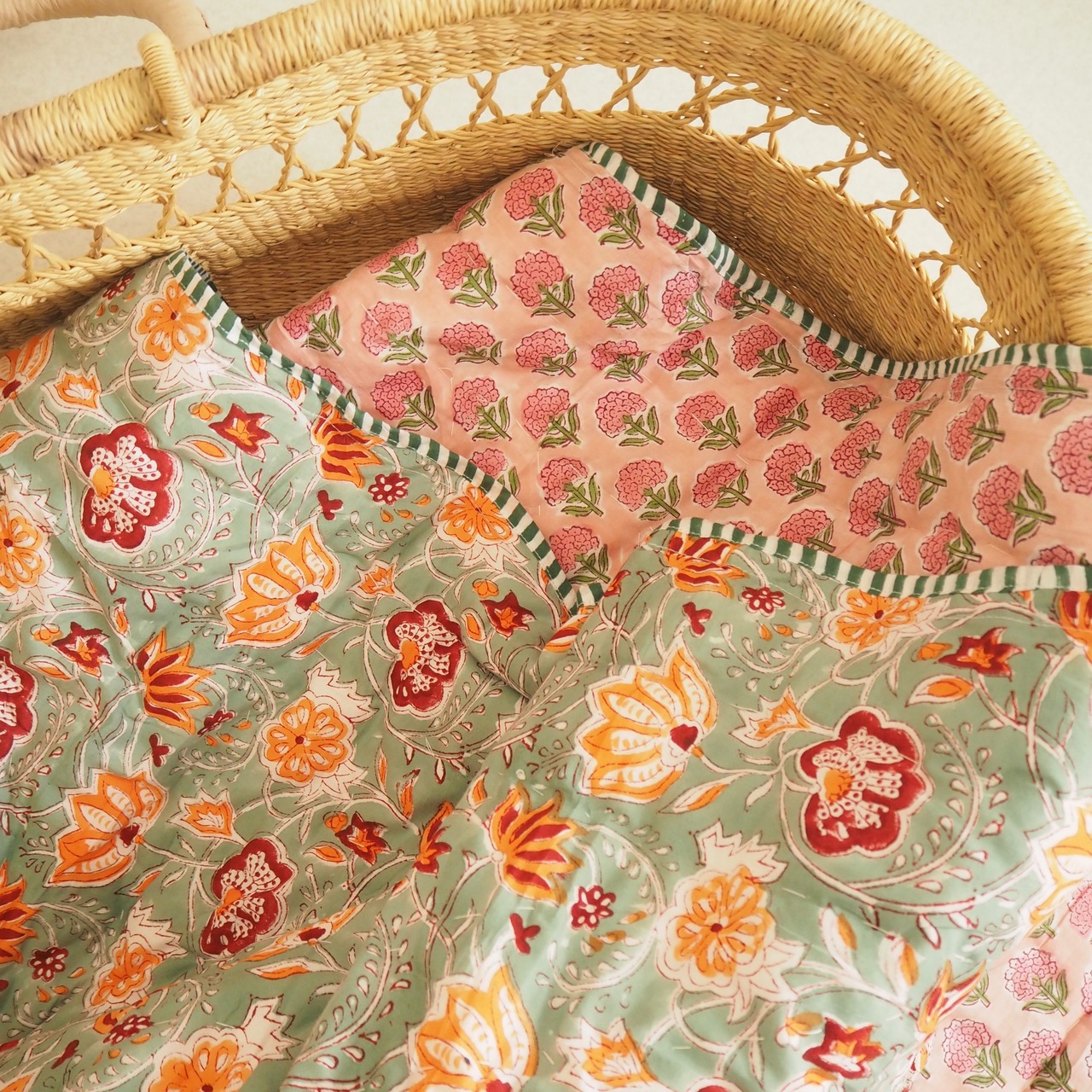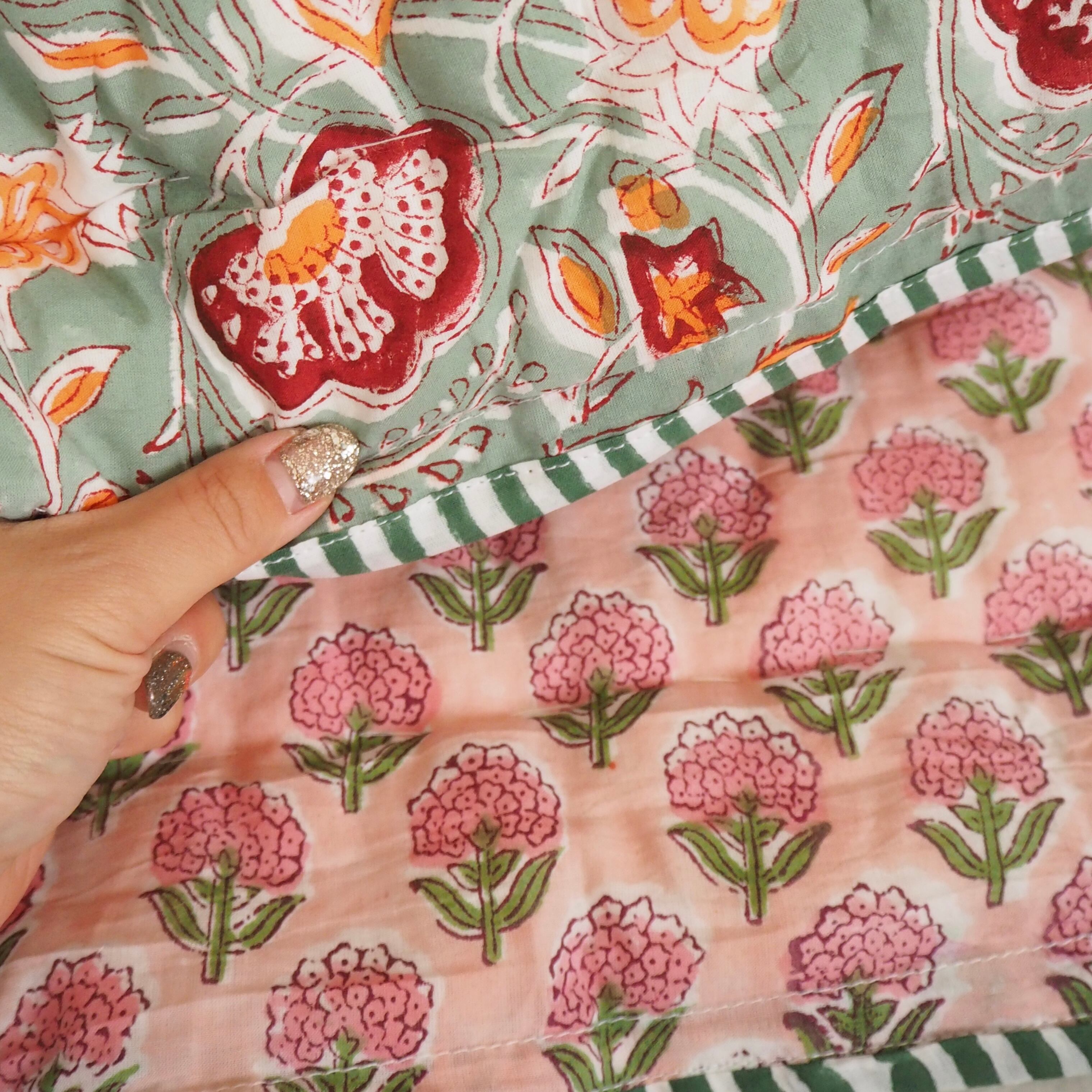 ブロックプリントの街、ジャイプールに行ってきました!店主厳選の生地で作ってもらったベビーキルト。オレンジとピンクのフラワーが映えるミントグリーンの生地と、可愛らしい雰囲気のピンクの生地をセレクトしました。店主イチオシの一枚です。