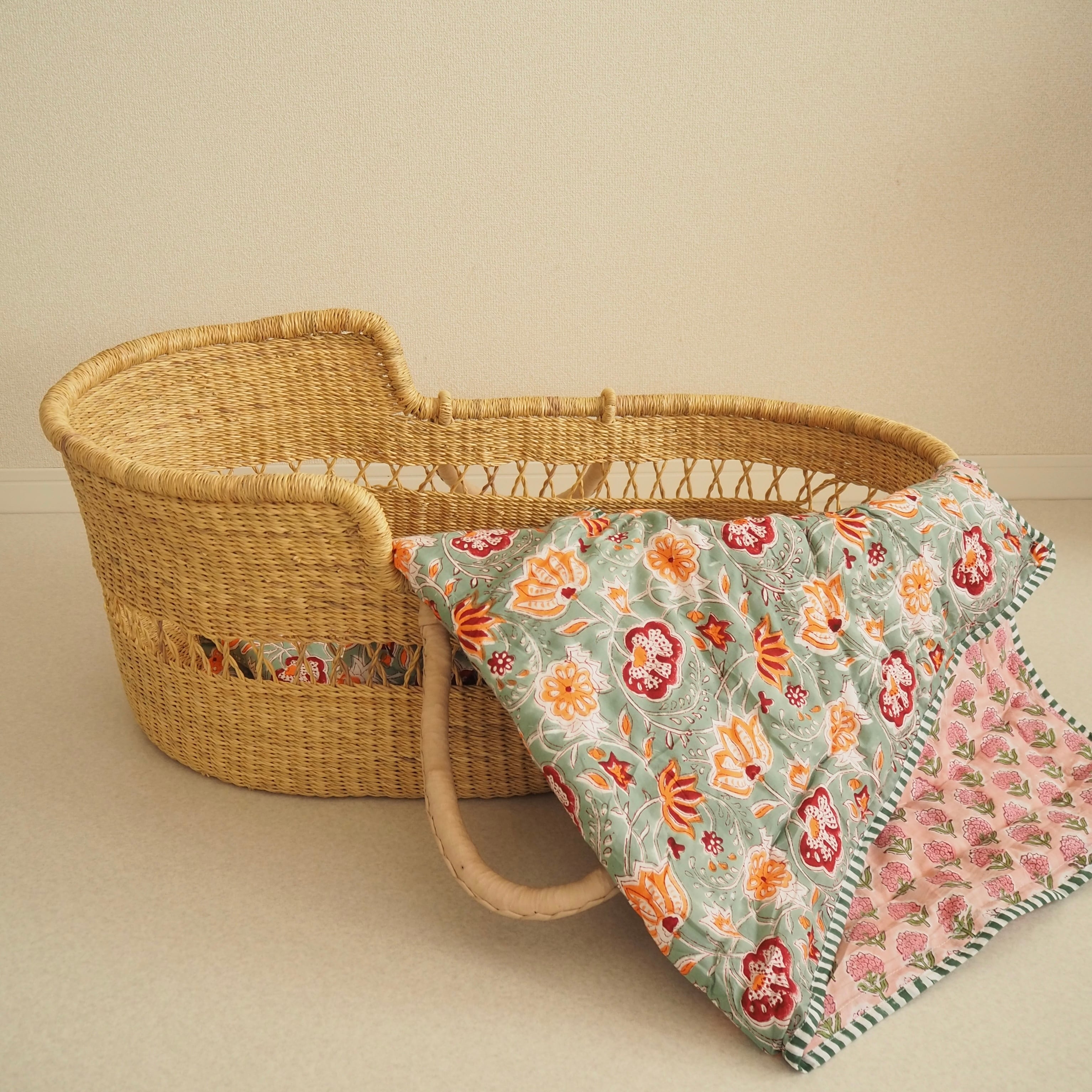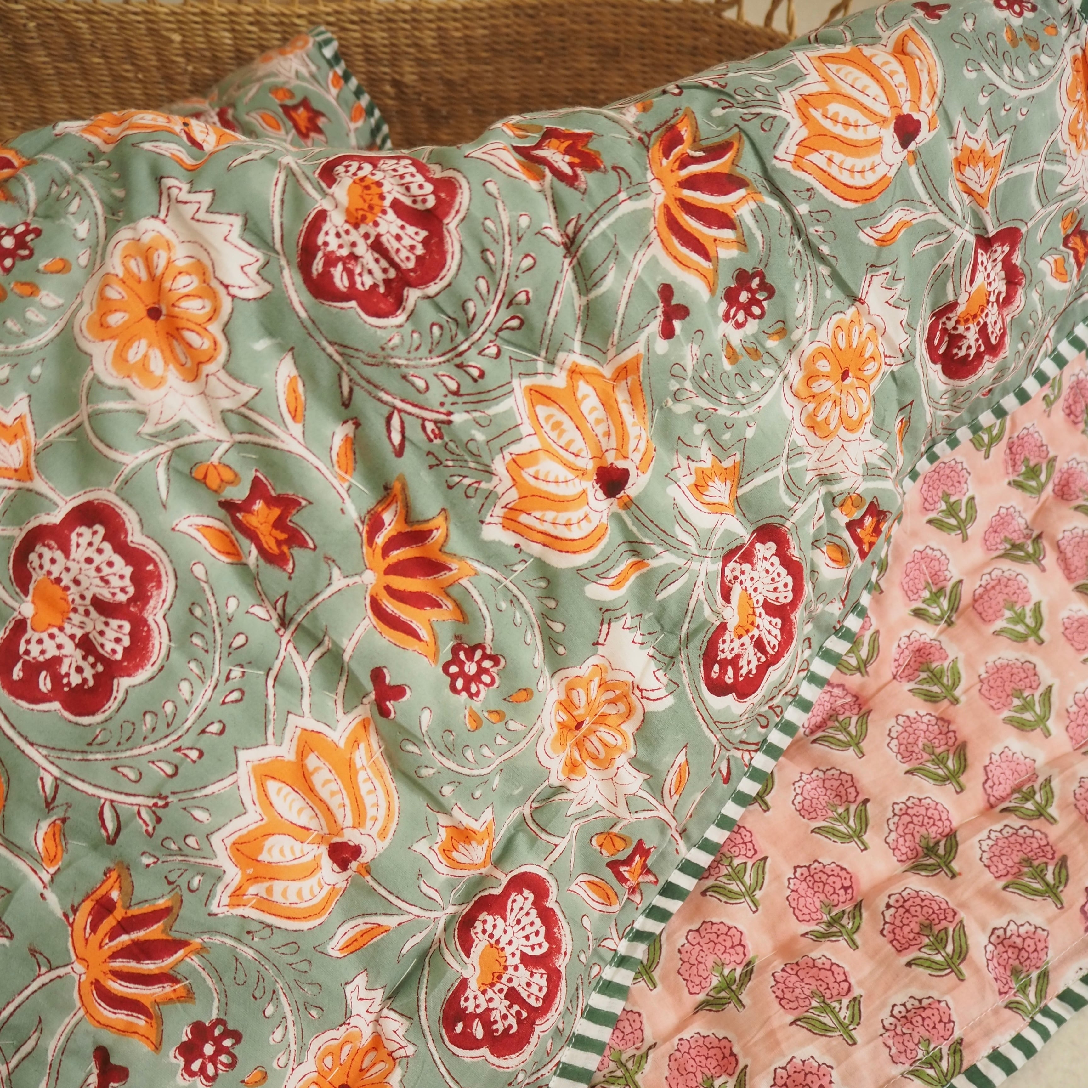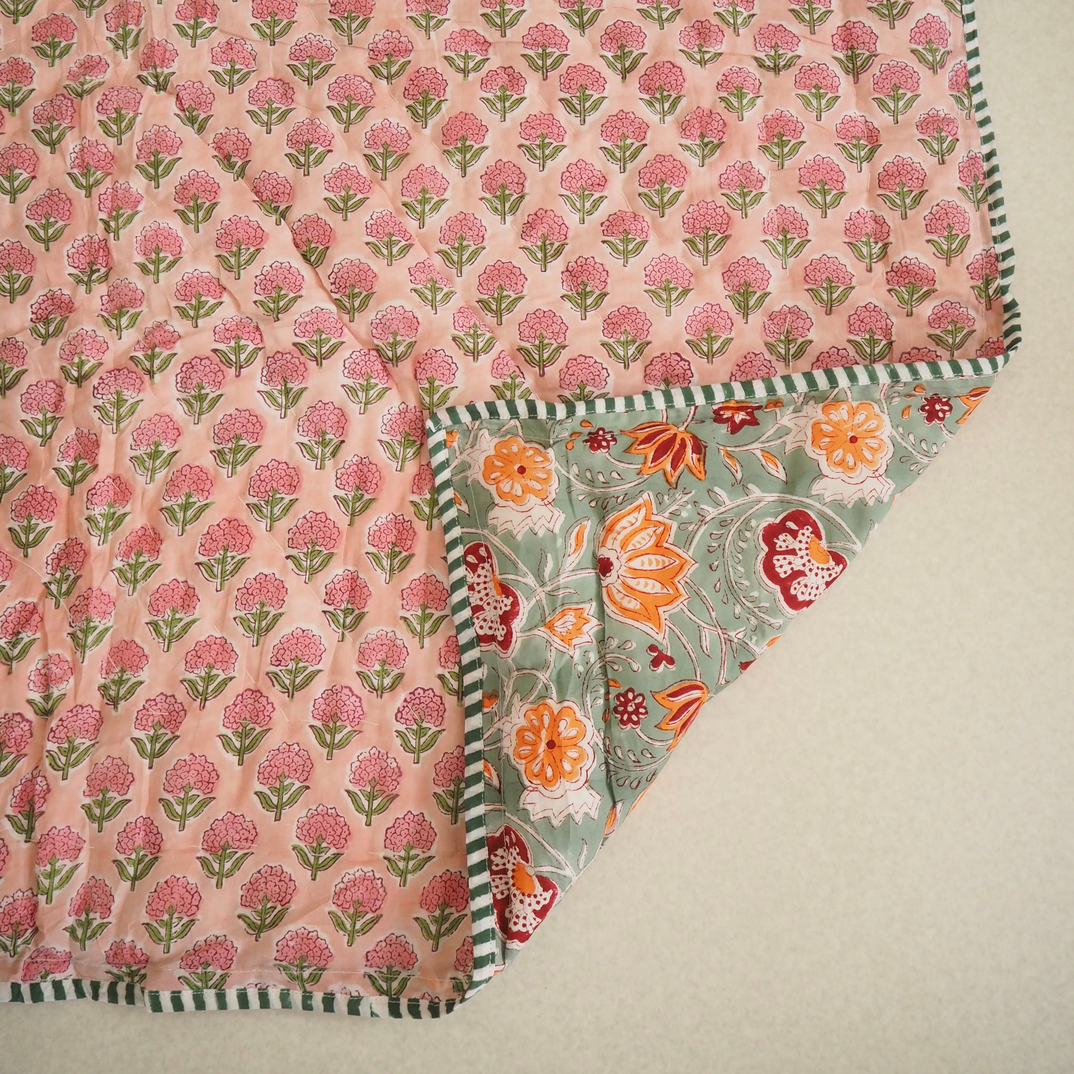 ブロックプリントの街、ジャイプールに行ってきました!店主厳選の生地で作ってもらったベビーキルト。オレンジとピンクのフラワーが映えるミントグリーンの生地と、可愛らしい雰囲気のピンクの生地をセレクトしました。店主イチオシの一枚です。