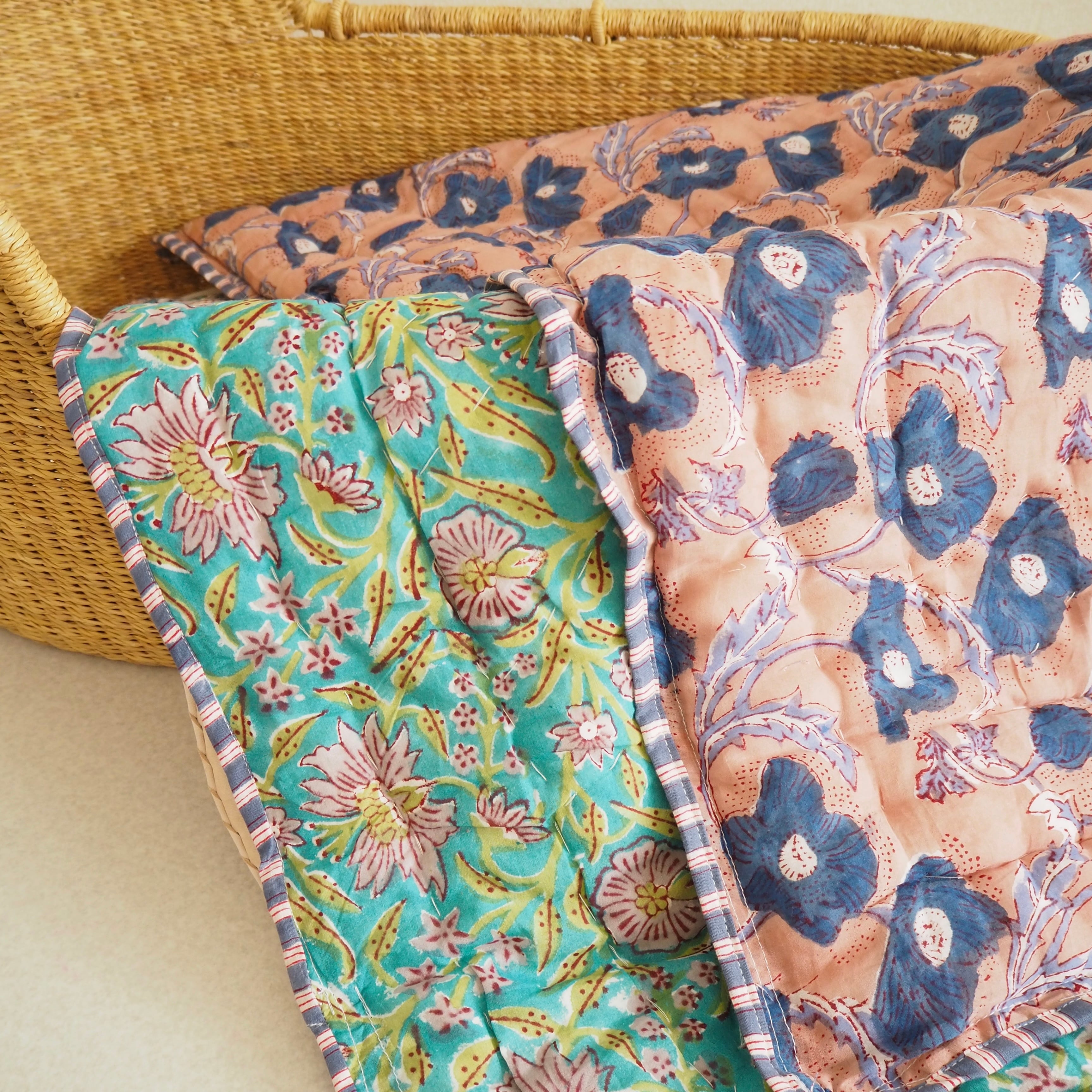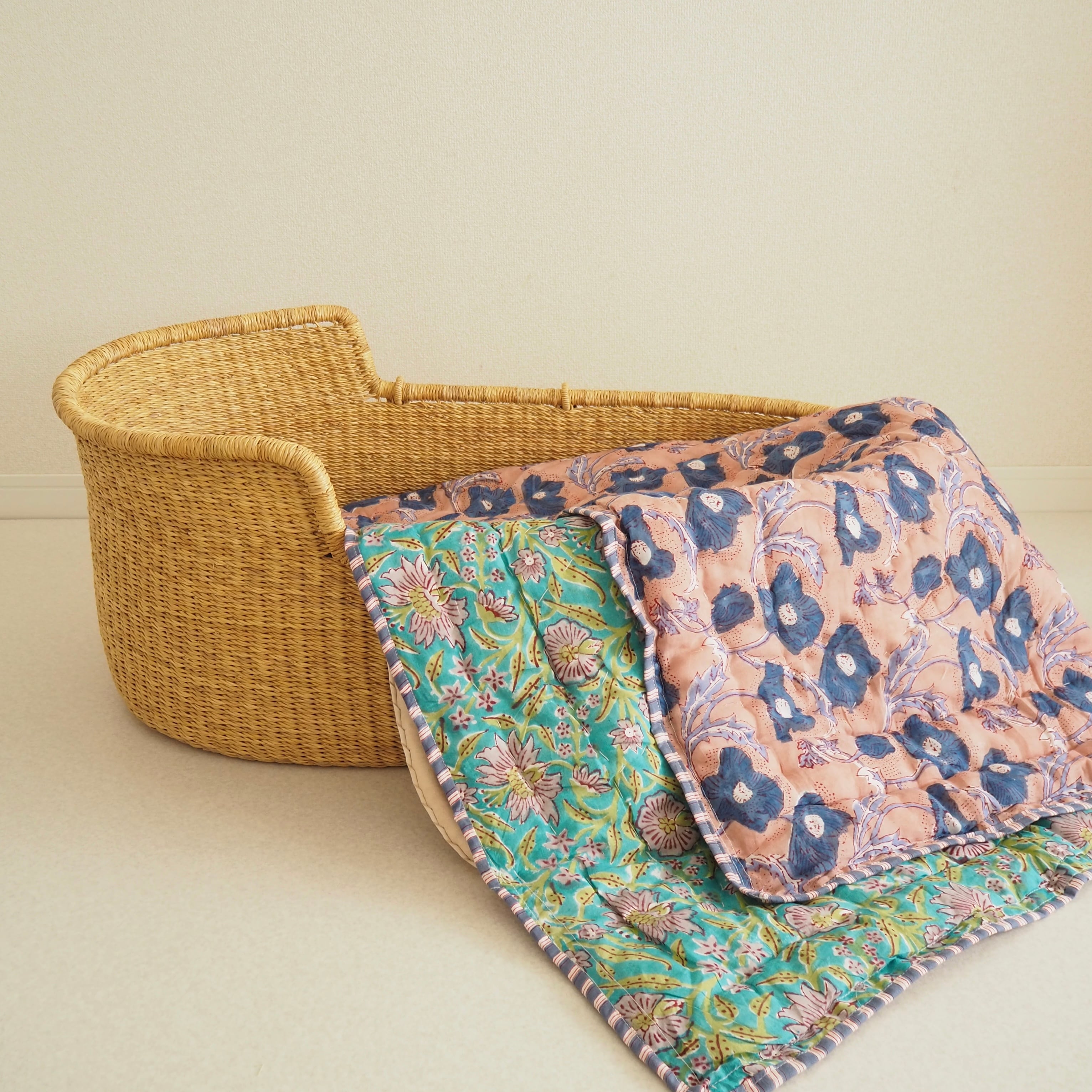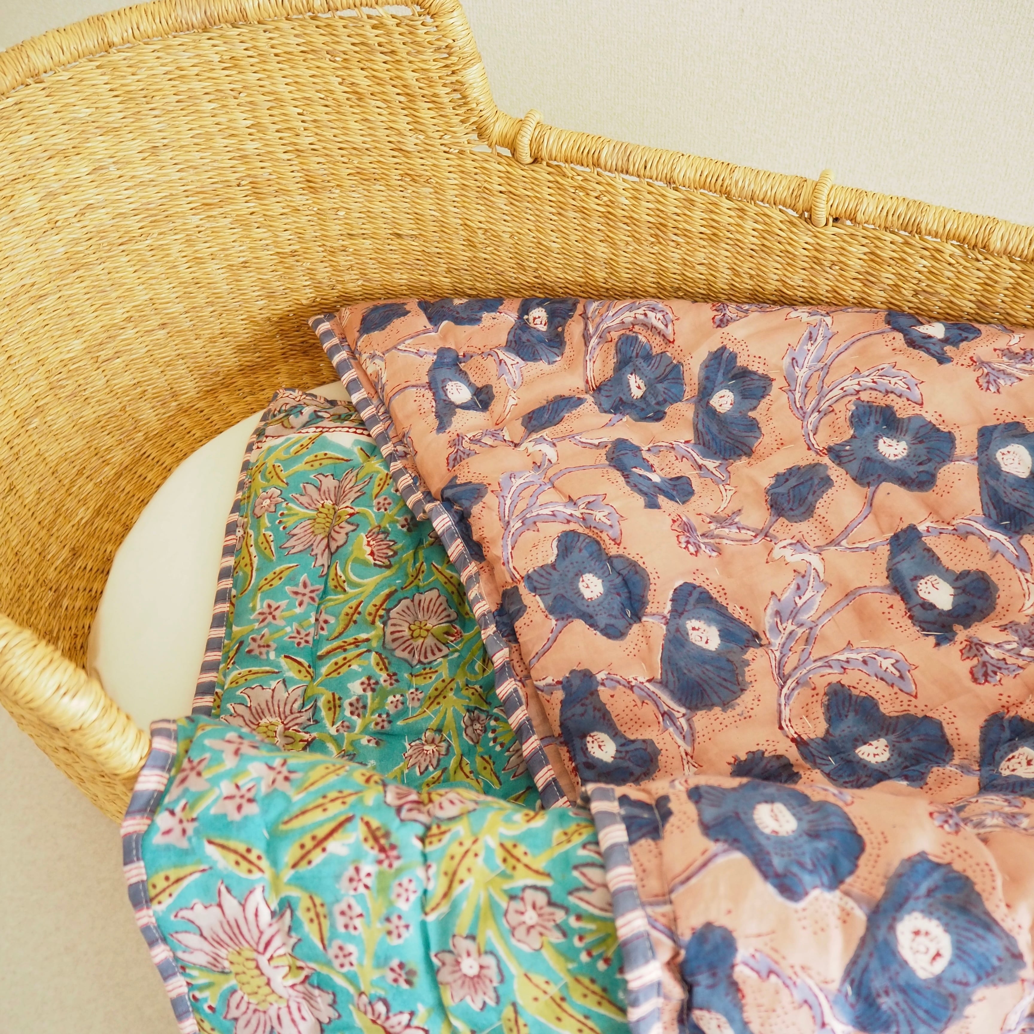ブロックプリントの街、ジャイプールに行ってきました!店主厳選の生地で作ってもらったベビーキルト。ピンクベージュ×ネイビー、グリーン×グレーの珍しくて可愛いカラーの組み合わせでお作りしています。