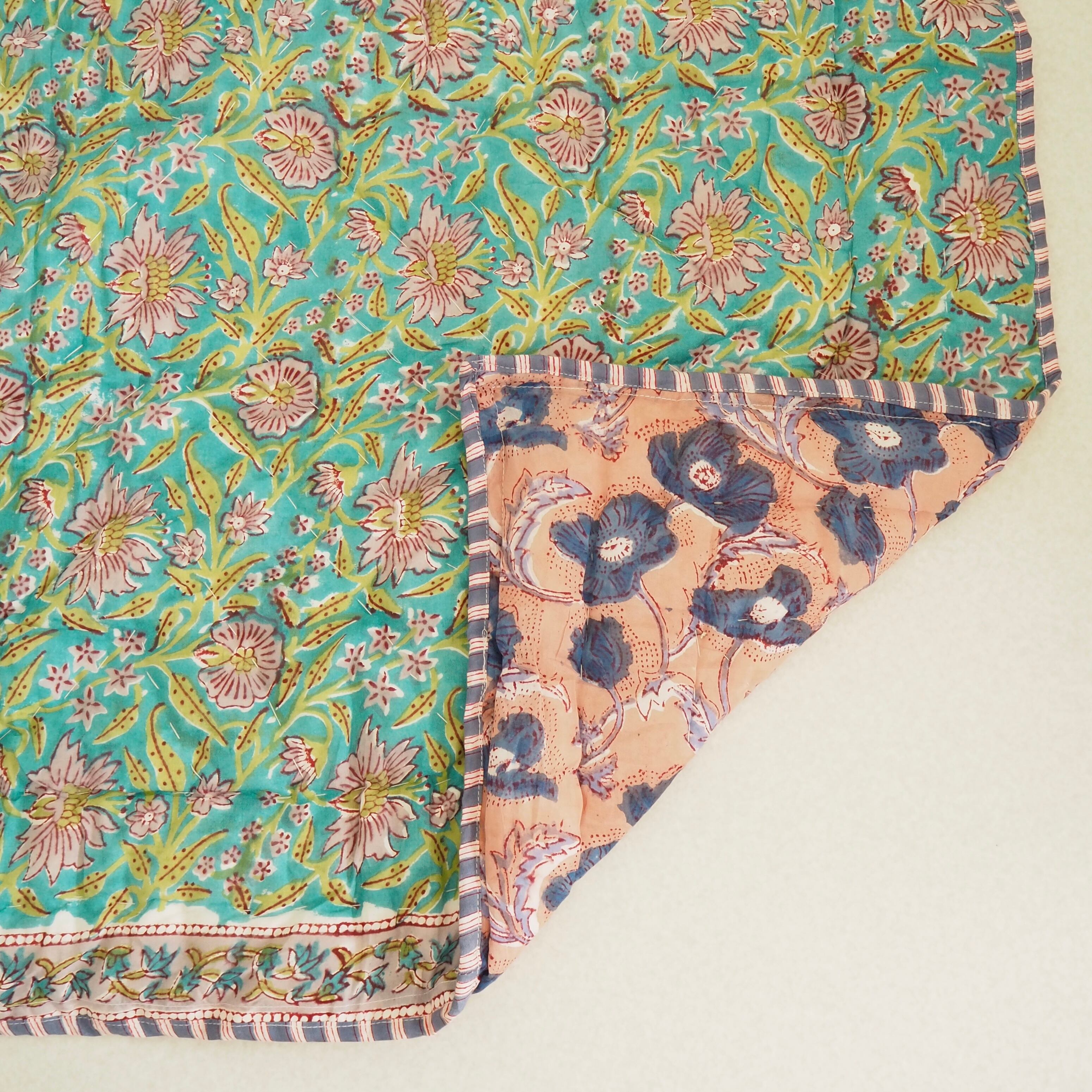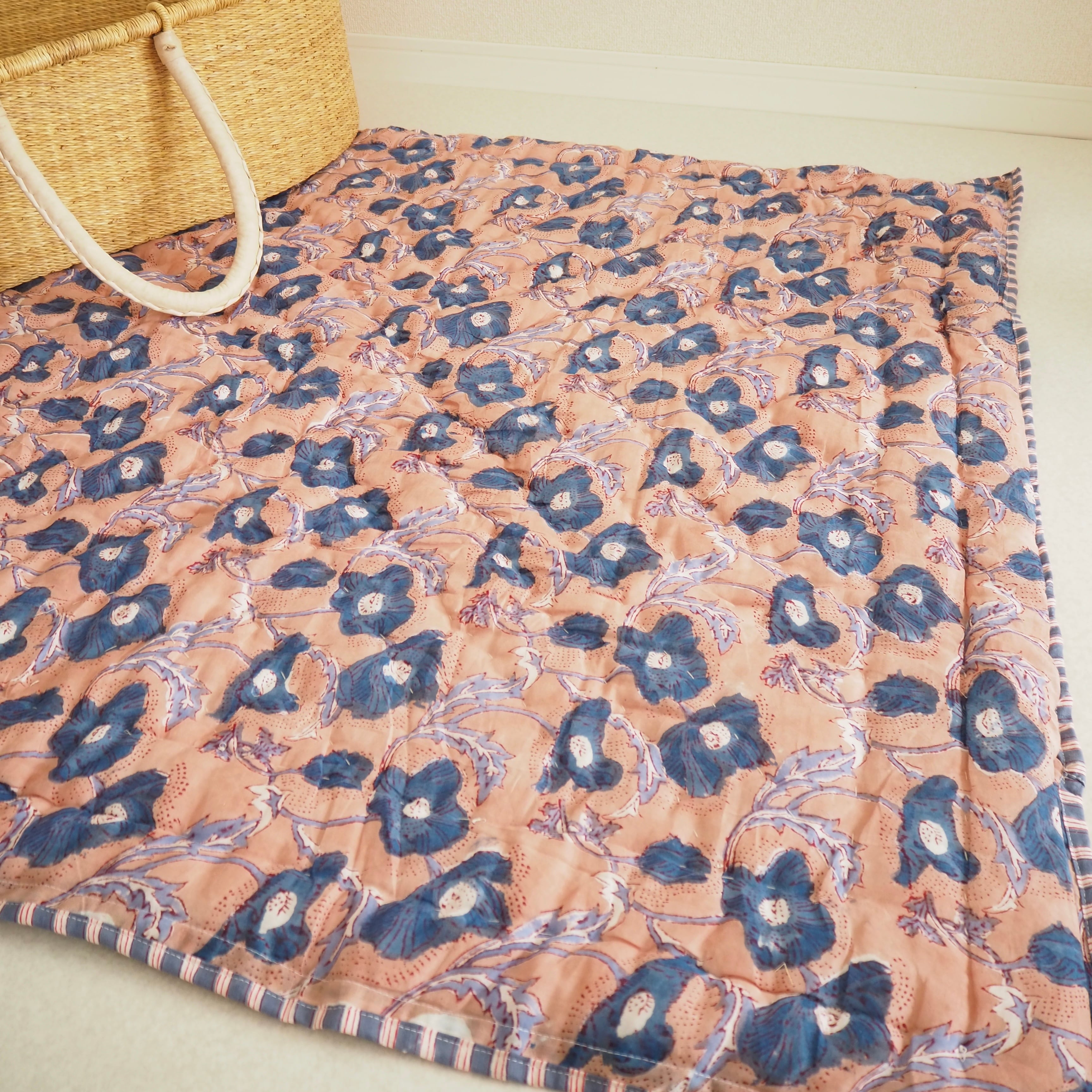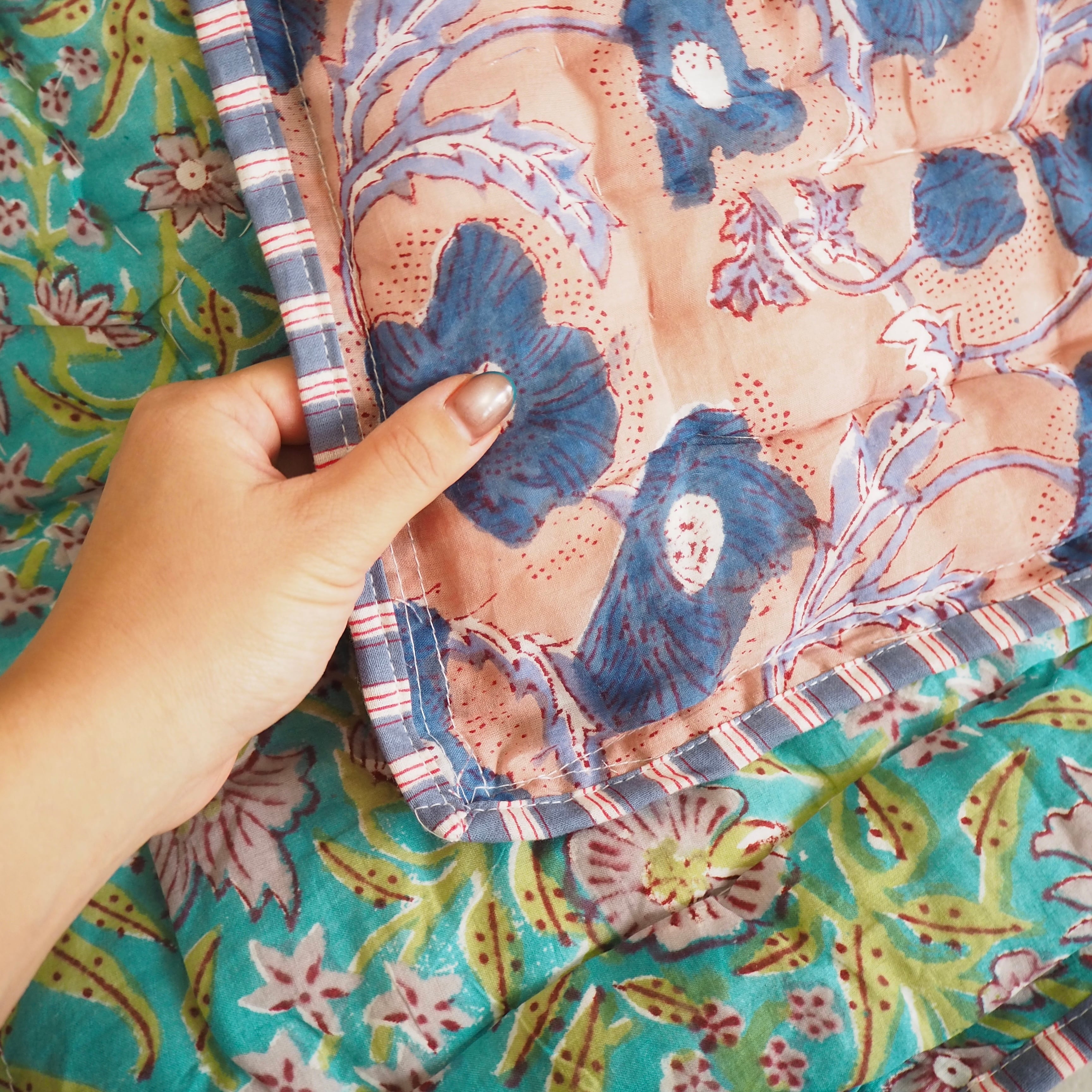 ブロックプリントの街、ジャイプールに行ってきました!店主厳選の生地で作ってもらったベビーキルト。ピンクベージュ×ネイビー、グリーン×グレーの珍しくて可愛いカラーの組み合わせでお作りしています。