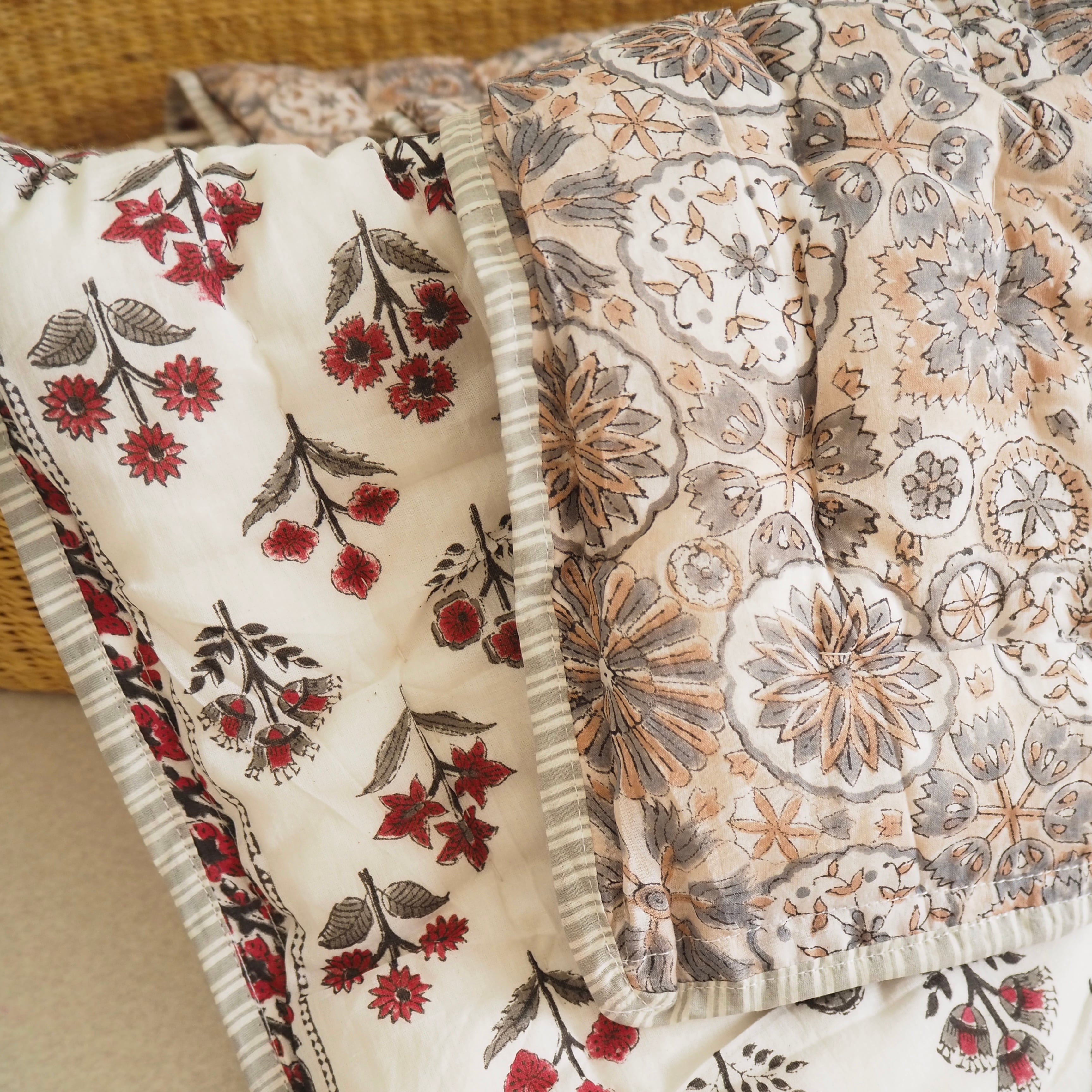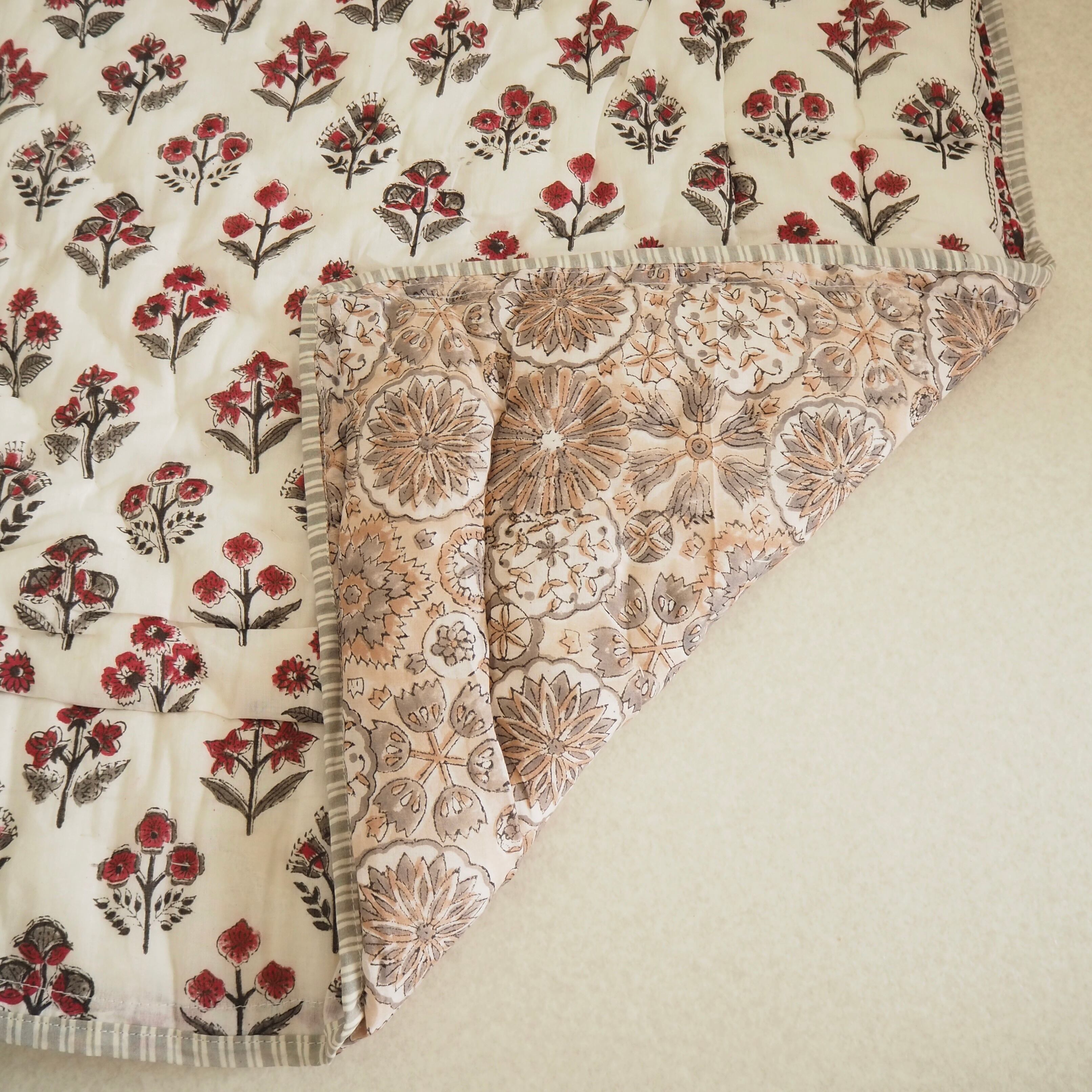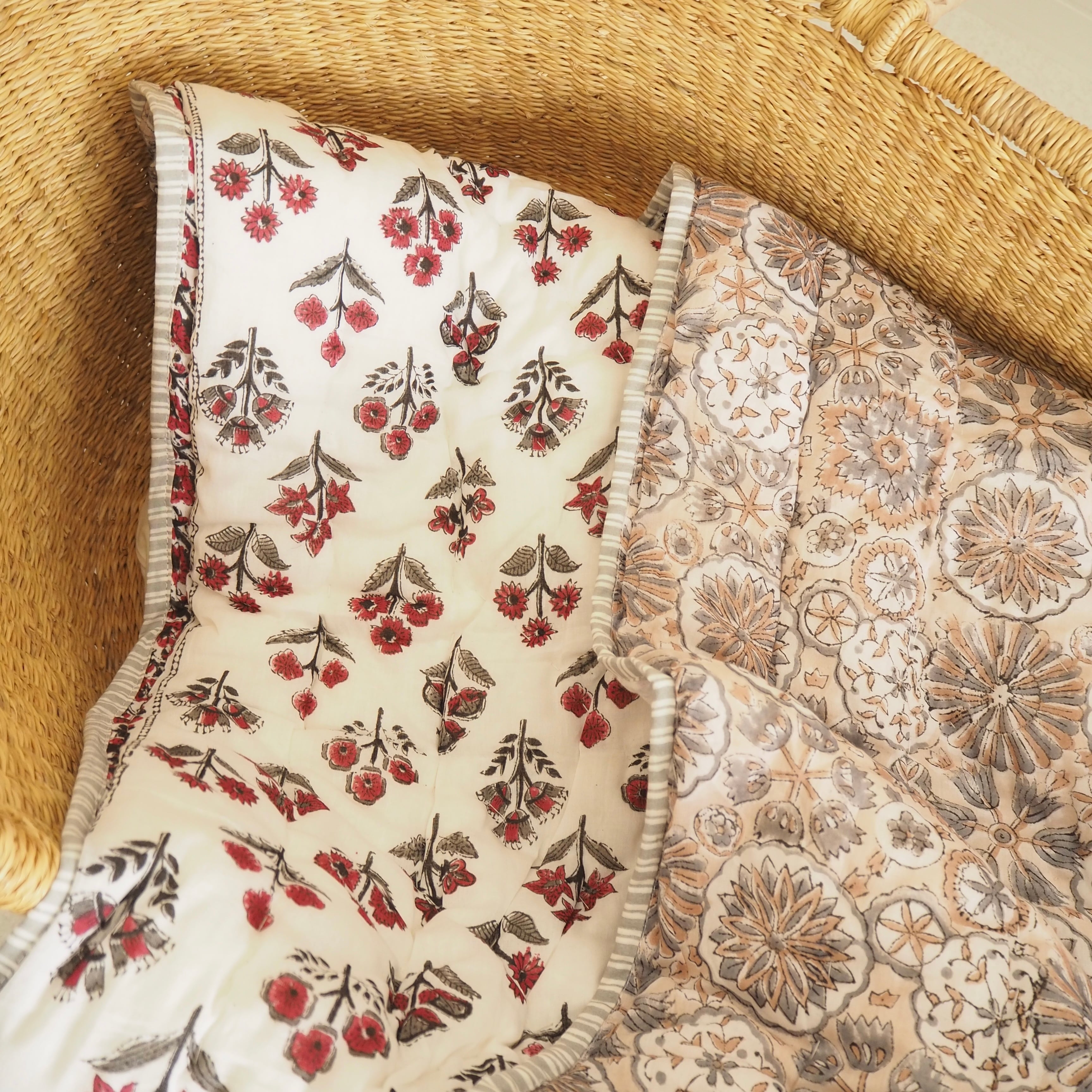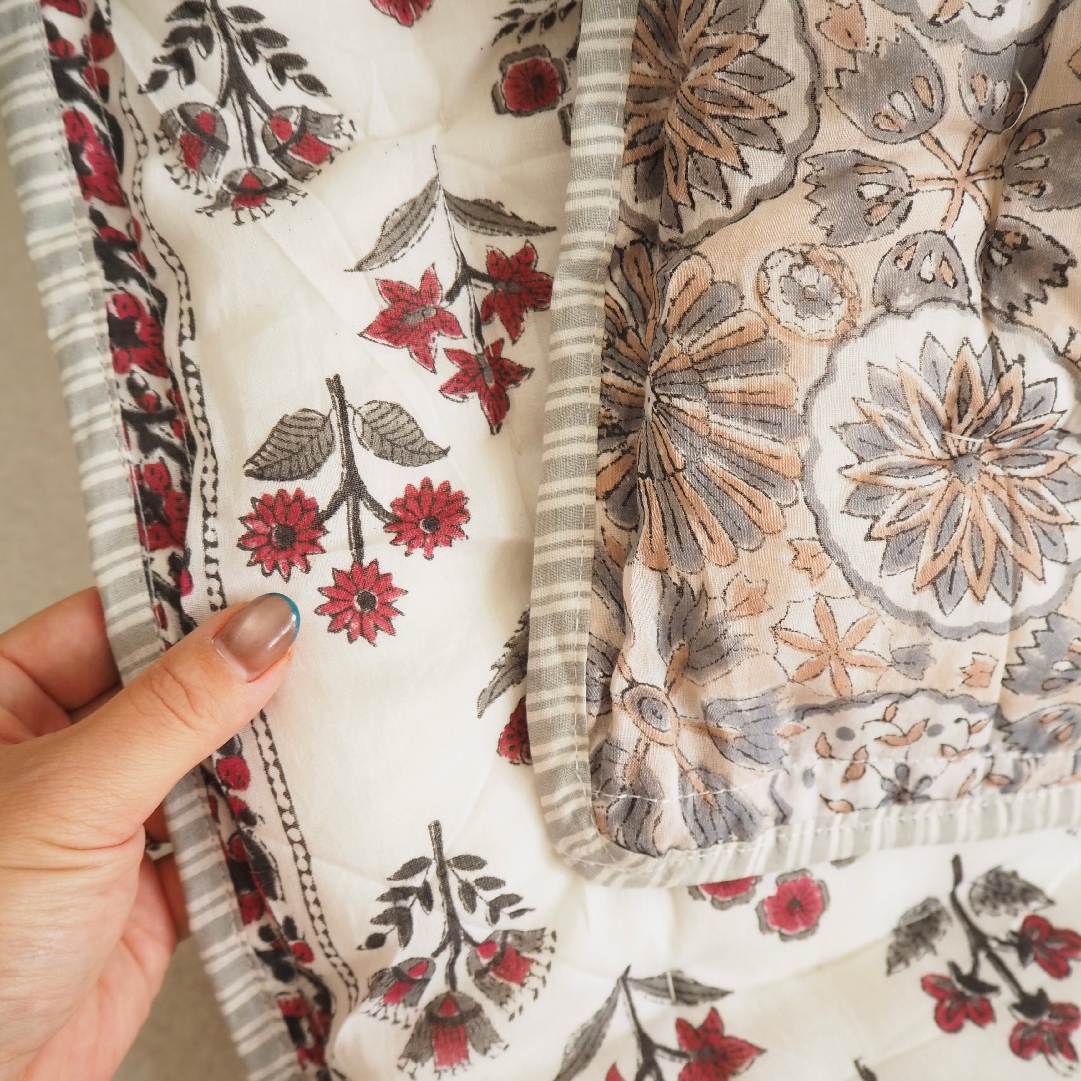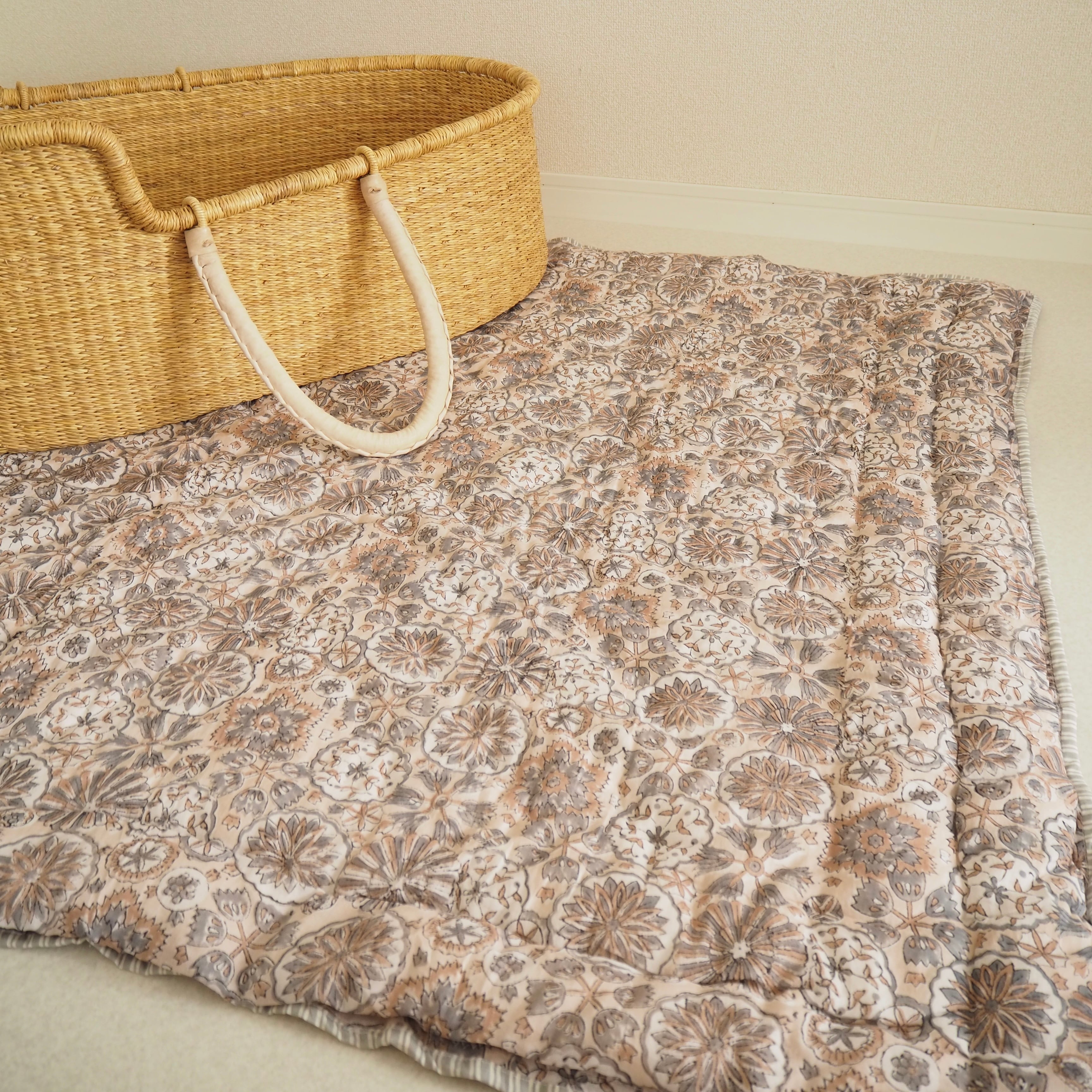 ブロックプリントの街、ジャイプールに行ってきました!店主厳選の生地で作ってもらったベビーキルト。ホワイト×グレーの落ち着いたカラートーンで、使いやすいデザインに仕上げています。