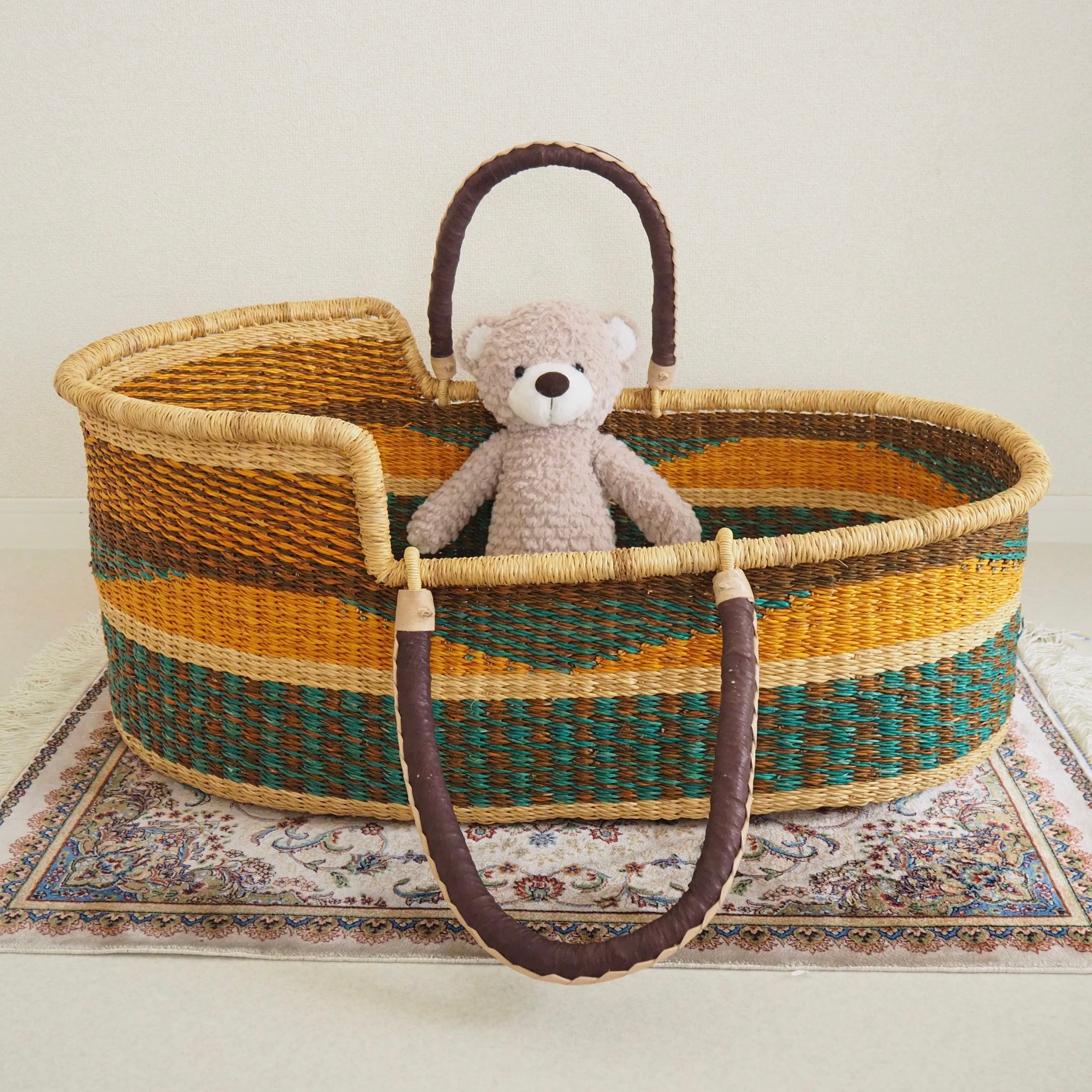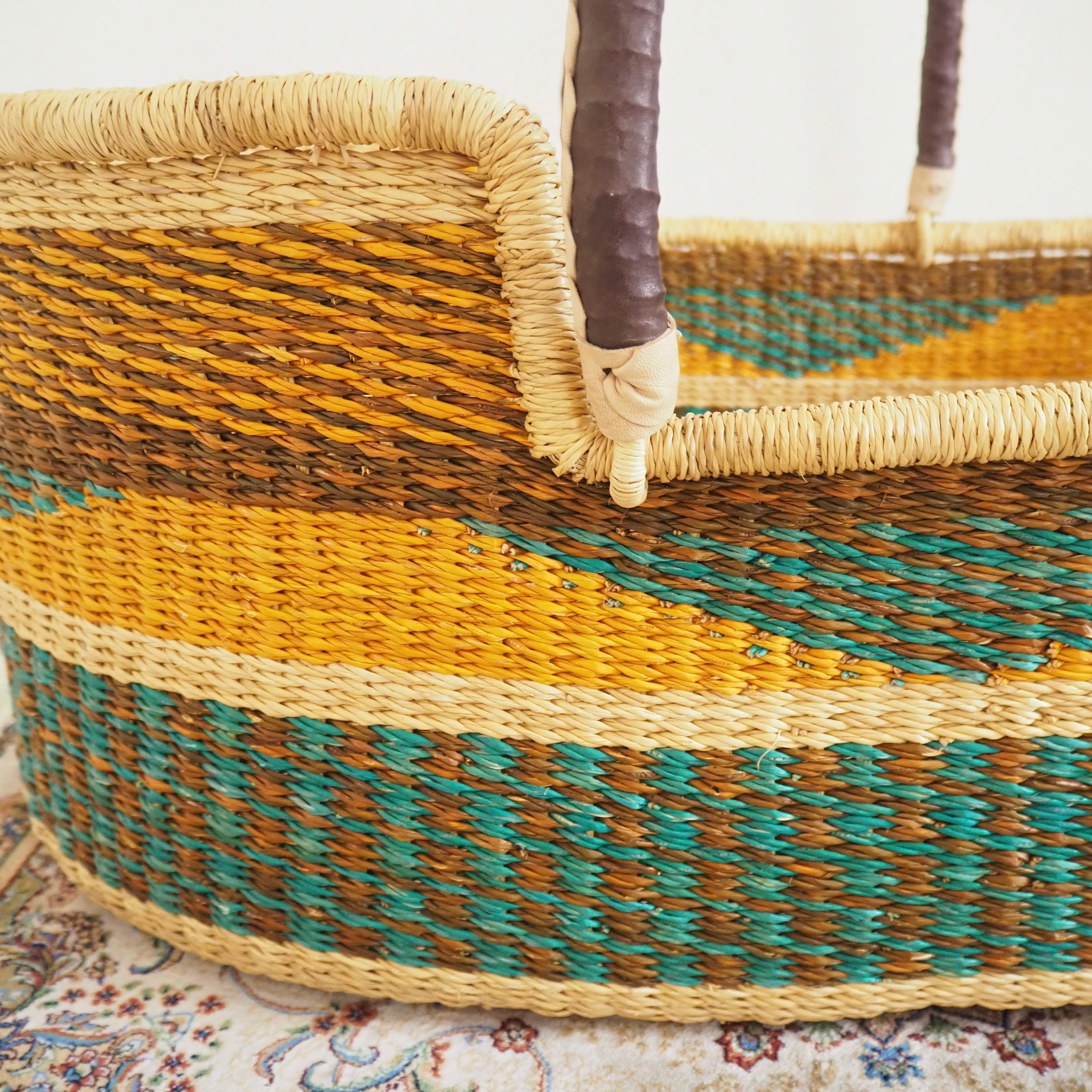 カゴ部分はエレファントグラス、ハンドルは羊の革から出来ています。ガーナの職人が数日かけて、心を込めて作っています。ハンドルはブラウン×クリームのレザーを使用しています。