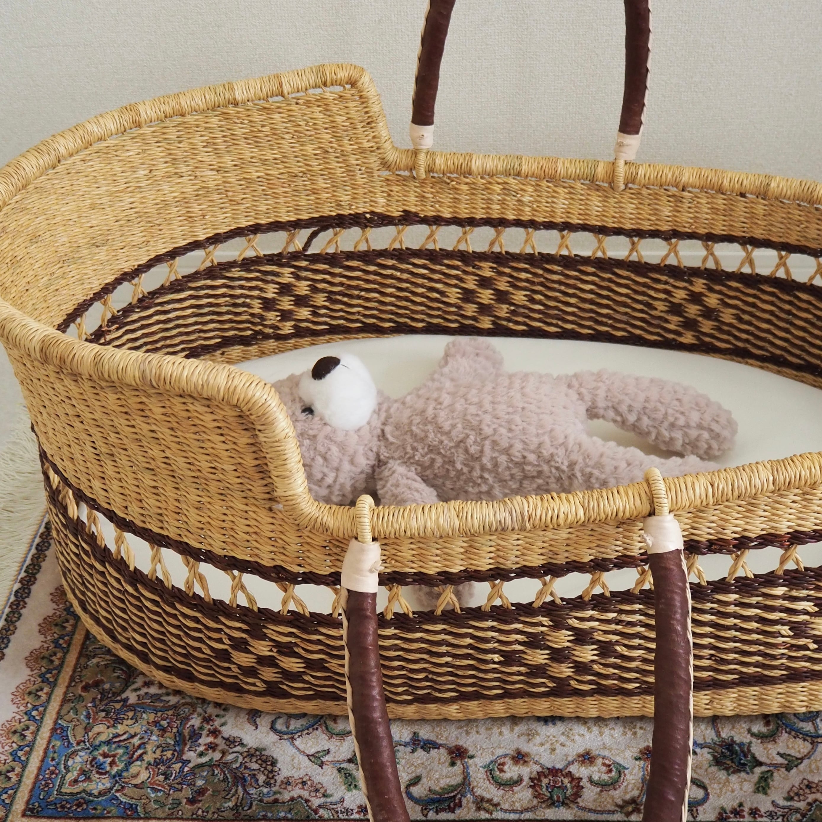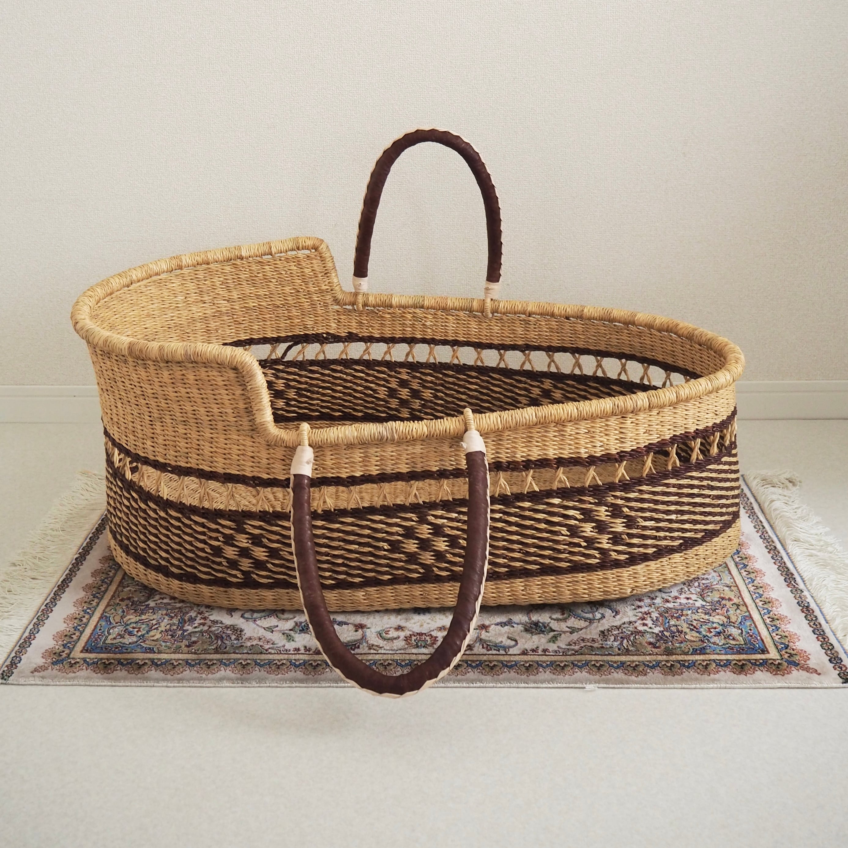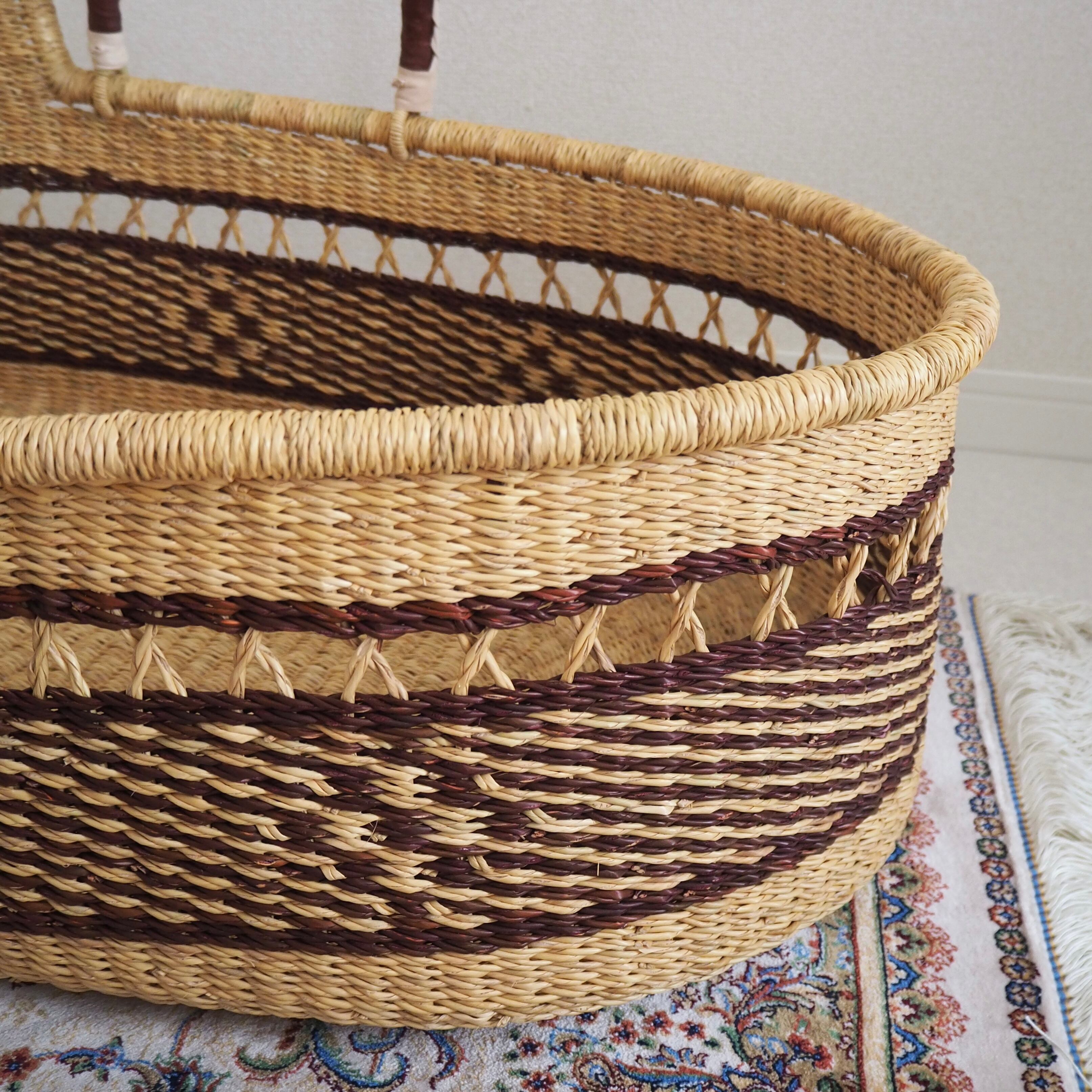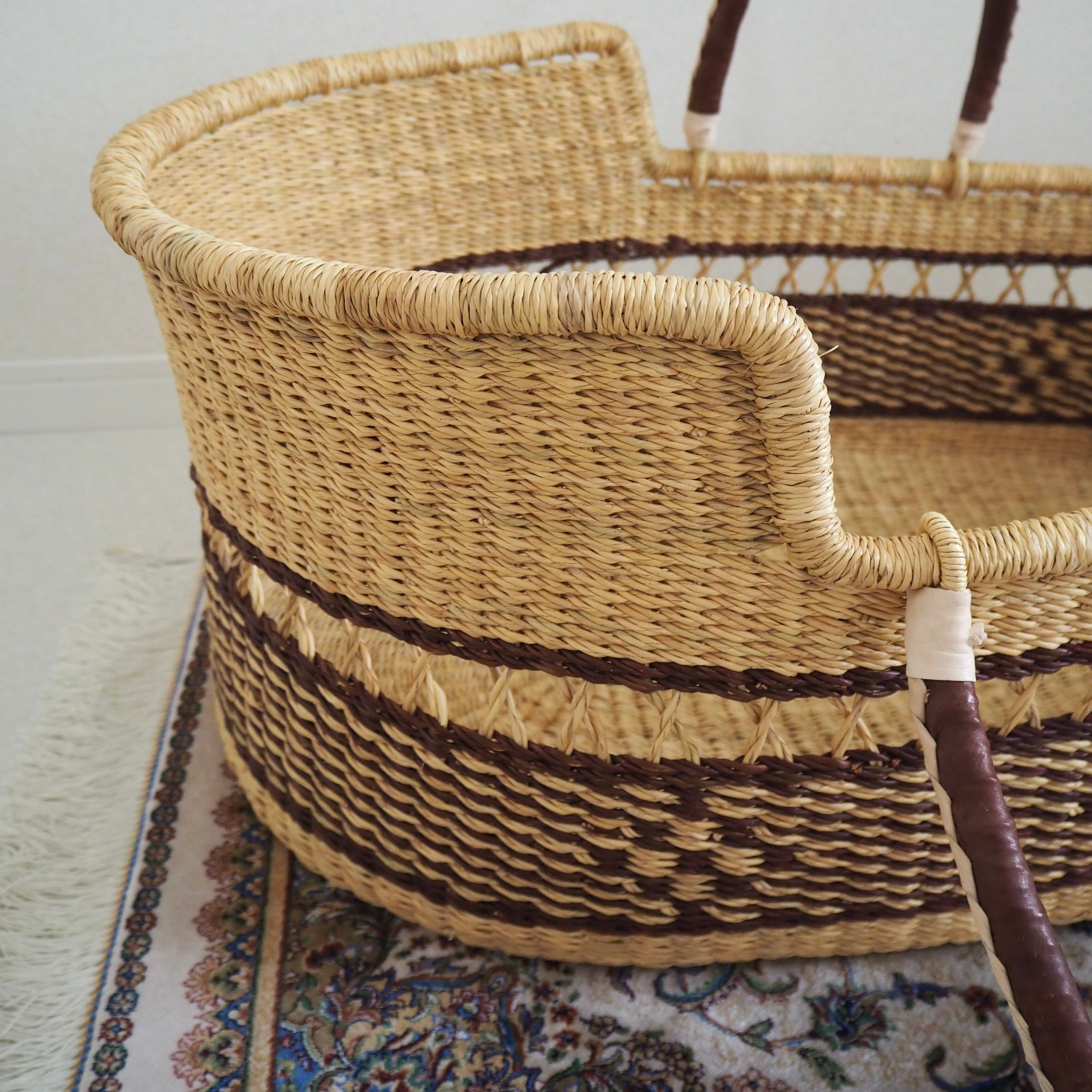 カゴ部分はエレファントグラス、ハンドルは羊の革から出来ています。ガーナの職人が数日かけて、心を込めて作っています。ハンドルのレザーはブラウンレザーを使用しています。