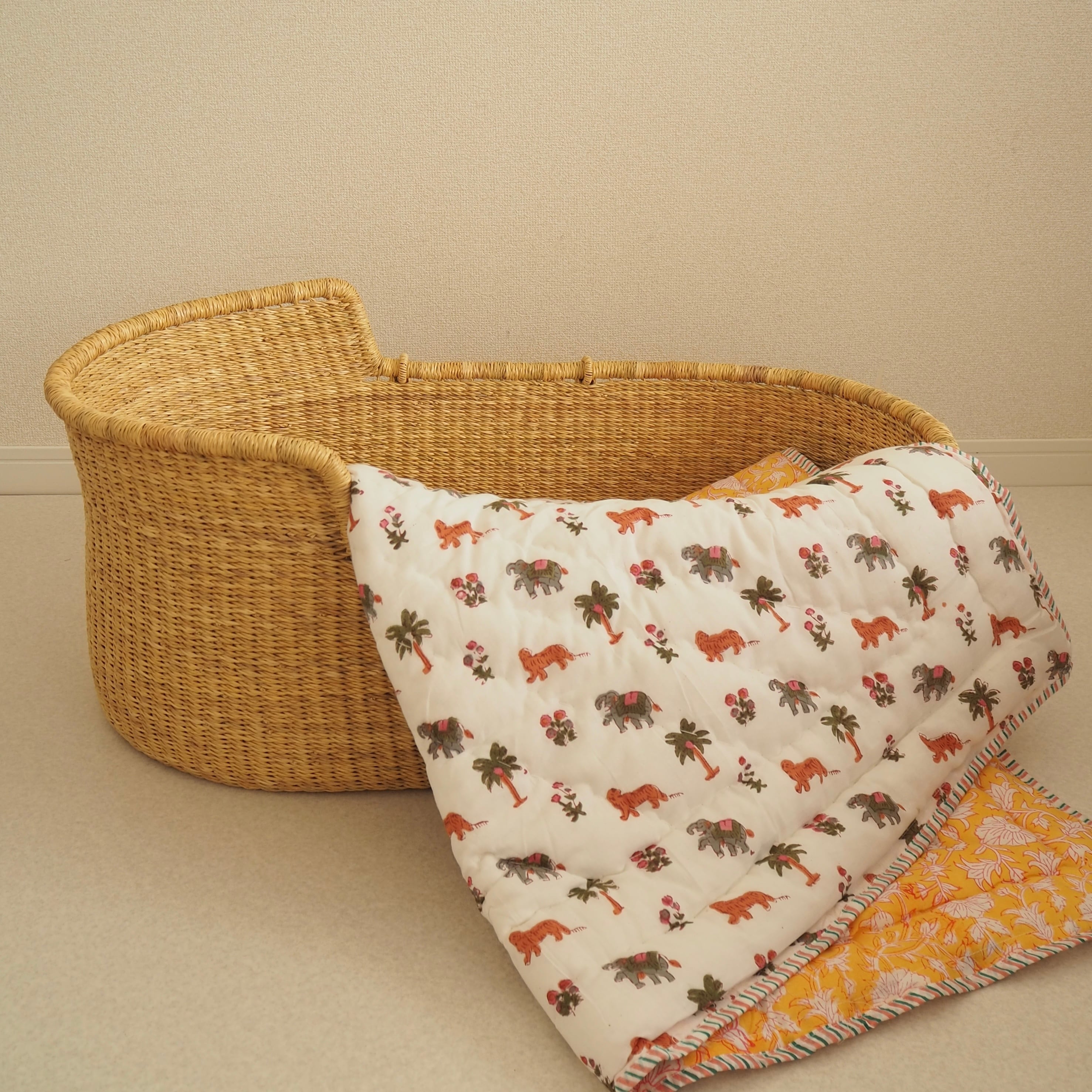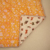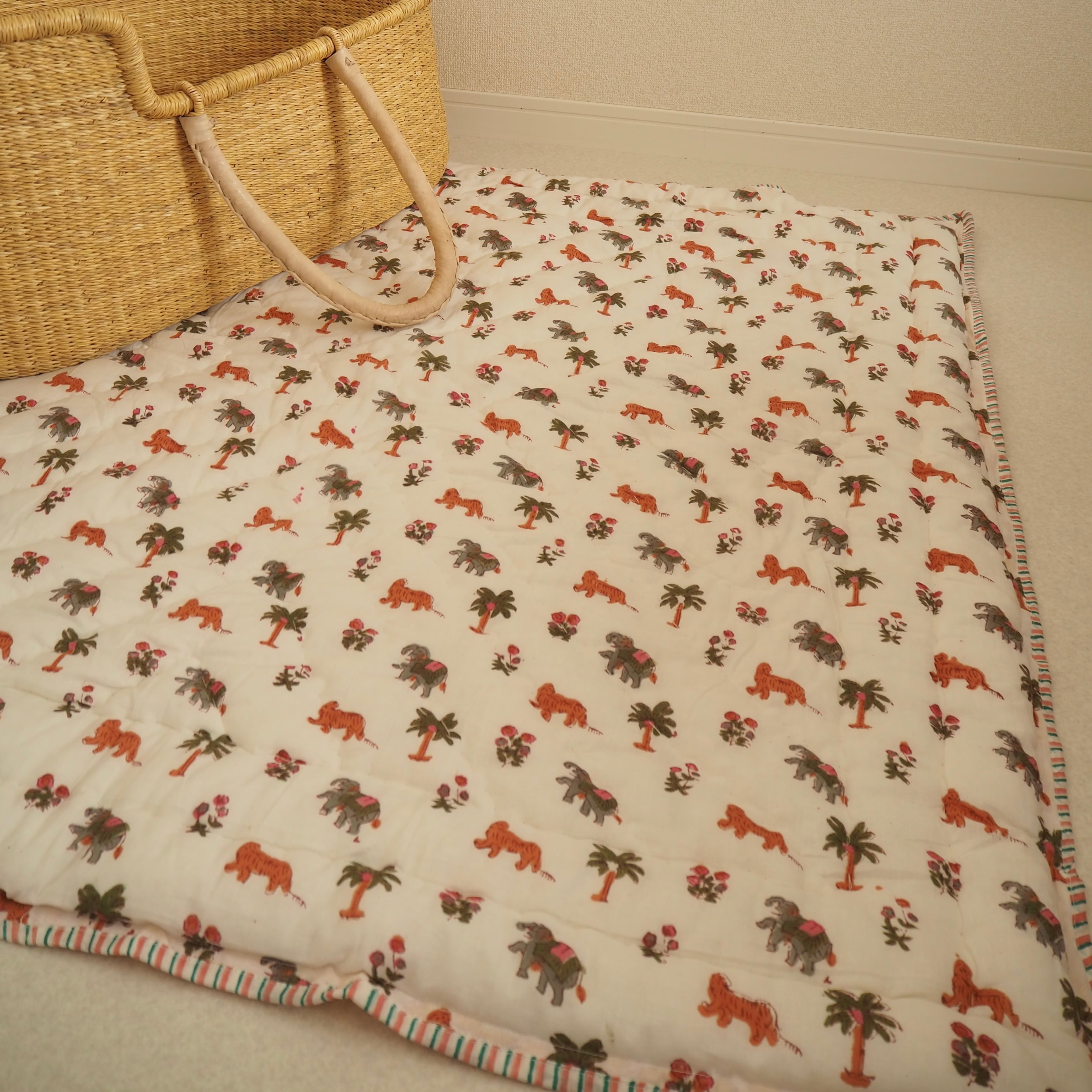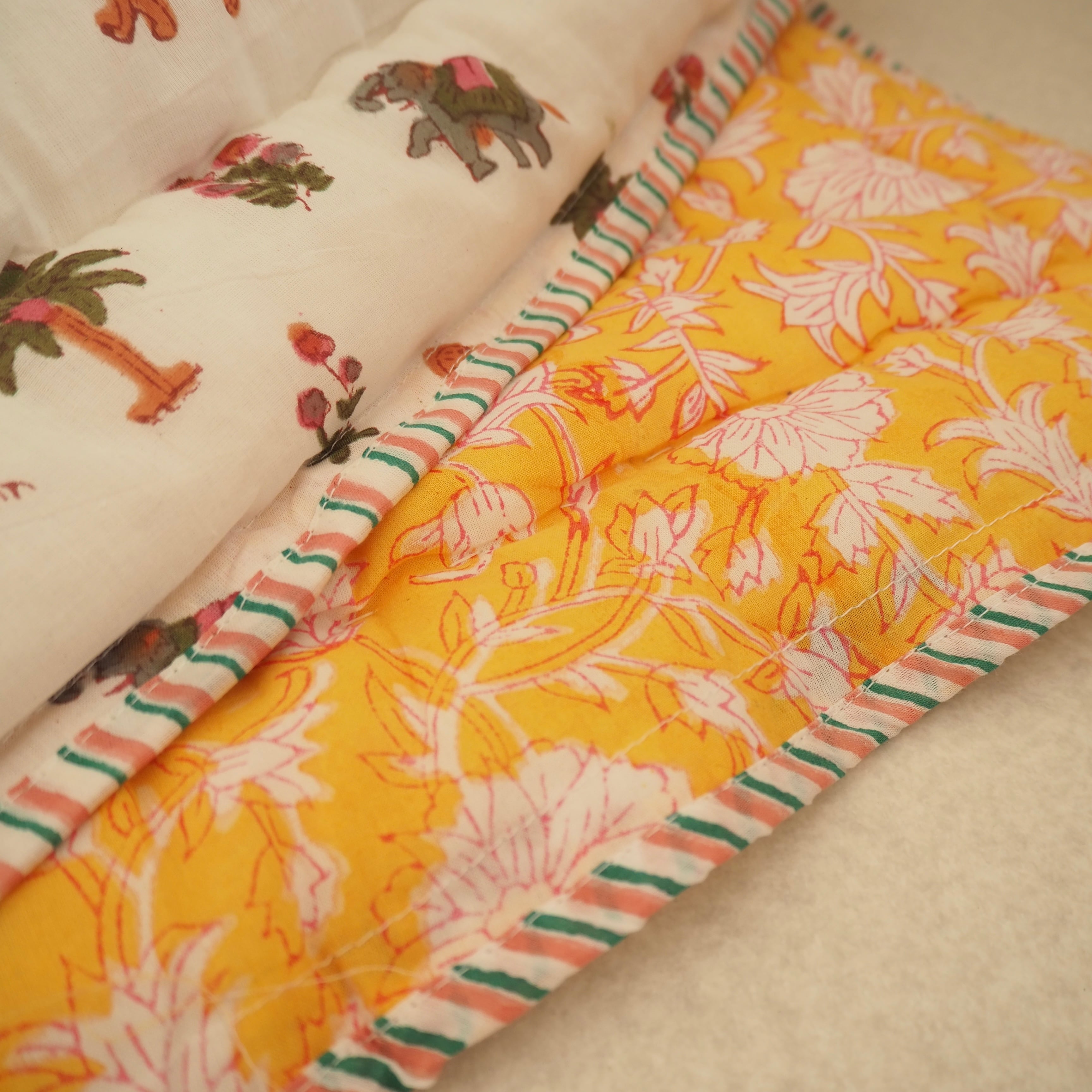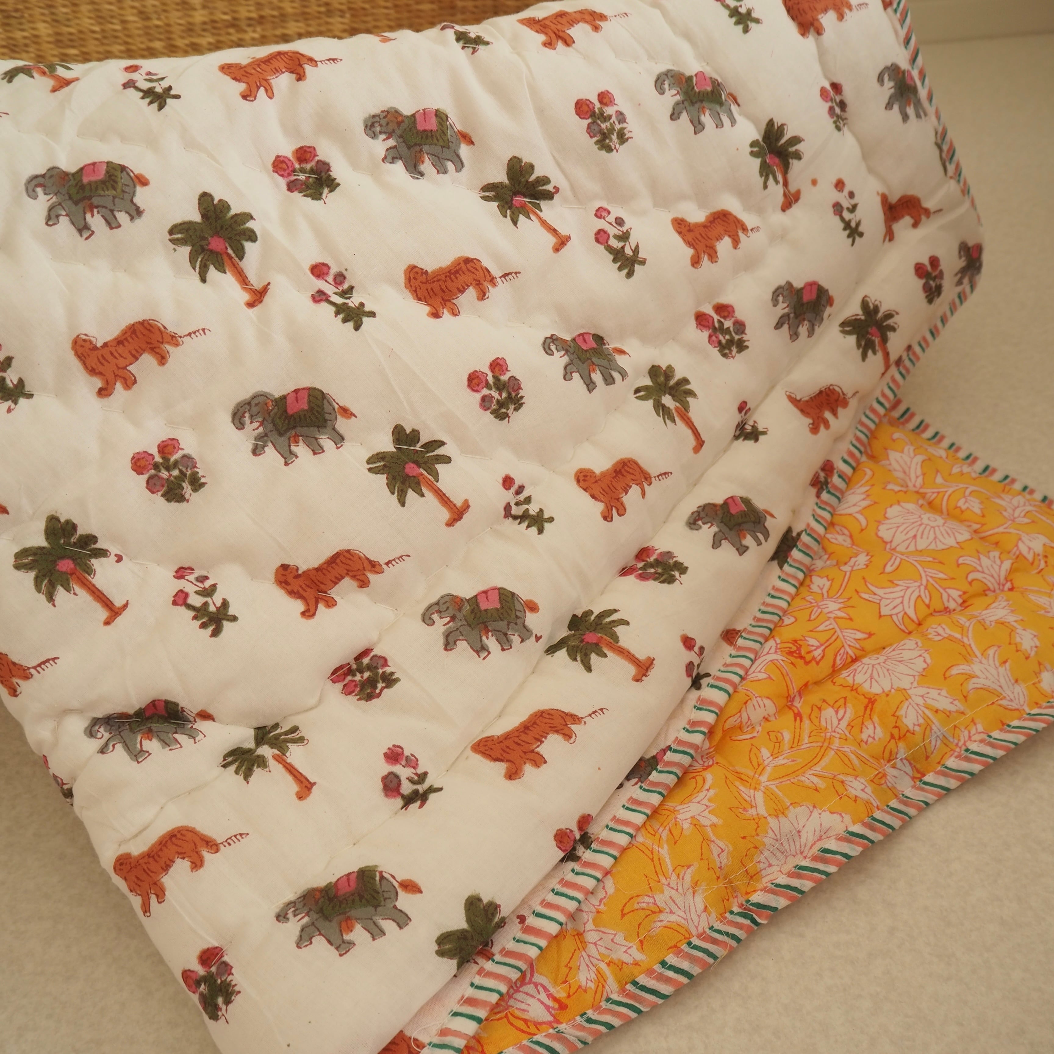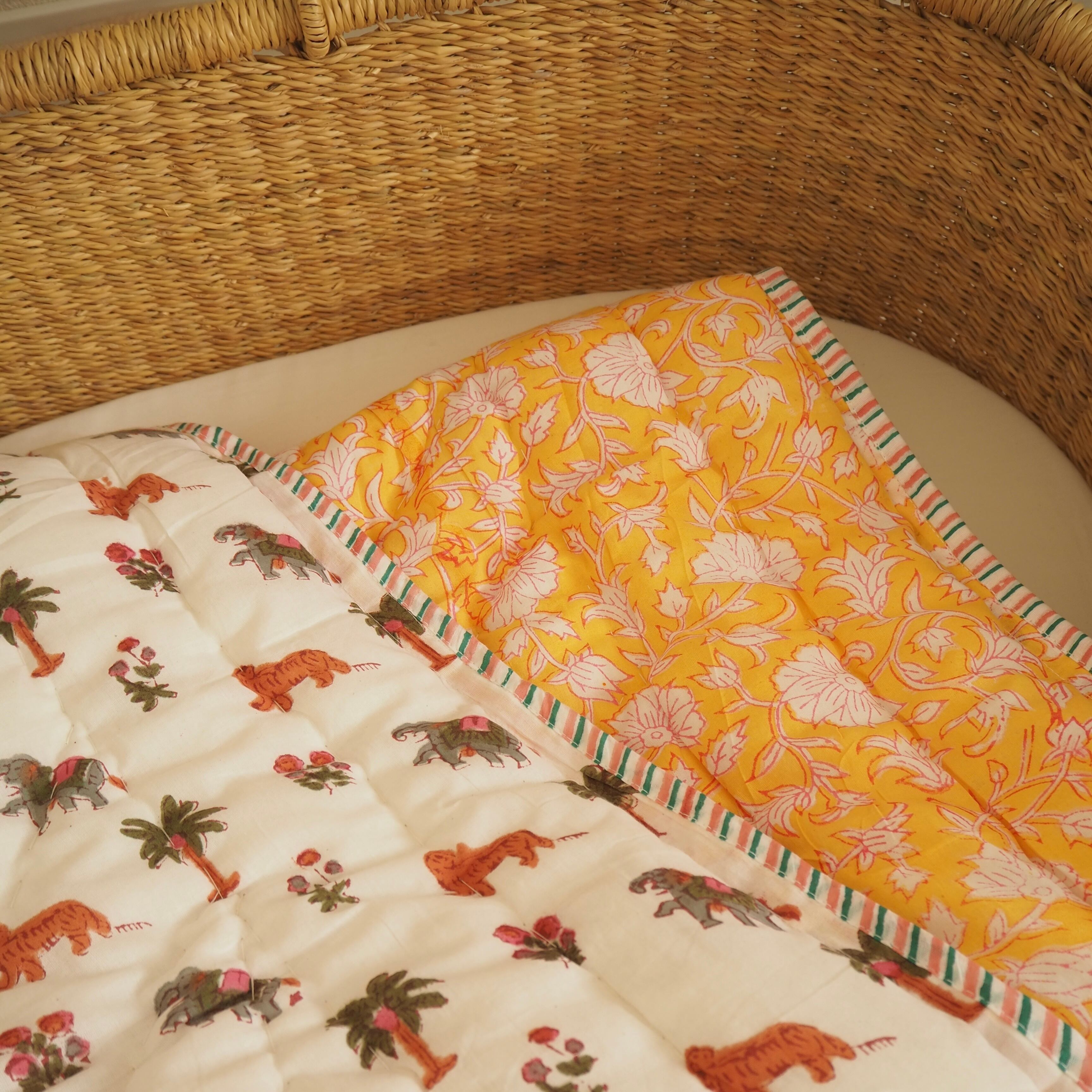 ブロックプリントの街、ジャイプールに行ってきました!店主厳選の生地で作ってもらったベビーキルト。小さな動物柄の生地とイエローに赤い縁取りのフラワー柄が可愛らしい生地をセレクトしました。