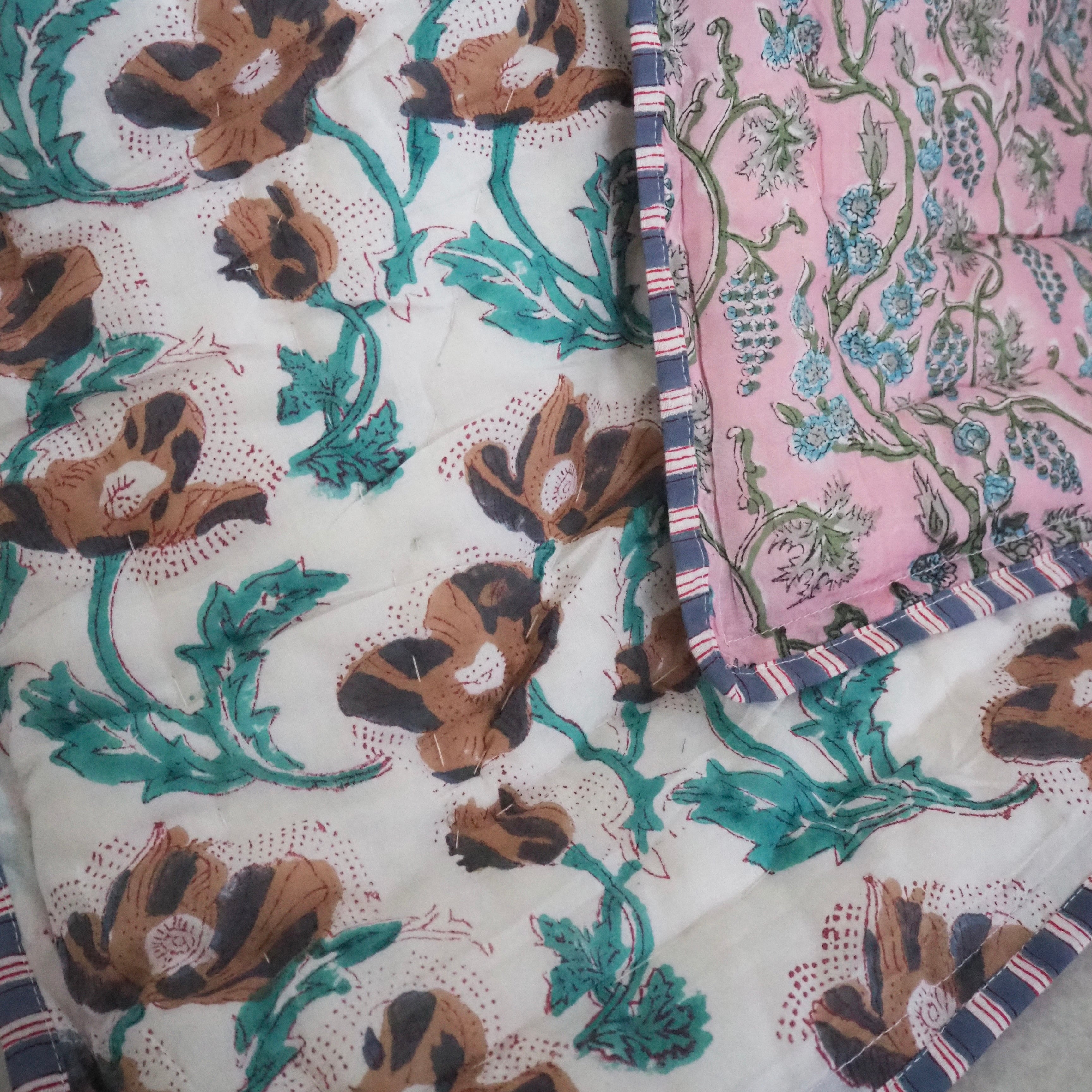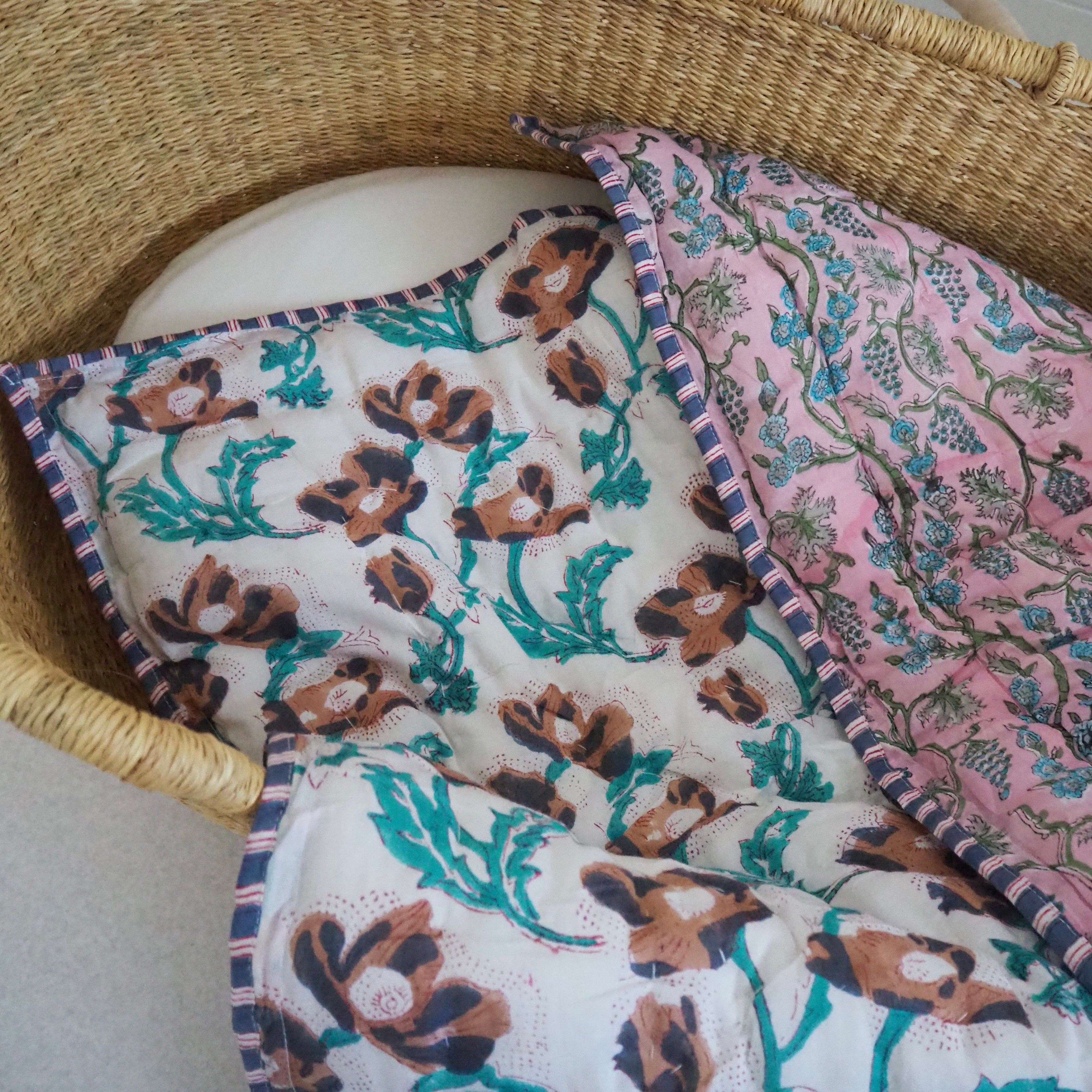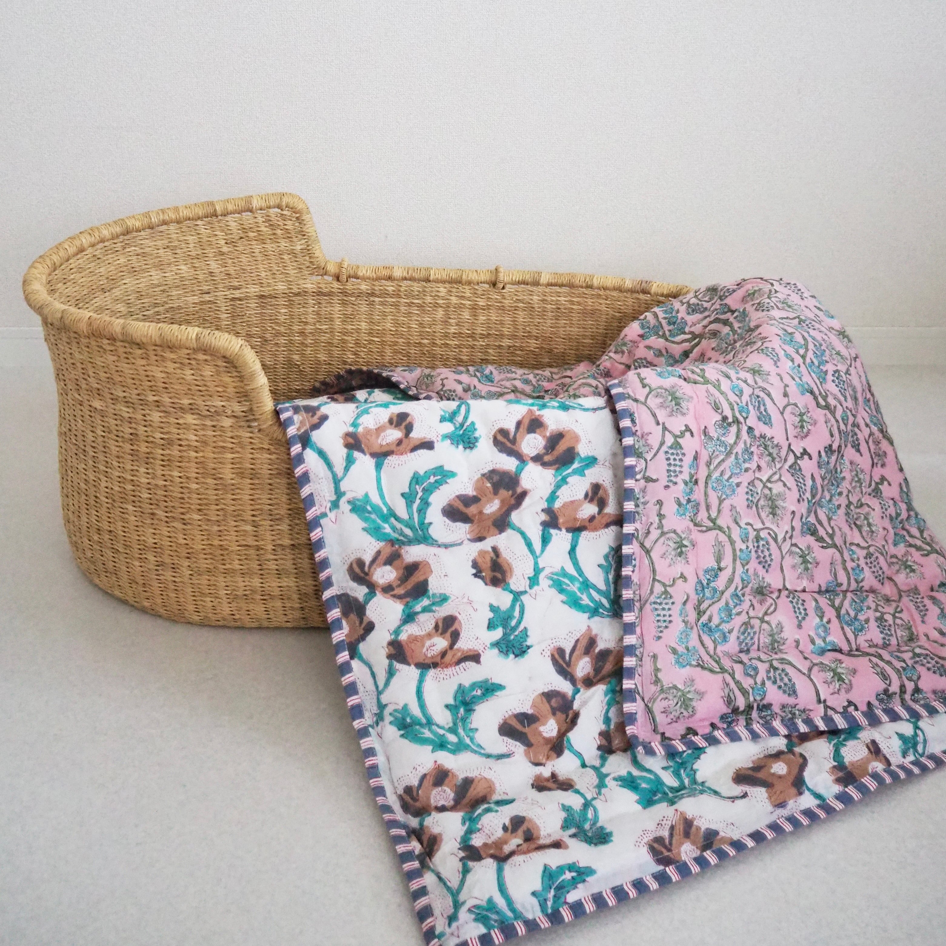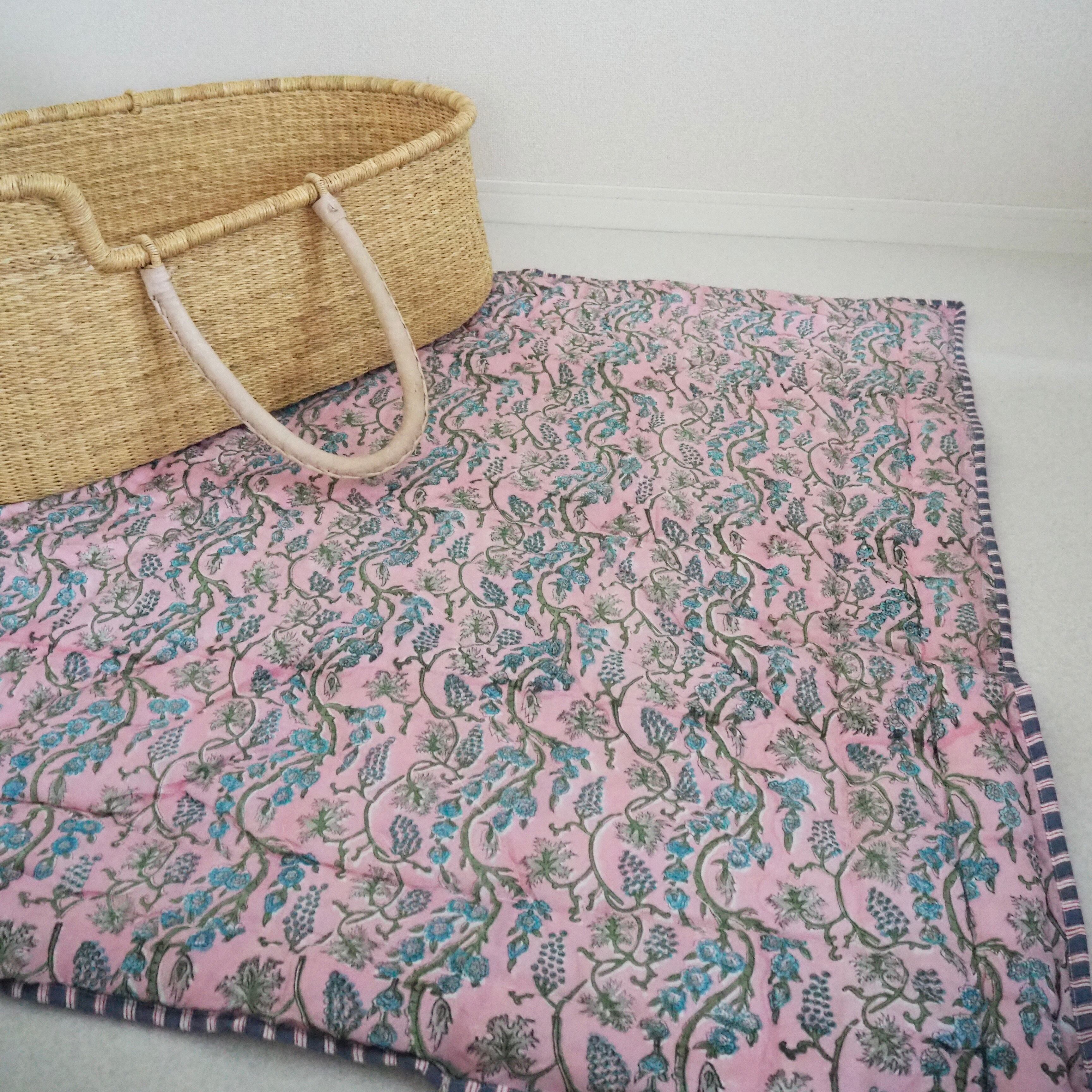 ブロックプリントの街、ジャイプールに行ってきました!店主厳選の生地で作ってもらったベビーキルト。パステルカラーの生地を使用した柔らかい雰囲気のキルトです。