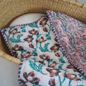 ブロックプリントの生地はインクのずれ、かすれ、とびが見られる場合がございます。また、職人によるハンドメイド商品ため、縫い目のばらつきや、玉止めが見えている箇所があります。インド地方のおおらかな文化による特徴ですので、ご理解ください。