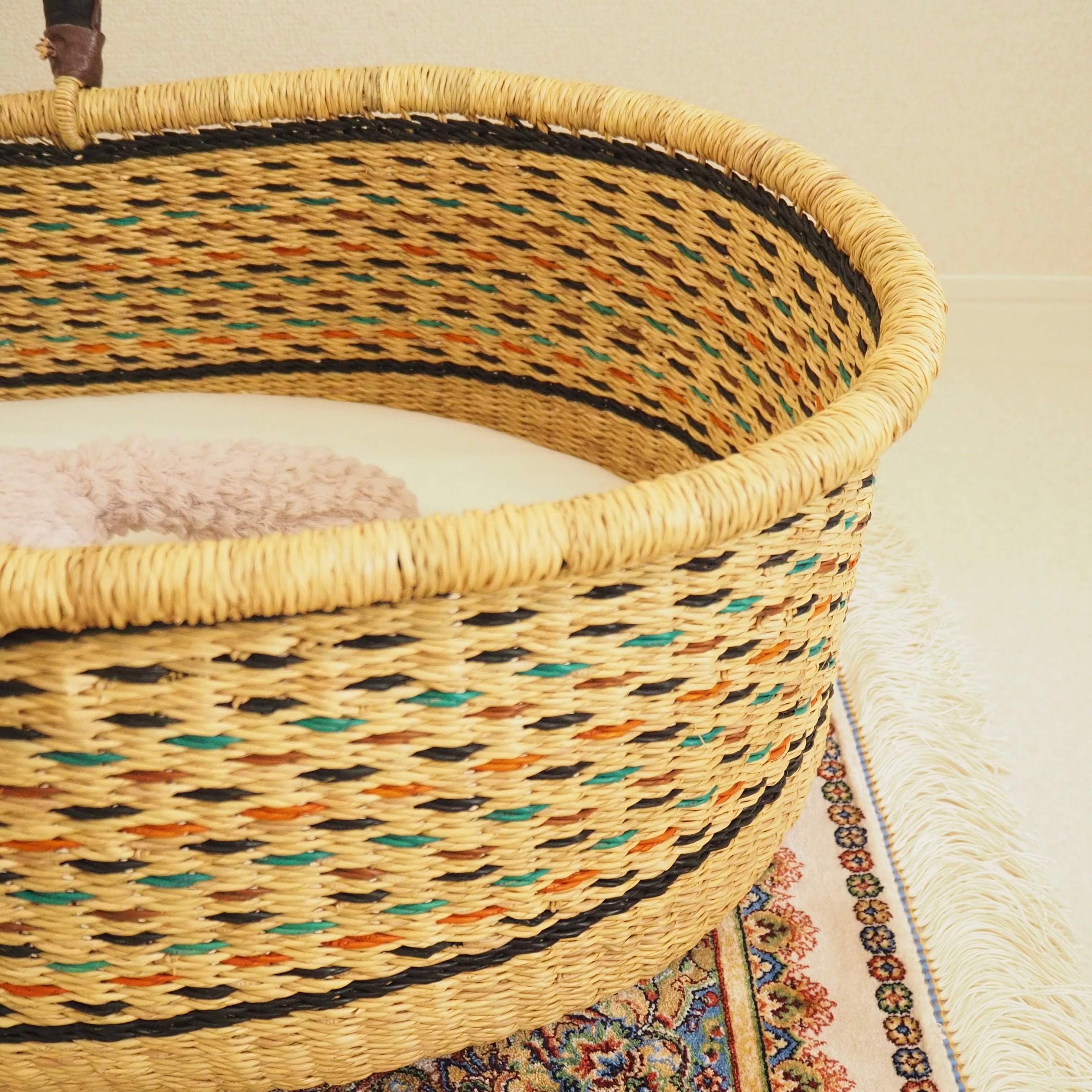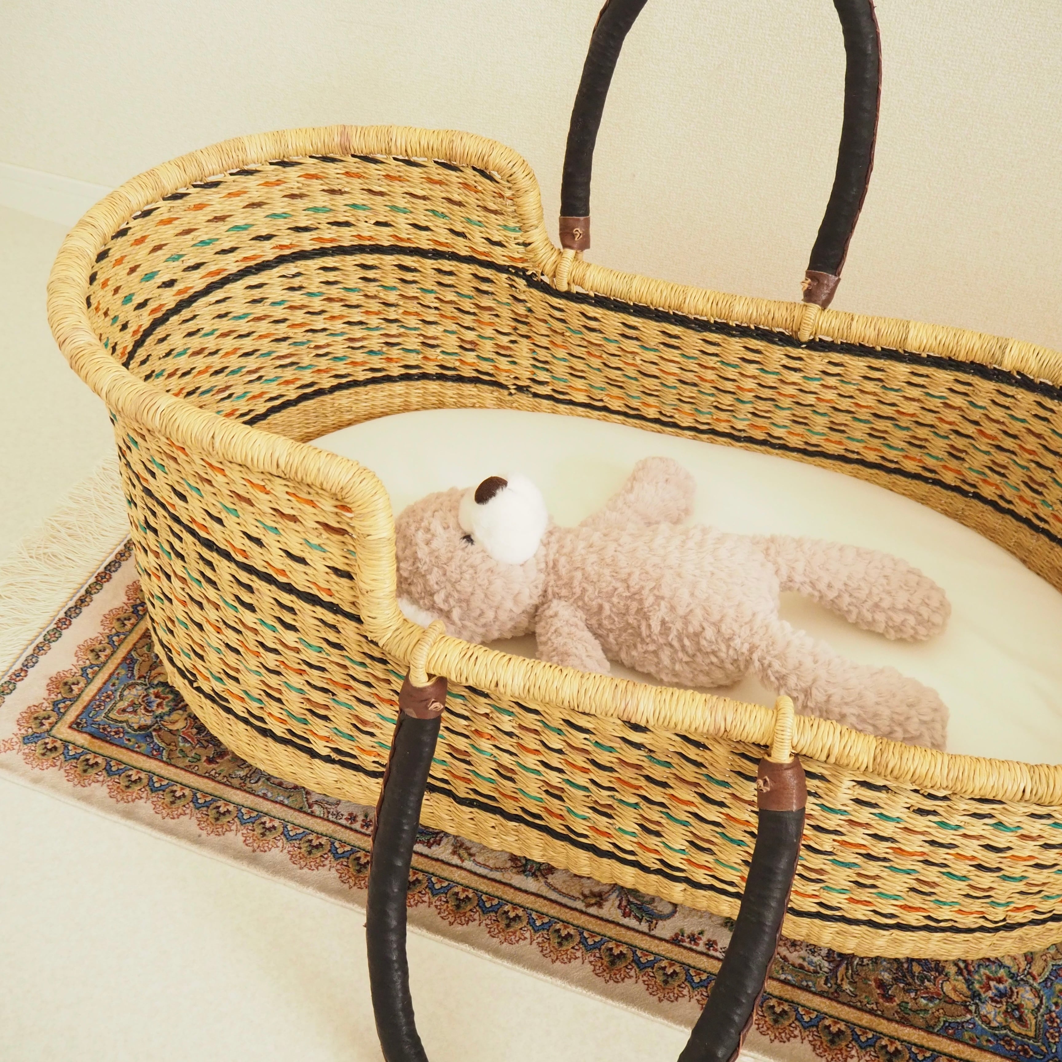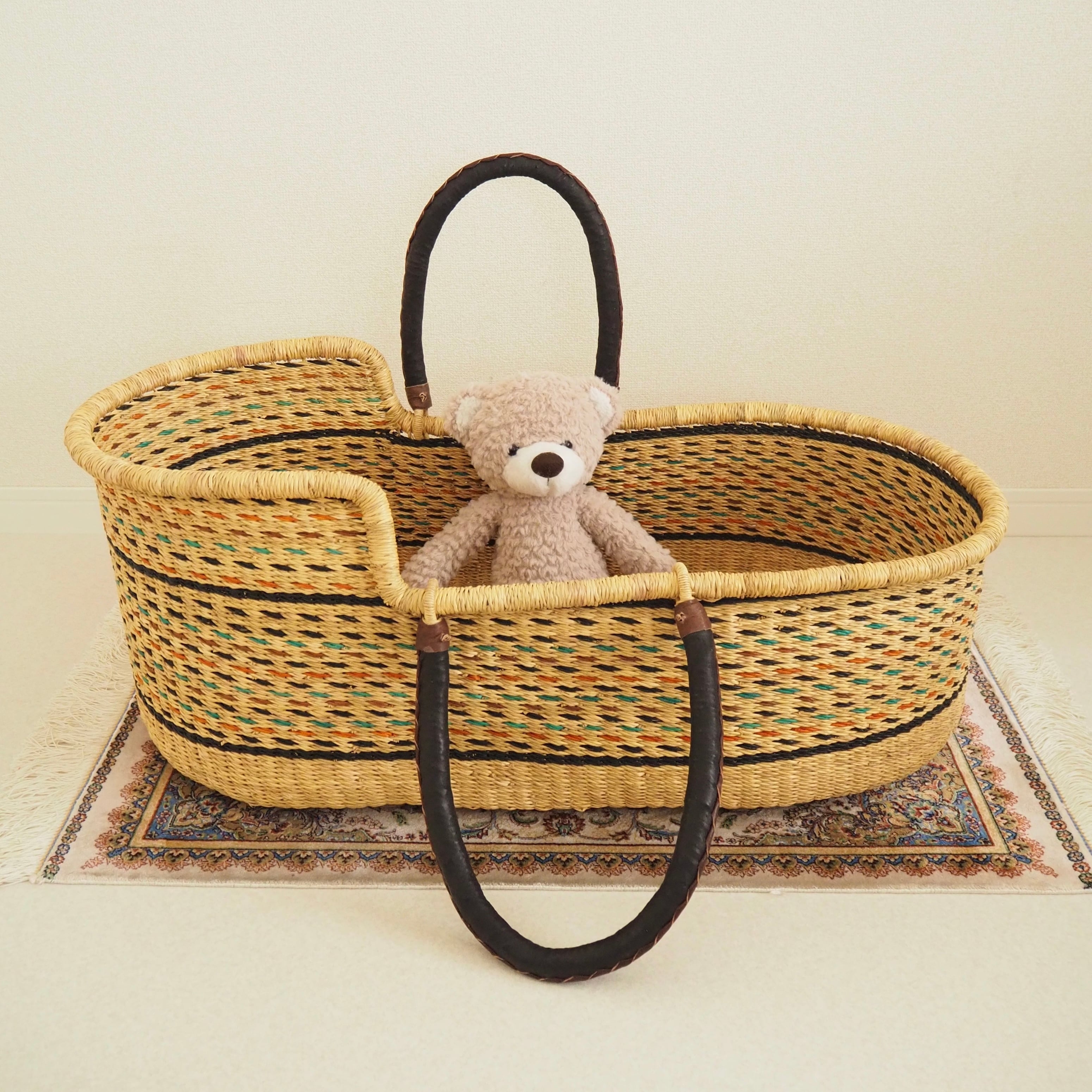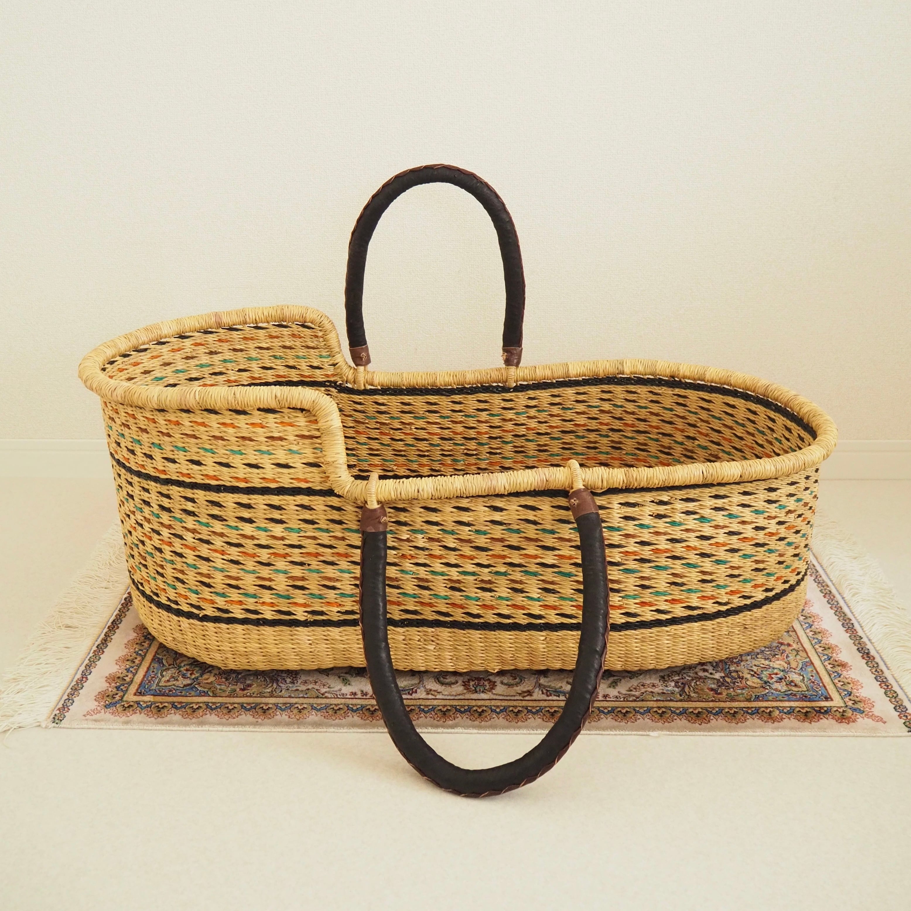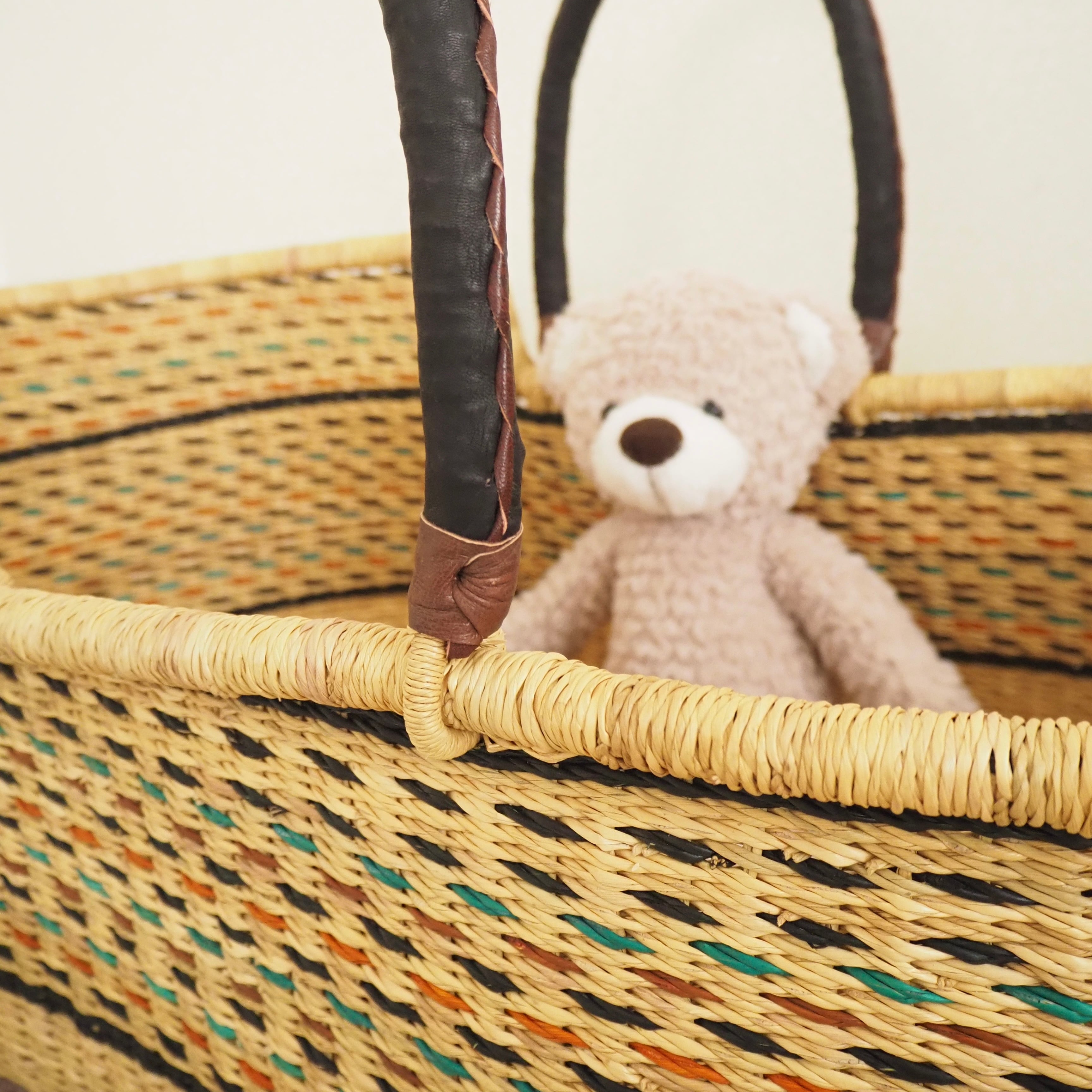 カゴ部分はエレファントグラス、ハンドルは羊の革から出来ています。ガーナの職人が数日かけて、心を込めて作っています。ハンドルのレザーはブラック×ブラウンレザーを使用しています。