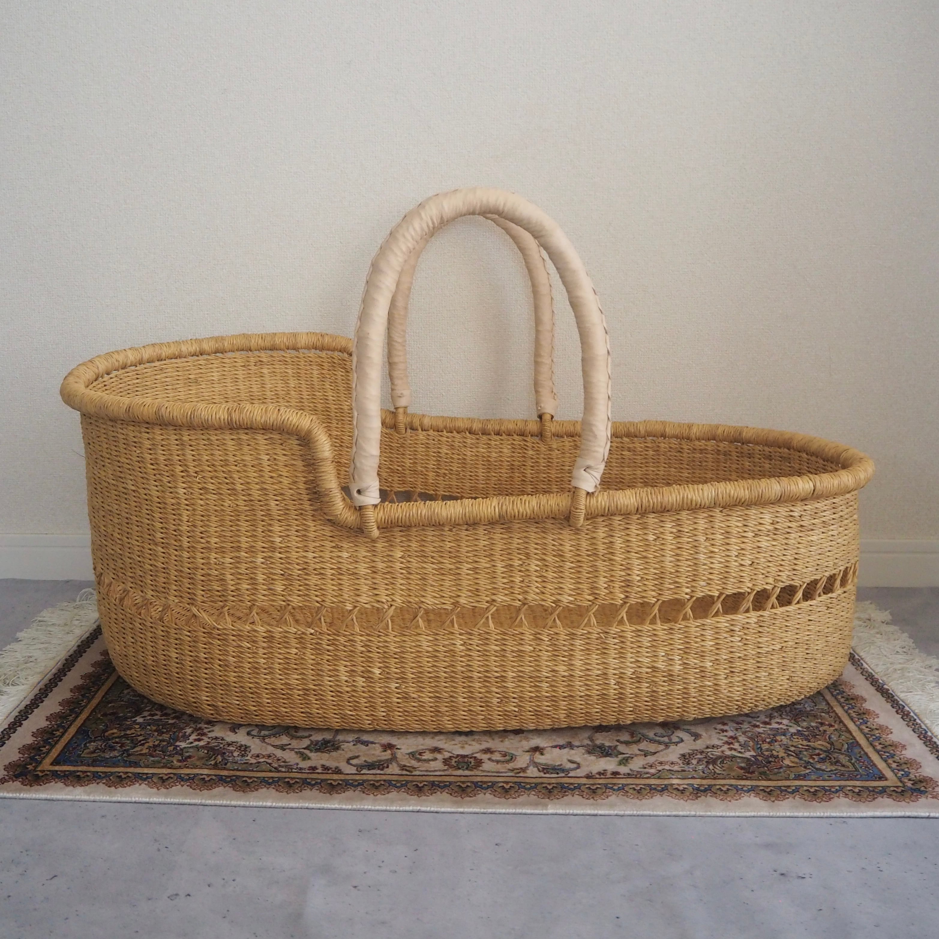 カゴ部分はエレファントグラス、ハンドルは羊の革から出来ています。ガーナの職人が数日かけて、心を込めて作っています。ハンドルはクリームのレザーを使用しています。