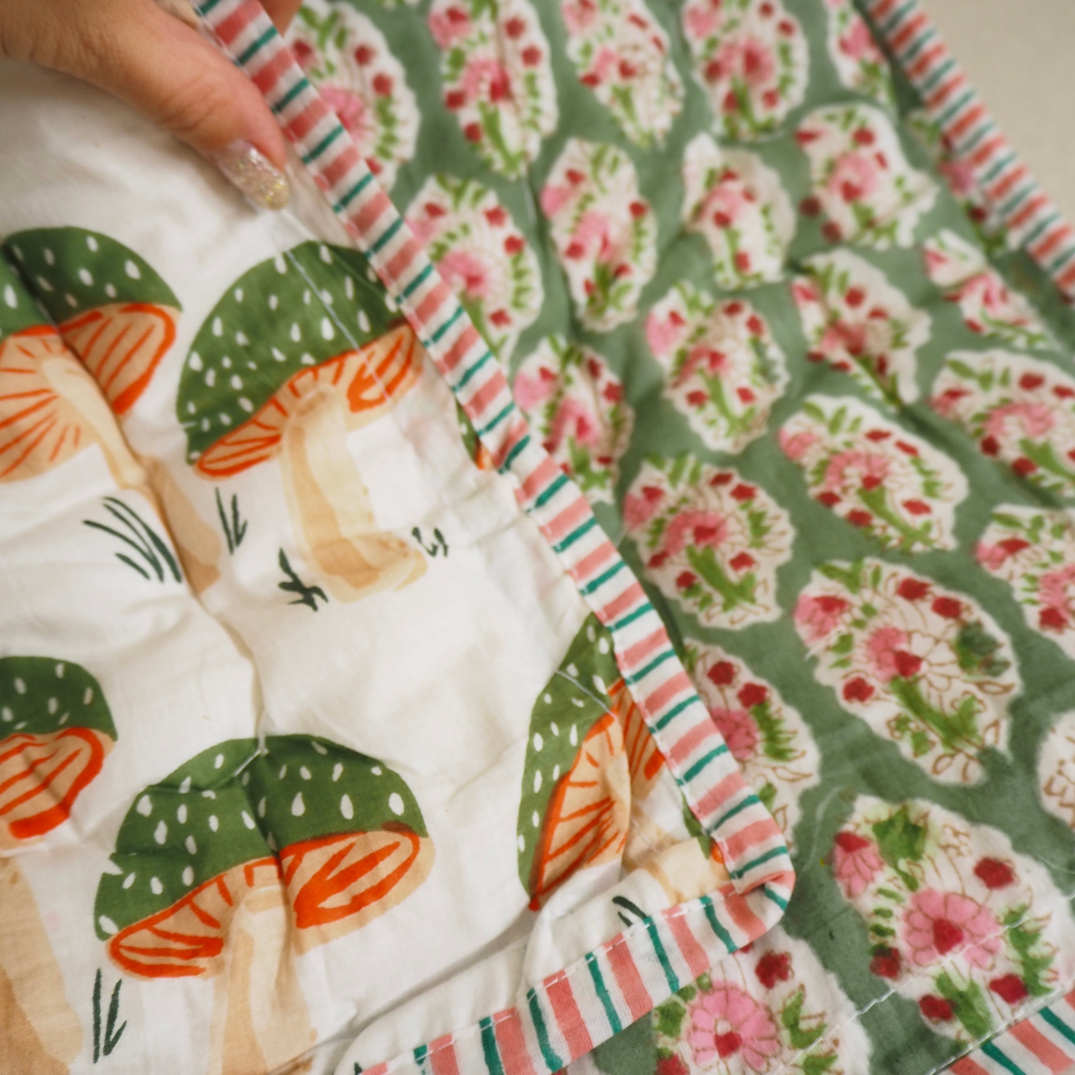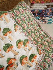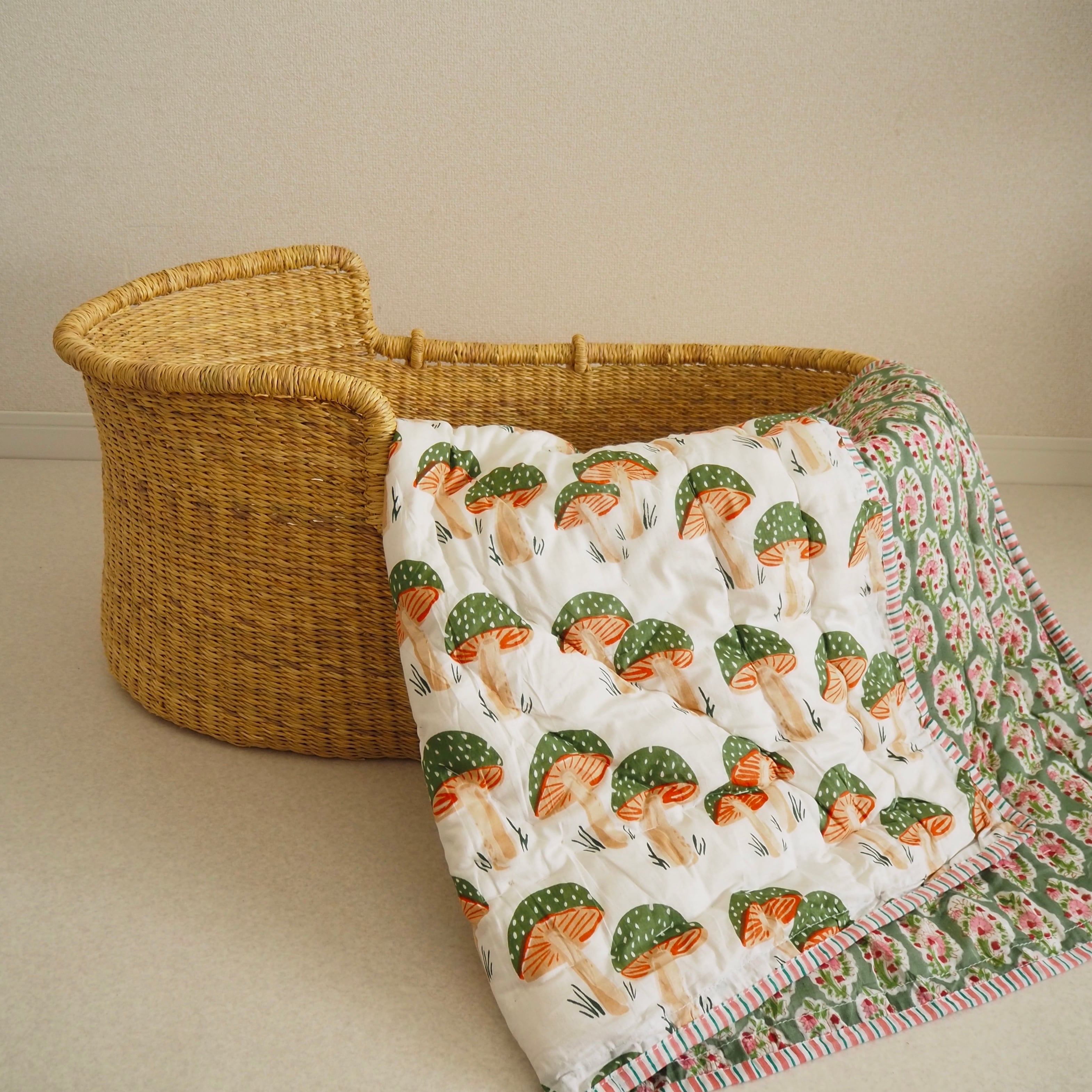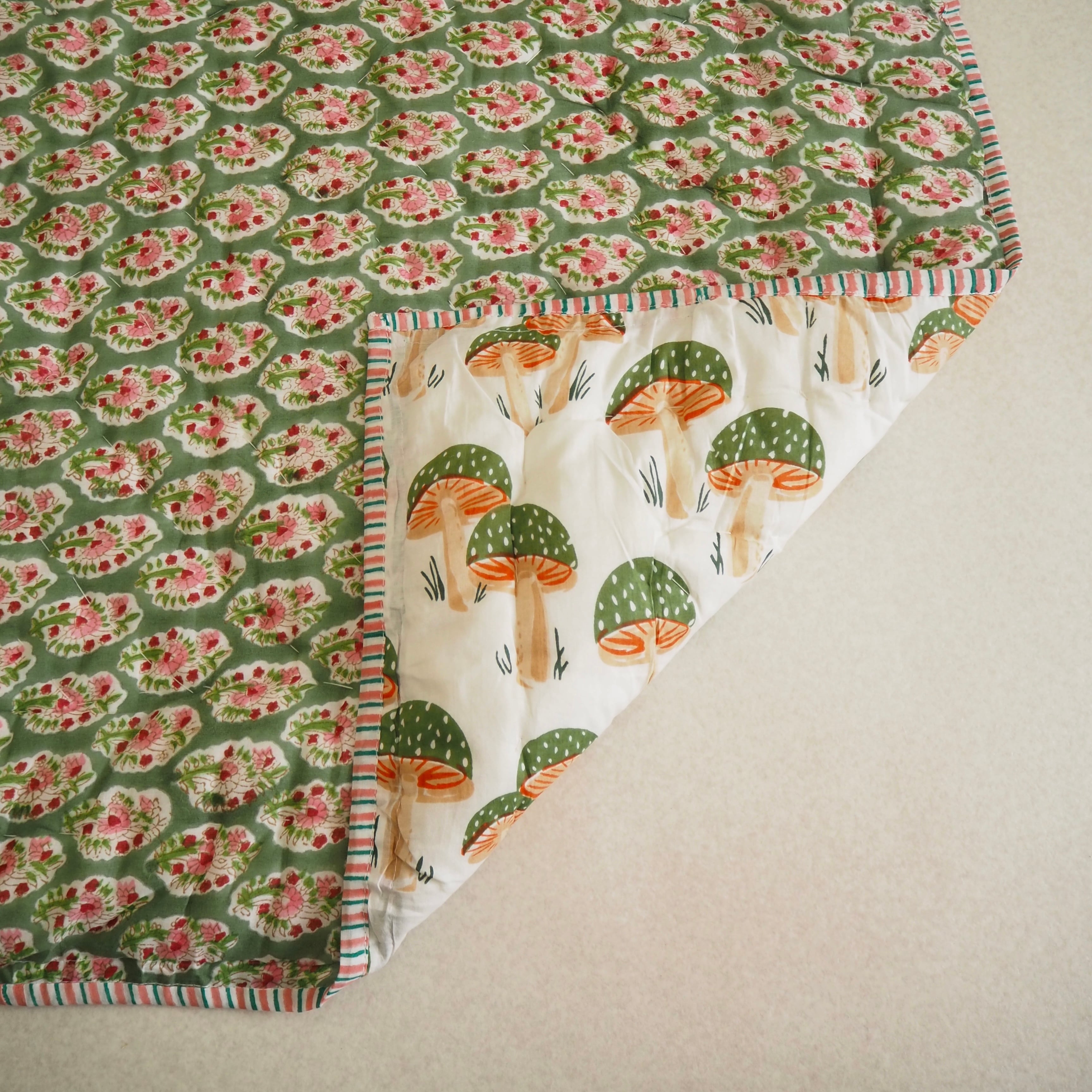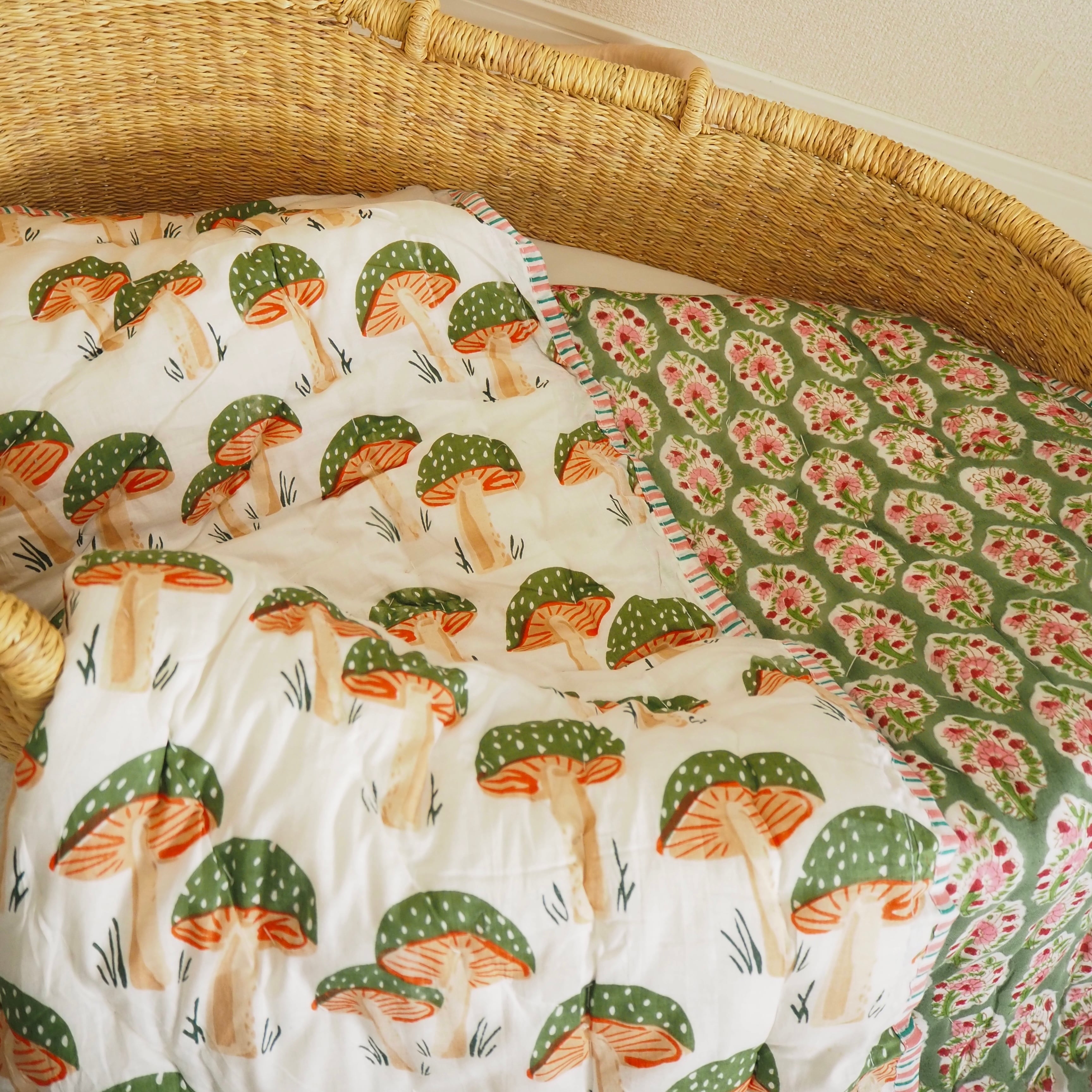 ブロックプリントの街、ジャイプールに行ってきました!店主厳選の生地で作ってもらったベビーキルトです。(店主)待望のきのこ柄の再入荷です!
