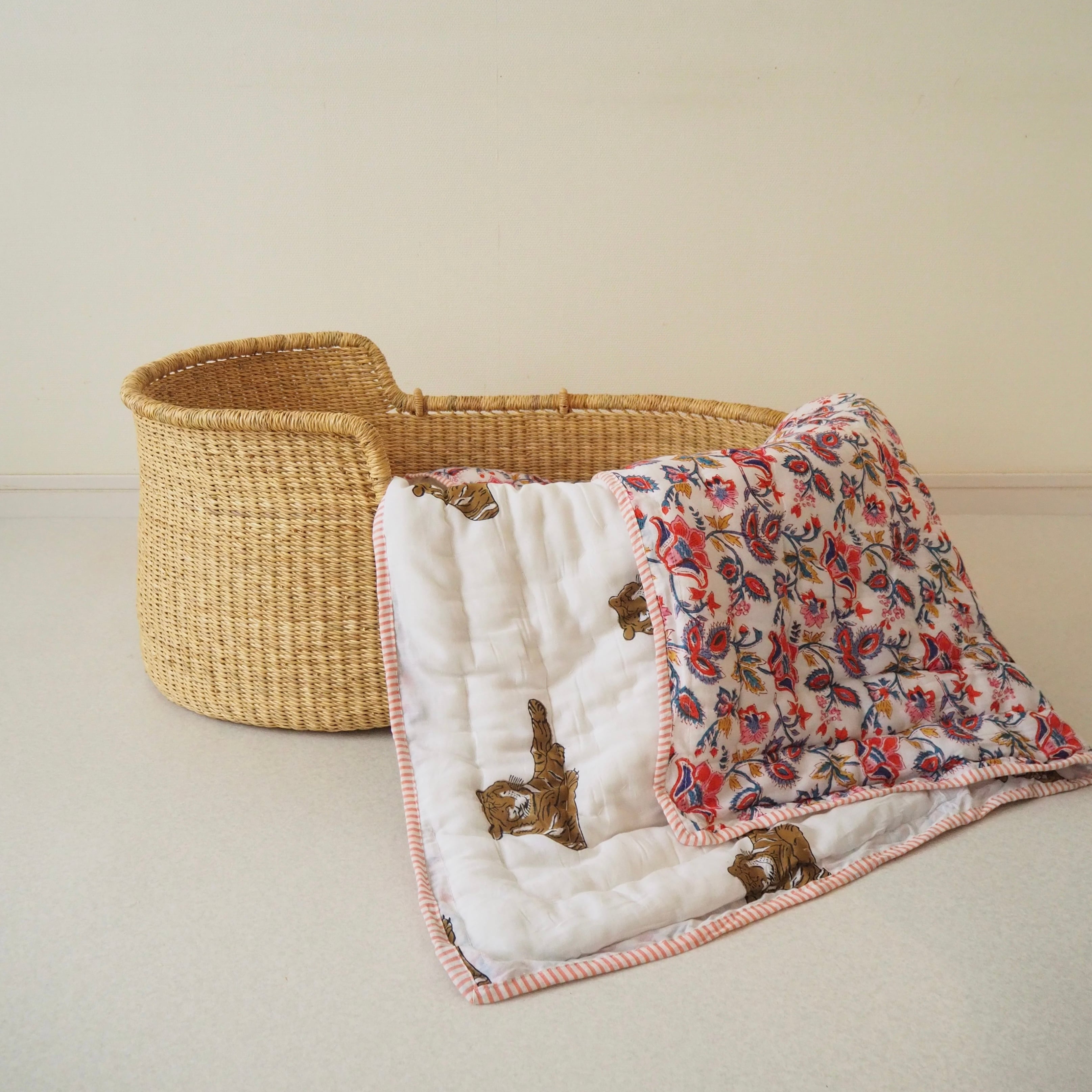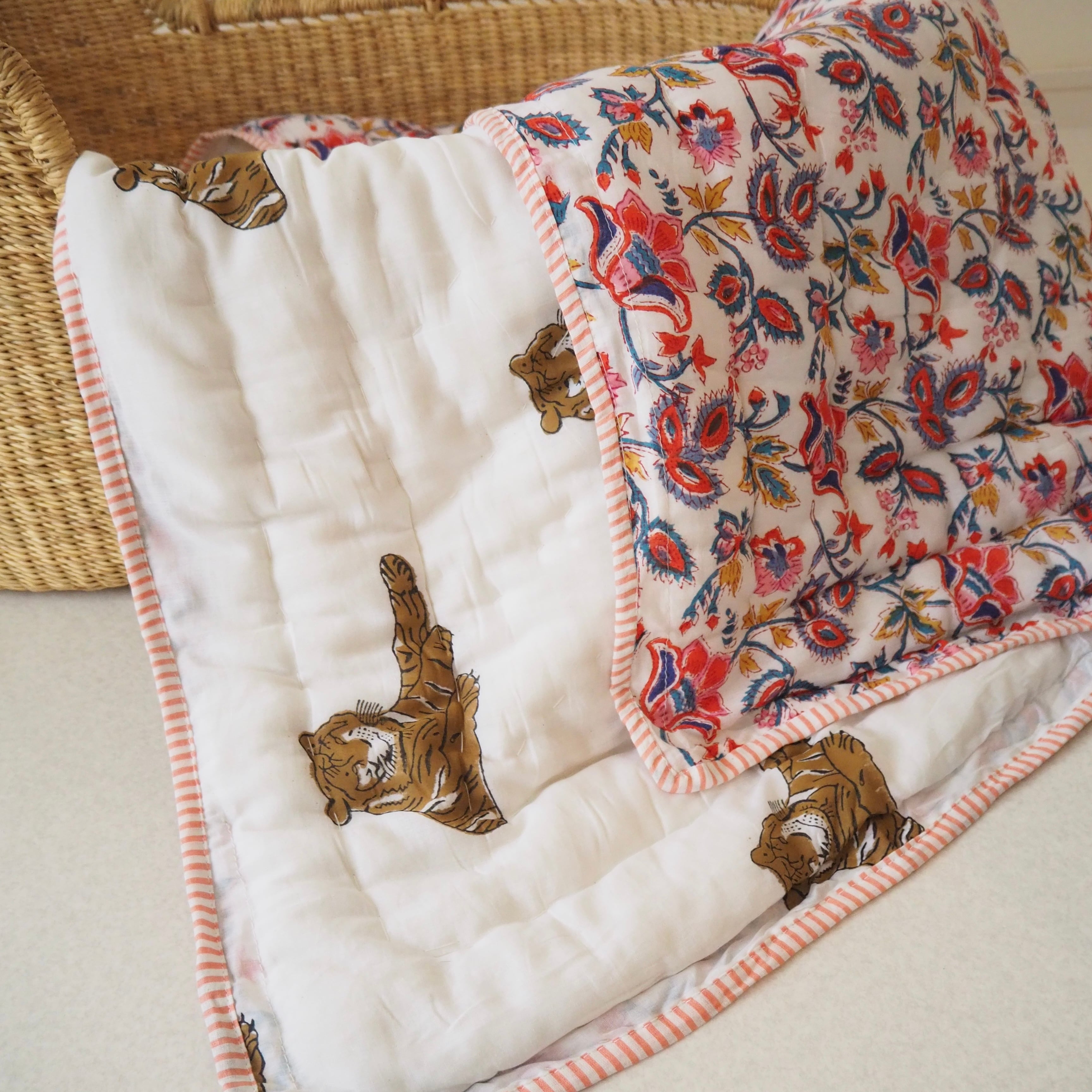 ブロックプリントの街、ジャイプールに行ってきました!店主厳選の生地で作ってもらったベビーキルト。眠そうなタイガーくんとお花畑の組み合わせがとても可愛いデザインです。お花柄の生地を一新し、リニューアルしての登場です!