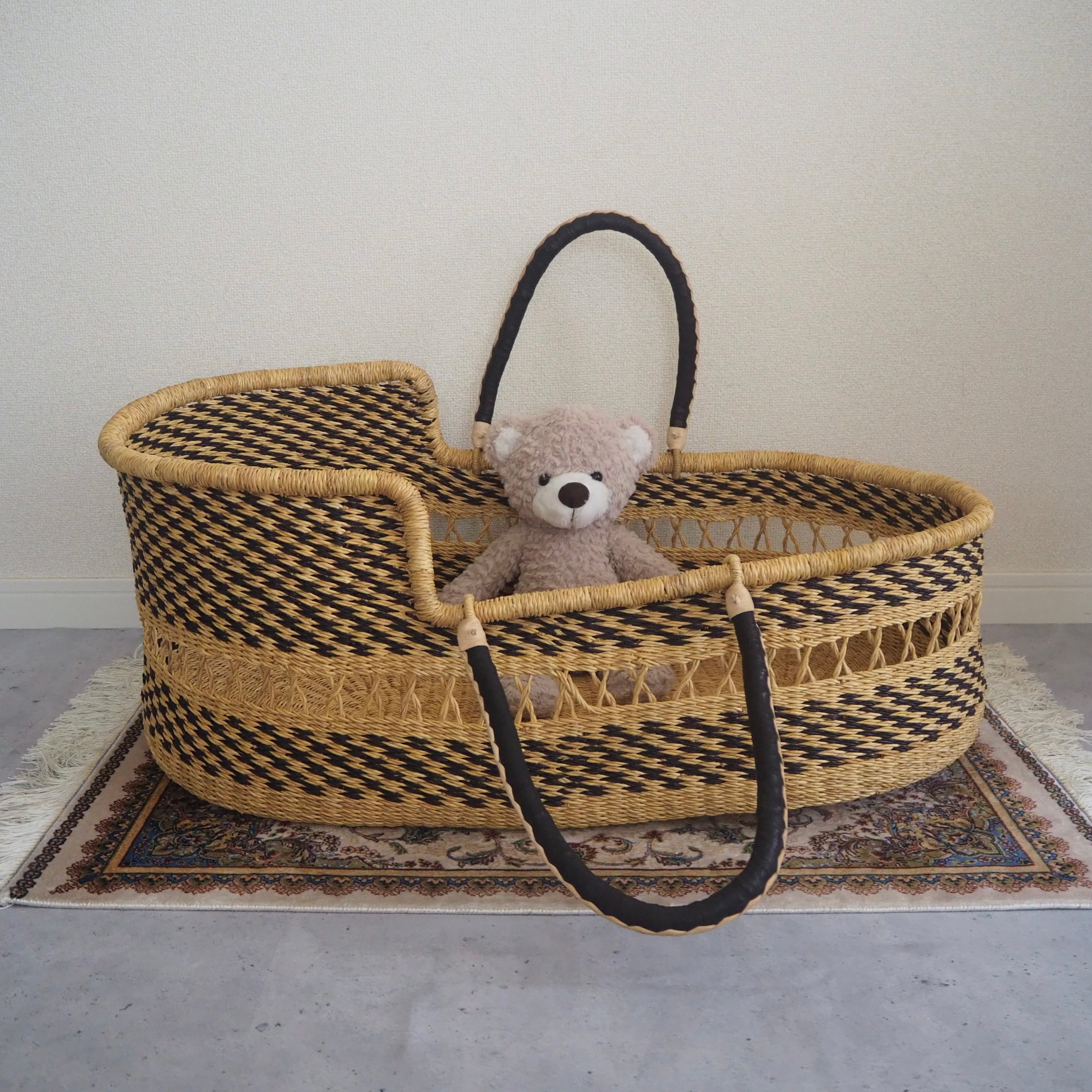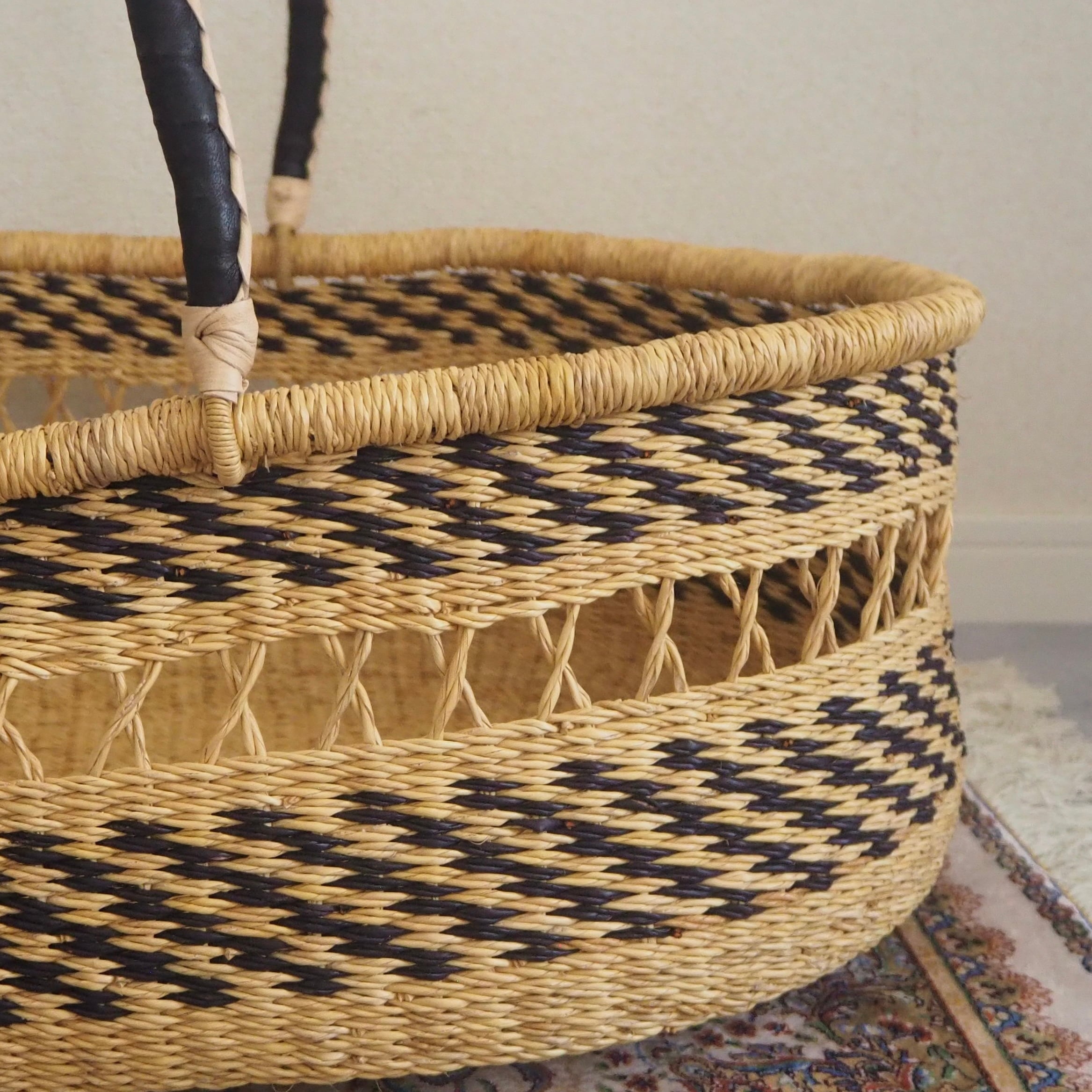 カゴ部分はエレファントグラス、ハンドルは羊の革から出来ています。ガーナの職人が数日かけて、心を込めて作っています。ハンドルはダークブラウンのレザーを使用しています。