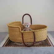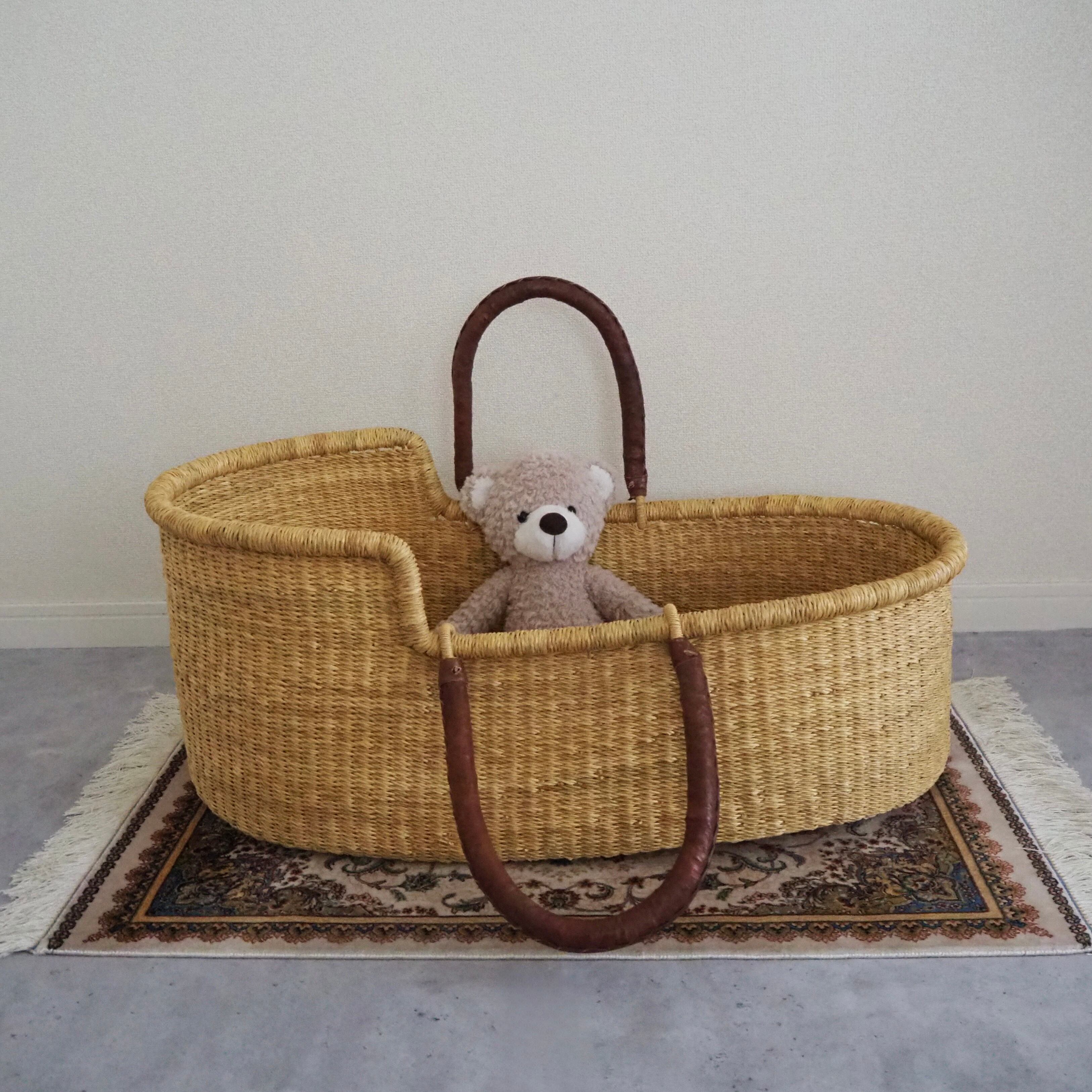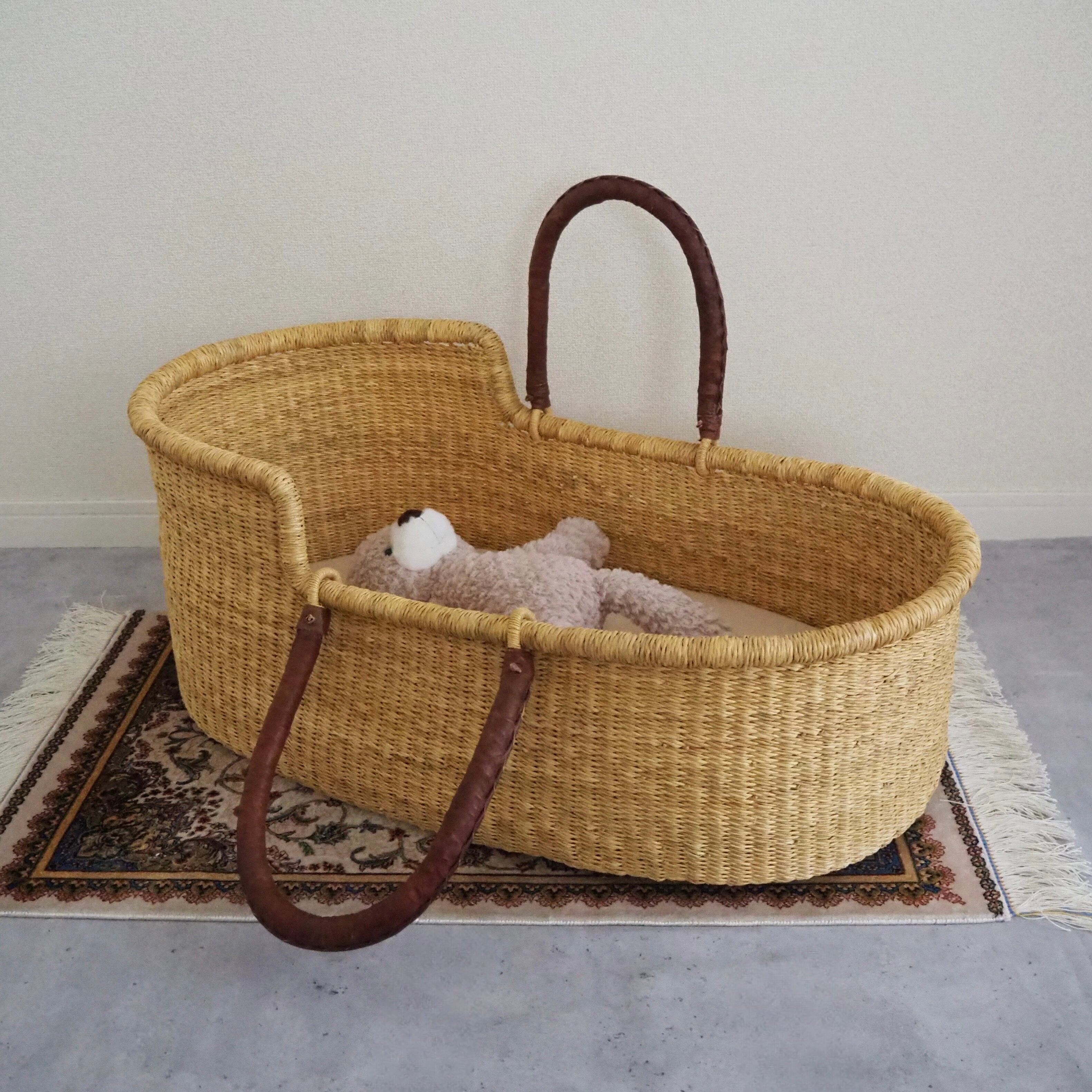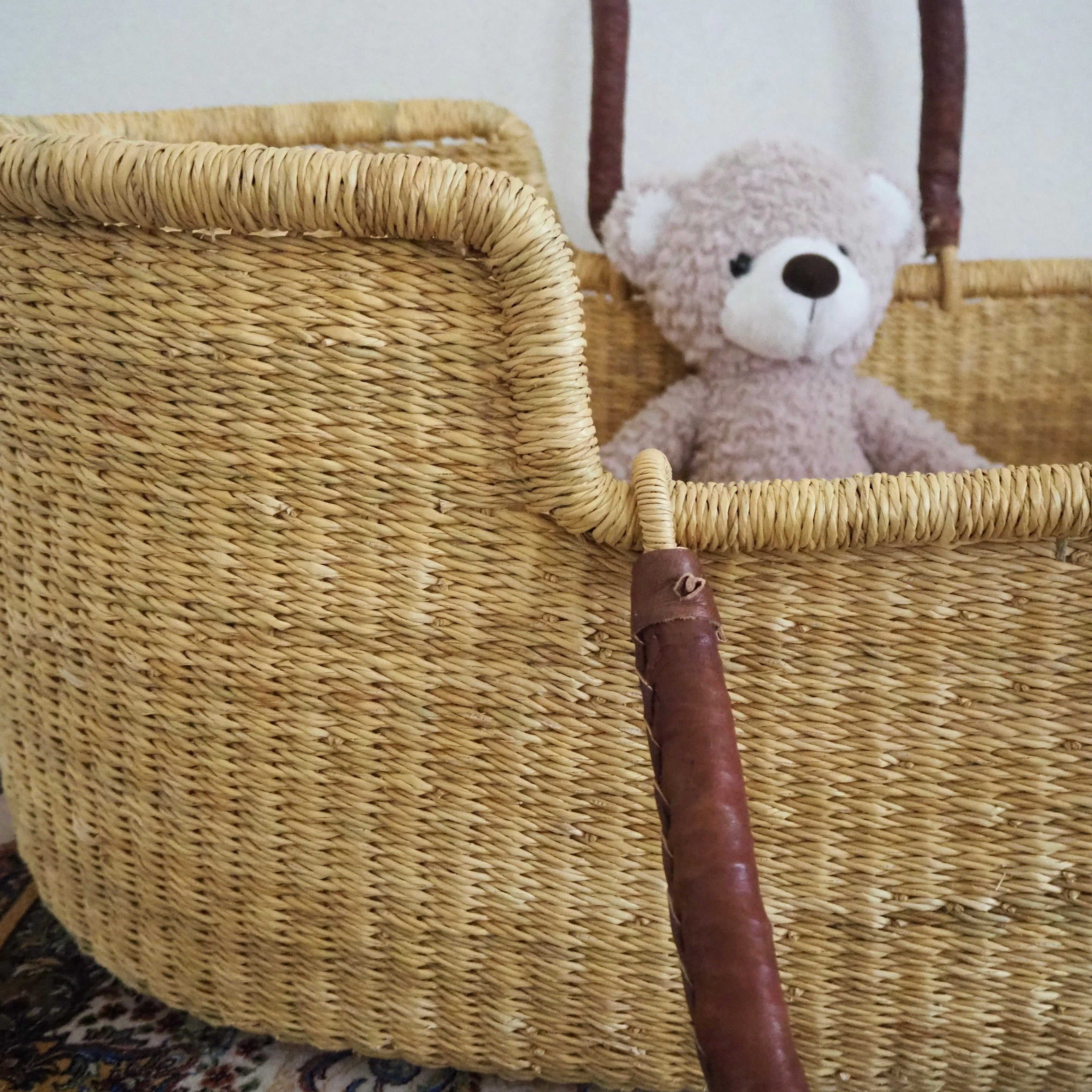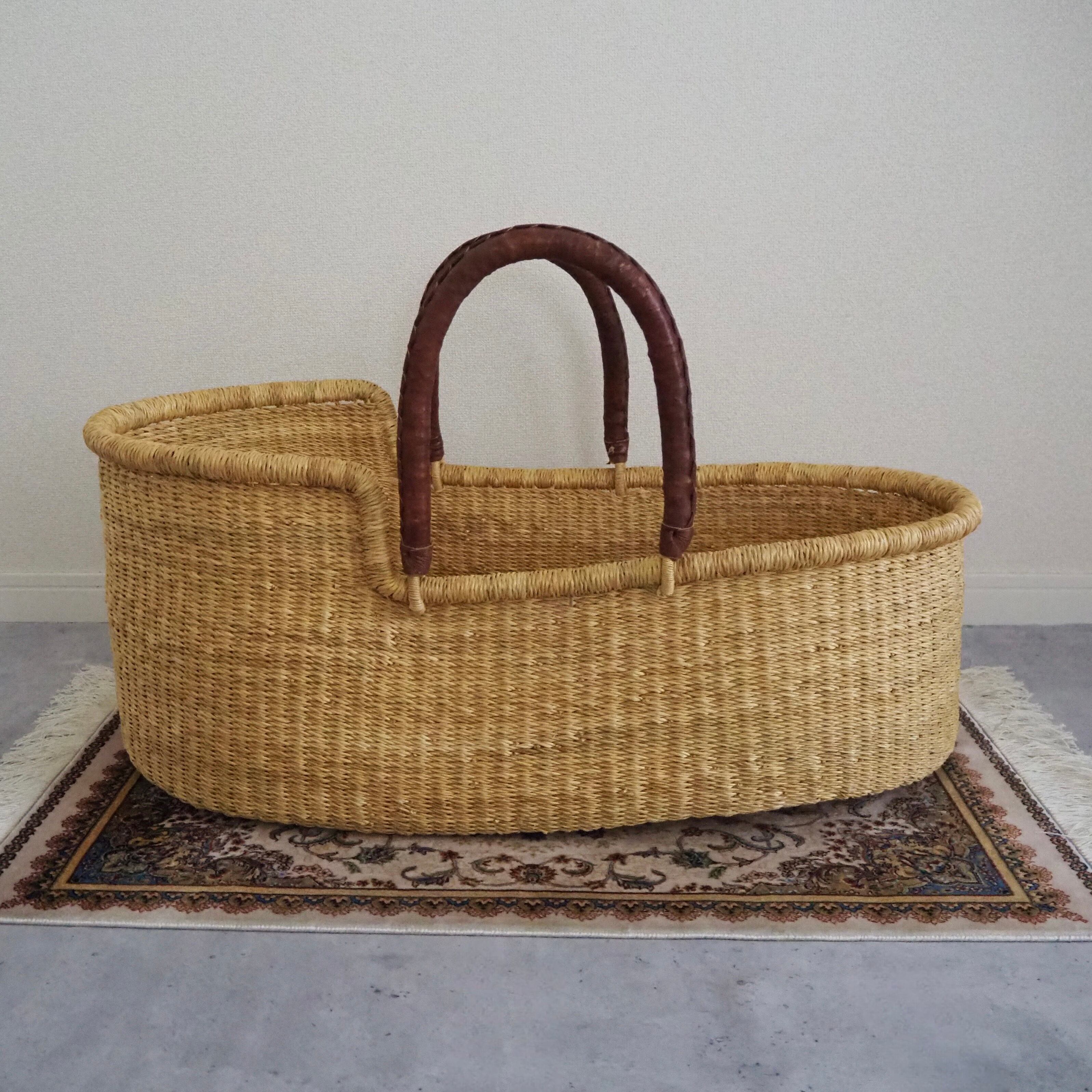 シンプルな無地のクーファンです。カゴ部分はエレファントグラス、ハンドルは羊の革から出来ています。ガーナの職人が数日かけて、心を込めて作っています。ハンドルはブラウンのレザーを使用しています。